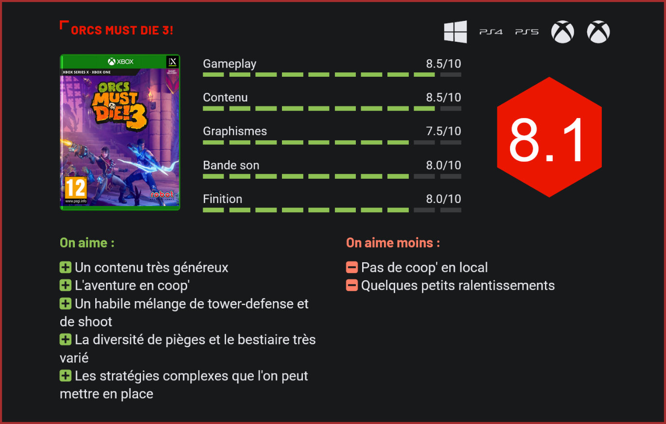 Sorti en exclu temporaire sur Stadia en 2020, Orcs Must Die 3! était passé relativement inaperçu compte tenu du succès très mitigé de la plate-forme de Google. Sa sortie sur PC et consoles le remet sur le devant de la scène. On n’en attendait plus grand chose après le fiasco d’Orcs Must Die Unchained en 2017. La franchise des Orcs Must Die a pourtant réalisé un joli come-back avec ce troisième épisode, sorti en exclu temporaire sur Stadia. Développé par le studio texan Robot Entertainment, qui était né sur les cendres d’Ensemble Studios et avait fait ses premiers pas avec Age of Empires Online, Orcs Must Die! était à l’origine un petit jeu indé exclu au catalogue du bon vieux Xbox Live Arcade. Succès inattendu, le titre a eu droit à plusieurs suites, qui n’ont toutefois jamais rencontré le même succès que l’original. Il n’est pas rare d’être submergé par une armée de créatures. On aurait d’ailleurs pu penser qu’en dix ans, le concept aurait davantage évolué. Si vous aviez joué au tout premier épisode, vous ne serez en ce sens guère surpris par cette suite, étonnamment fidèle à l’esprit du premier volet. On y incarne toujours un guerrier chargé de défendre le cœur d’un donjon des vagues d’ennemis qui s’y ruent. Trolls, orcs et autres dragons vous donneront des sueurs froides. Chaque mission vous propulse dans des décors différents, dont il faudra maîtriser l’architecture. Car ici, les ennemis ne viennent pas d’un seul point mais de plusieurs. Il convient donc d’analyser le tracé pour placer ses pièges, ses troupes et mettre en place un plan de défense. Une même mission compte en général entre 5 et 8 vagues. Entre chacune d’elle, le joueur peut venir renforcer ses défenses en achetant de nouveaux pièges et en en changeant d’autres pour s’adapter aux différentes menaces. Car bien entendu, tous les ennemis ne sont pas fragiles aux mêmes types d’attaques. Préparez-vous à massacrer de l’orc! La force d’Orcs Must Die 3!, c’est son incroyable diversité, tant au niveau des pièges proposés que du bestiaire ou de ses environnements. On a jamais l’impression de rejouer deux fois la même mission… Tout au cours de l’aventure, vous débloquerez aussi de nouveaux pièges et pourrez acheter des améliorations pour les pièges déjà débloqués. Pad en main, les sensations sont également là. Durant les vagues, il faudra être très actif : se déplacer au bon endroit pour venir renforcer une défense sur le point de céder, se replier vers une position stratégique ou simplement passer d’un point d’entrée à l’autre pour aider ses troupes. Entre les vagues, le joueur devra renforcer ses défenses en venant ajouter des archers sur une tour, en venant placer des pièges en amont et en tentant surtout d’imaginer des combinaisons meurtrières entre les différents pièges. Orcs Must Die 3! est un très habile mélange d’action explosive et de stratégie. A vous de faire en sorte d’éviter d’être submergé. Le titre dévoile tout son potentiel en coop. Malheureusement, vous ne pourrez y jouer à plusieurs qu’en ligne. Pas de coop’ locale. Ce qui réduit déjà pas mal le champ des possibilités malheureusement. On notera au passage que la communauté semble malheureusement assez réduite et qu’il n’est pas évident de trouver des parties… La bonne nouvelle, c’est que côté contenu, il y a de quoi faire entre la campagne principale, qui vous tiendra en haleine entre 6 et 12 heures selon le mode de difficulté, une seconde campagne de 5 missions à débloquer, un mode survie, un mode défis hebdomadaires et la coop en ligne. Le contenu est plutôt généreux. D’autant plus qu’il est possible d’incarner différents personnages qui ont tous leurs particularités. Arc à flèche, tromblon, arbalète, épée, sceptre, à vous de choisir l’arme et le style de jeu qui vous plait le plus! Chaque héros a son arme de prédilection. Orcs Must Die 3! est clairement l’un des mélanges les plus aboutis de tower-defense et de jeu d’action. S’il n’introduit finalement que peu de nouveautés par rapport à ses ancêtres, le titre propose un contenu copieux et se révèle particulièrement fun à jouer à plusieurs. Il y a toujours plusieurs approches possibles. Et s’il faudra parfois recommencer plusieurs fois une mission pour la terminer, le jeu ne se révèle pas trop frustrant dans sa difficulté. Côté réalisation, Orcs Must Die 3! est également très solide avec ses graphismes colorés, sa direction artistique cartoonesque et ses jolis effets visuels. Ce n’est pas une claque absolue, mais le titre est dans l’ensemble très agréable à regarder. La bande son n’est pas en reste avec d’excellents doublages et des musiques d’ambiance efficaces. On regrette en revanche que la finition ne soit pas irréprochable. Il n’est pas rare de faire face à quelques petits ralentissements lorsque l’écran est très chargé, même sur les consoles next-gen… Pour 29,99€, Orcs Must Die 3! n’en reste pas moins une très belle surprise. Conclusion Proposé durant près d’un an en exclu sur Stadia, Orcs Must Die 3! est désormais également disponible sur PC et consoles. Le mélange de tower defense et de jeu d’action coopératif de Robot Entertainment remet brillamment au goût du jour le concept délirant de la série. Aux côtés de ses amis, le joueur devra ici défendre le coeur de son donjon en plaçant ses troupes sur le champ de bataille et en glissant des pièges tout au long du parcours des forces adverses. Orcs Must Die 3! n’est toutefois pas qu’un simple tower defense puisque le joueur prend part activement au combat. Intense, fun et complètement délirant, Orcs Must Die 3! est une très agréable surprise. Proposé une trentaine d’euros, le titre offre un contenu solide avec deux campagnes jouables en solo ou en coop, un mode survie et u