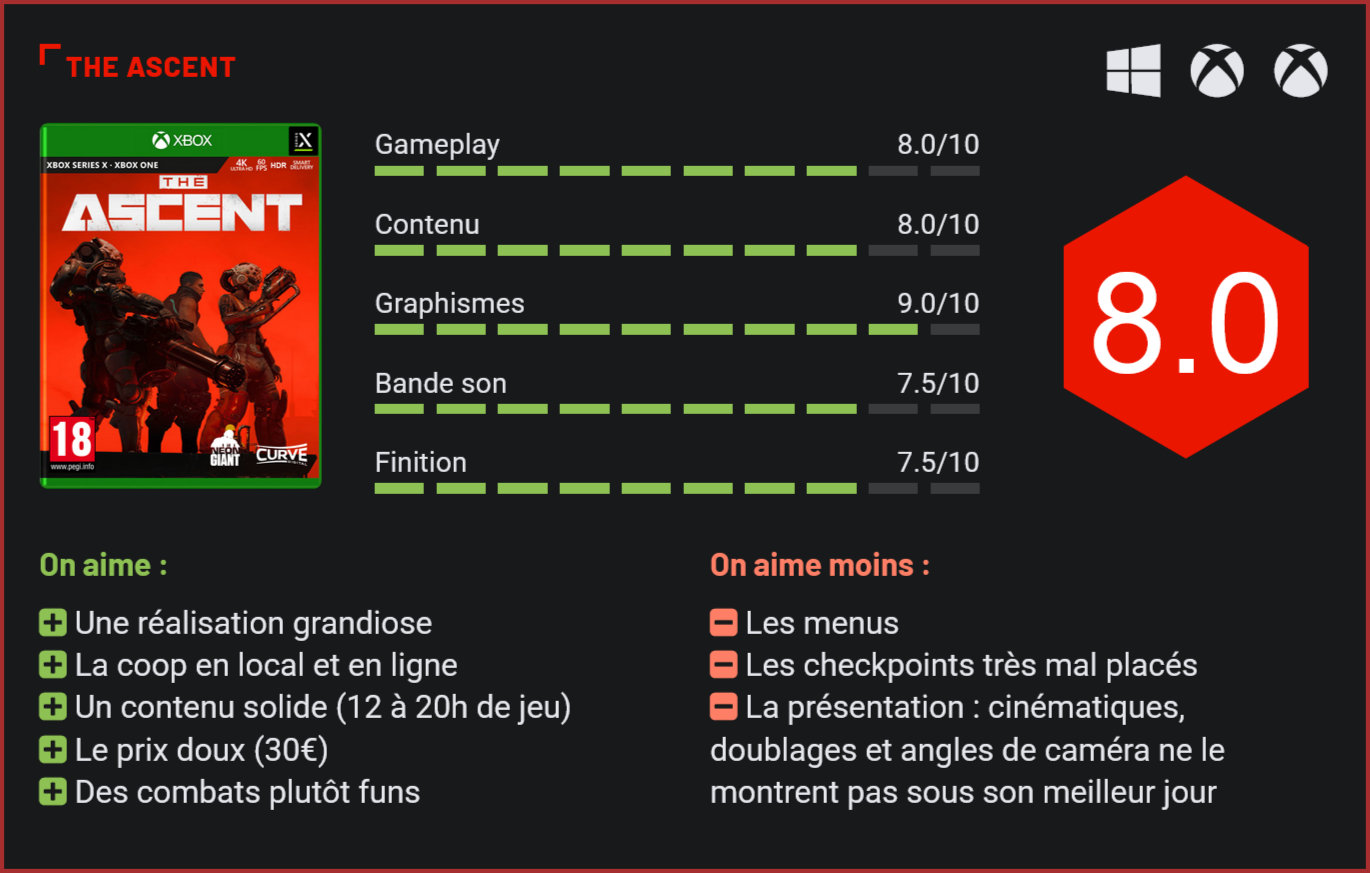 Attendu au tournant comme l’une des premières grosses exclus des Xbox Series, The Ascent ne déçoit pas. Les développeurs de Neon Giant, un petit studio suédois composé de 11 vétérans de l’industrie, signent avec The Ascent leur première production. Le titre, qui tourne sous l’Unreal Engine 4, avait fait forte sensation l’été dernier lors de sa présentation officiel à la keynote de Microsoft. Exclu Xbox (également disponible sur PC), le titre se présente comme un twin-stick shooter qui emprunte certains éléments de gameplay aux RPG. Visuellement, le jeu est superbe. Dans The Ascent, vous incarnez un “perma”, un homme de main transformé en esclave, qui se voit confier des missions par sa corporation. Dans le futur cyberpunk de The Ascent, les humains côtoient d’autres espèces, aux intentions diverses et variées. Le joueur sera amené à faire connaissance avec le monde qui l’entoure progressivement, au fil des missions. Si l’univers du jeu est très séduisant, on regrette toutefois d’entrée de jeu que niveau immersion, The Ascent peine à séduire avec des dialogues et doublages assez creux, des cinématiques ratées et de gros soucis d’angles de vue. Pad en main, heureusement, le constat est radicalement différent. Clairement, The Ascent n’est pas un jeu auquel on jouera pour son scénario. En revanche, son univers mérite clairement le détour. S’il s’agit d’un twin-stick shooter, le titre n’hésite pas à jouer avec les codes du genre et lorgne très souvent davantage du côté du RPG que du shooter. On se ballade librement dans l’univers de The Ascent. Les missions qui nous sont confiées nous poussent toutefois à suivre un tracé bien défini dans ce monde ouvert. Il est possible de se planquer pour canarder des ennemis. On ne va pas vous le cacher, les combats représentent une grosse partie du gameplay. Vous serez amené à affronter des renégats, robots et monstres de toutes sortes seul ou à plusieurs, en équipe de quatre. Le gameplay est très nerveux. On utilise un stick pour se déplacer, l’autre pour viser. On peut switcher assez facilement d’une arme à l’autre. L’esquive est incontournable pour éviter les coups ou les grenades. Le gameplay paraît un peu trop simple au début, mais il s’enrichit progressivement grâce aux éléments empruntés aux RPG. Dans The Ascent, vous gagnerez des niveaux au fil de l’expérience acquise, vous pourrez améliorer votre équipement et votre arsenal et surtout utiliser des “augmentations”, des pouvoirs que vous collecterez au cours de l’aventure et que vous pourrez équiper. Il y en a pour tous les goûts : de la tourelle défensive qui vous aidera à faire le ménage à l’onde de choc en passant par le soin progressif du personnage. Des points d’expérience permettent aussi d’améliorer progressivement son personnage. L’ensemble est plutôt bien fichu. En solo, The Ascent est un jeu plutôt agréable à parcourir, mais qui ne révèle son vrai potentiel qu’en coop. Les développeurs laissent le choix ici aux joueurs : il est possible d’y jouer en local ou en ligne. La partie RPG est plutôt solide. A plusieurs, il est possible de mettre en place de véritables stratégies, de se couvrir mutuellement lors des séquences d’assaut intensives. Les combats de boss sont également beaucoup plus funs. En solo, la formule fonctionne également assez bien, même si le jeu a un côté un peu plus “loup solitaire”. Il faudra davantage prendre couverture pour canarder ses ennemis et personne ne pourra vous sauver. Côté contenu, le titre parviendra à vous tenir scotché au pad entre 12 et 20 heures de jeu, selon le fait notamment que vous acceptiez ou non les quêtes secondaires. Pour le genre, le contenu est donc plutôt généreux, d’autant plus que le titre n’est vendu que 29,99€ et est intégré au Gamepass. On regrette toutefois certains passages assez répétitifs. Clairement, on sent que les développeurs étaient parfois à bout d’idées pour prolonger le divertissement. Le rythme reste globalement très bon et le bestiaire ainsi que les localisations sont suffisamment variées pour maintenir l’intérêt du joueur. La formule n’en reste pas moins très classique. The Ascent parvient néanmoins à se distinguer des autres jeux du genre par sa réalisation splendide. Sur Xbox One, le jeu est assez joli. Sur Xbox Series, on frôle la claque graphique. Les environnements sont superbes, les effets visuels nous en mettent plein les yeux. Le monde de The Ascent est rempli de vie. Si l’action prend place au premier plan, il n’est pas rare d’assister à des scènes très marquantes avec le crash par exemple d’un véhicule volant en background, contre une tour, qui va s’écraser à son tour, provoquant la panique chez les PNJ dans les décors. Un très gros travail a été apporté au niveau de l’immersion. L’univers cyberpunk du jeu est également très réussi – plus encore, oserions-nous dire, que celui de Cyberpunk 2077. Il n’y a pas de doute, The Ascent est avec Ratchet & Clank et Flight Simulator l’une des premières vraies claques sur les consoles “next-gen”. On regrette toutefois que l’optimisation soit loin d’être parfaite, avec quelques petits bugs ça et là et des points de sauvegarde très maladroitement placés. Conclusion Jolie claque graphique, The Ascent est également un jeu très agréable à parcourir en solitaire ou en coop, avec trois amis. Quelque part à mi-chemin entre un twin-stick shooter et un RPG, le premier jeu du studio suédois Neon Giant frappe très fort avec son univers cyberpunk plein de charme, ses décors à couper le souffle, son gameplay nerveux et sa durée de vie solide. Très orienté action, le jeu propose des gunfights intenses. La prise en main est accessible, mais The Ascent parvient à se montrer suffisamment riche pour intéresser les adeptes du genre avec son syst