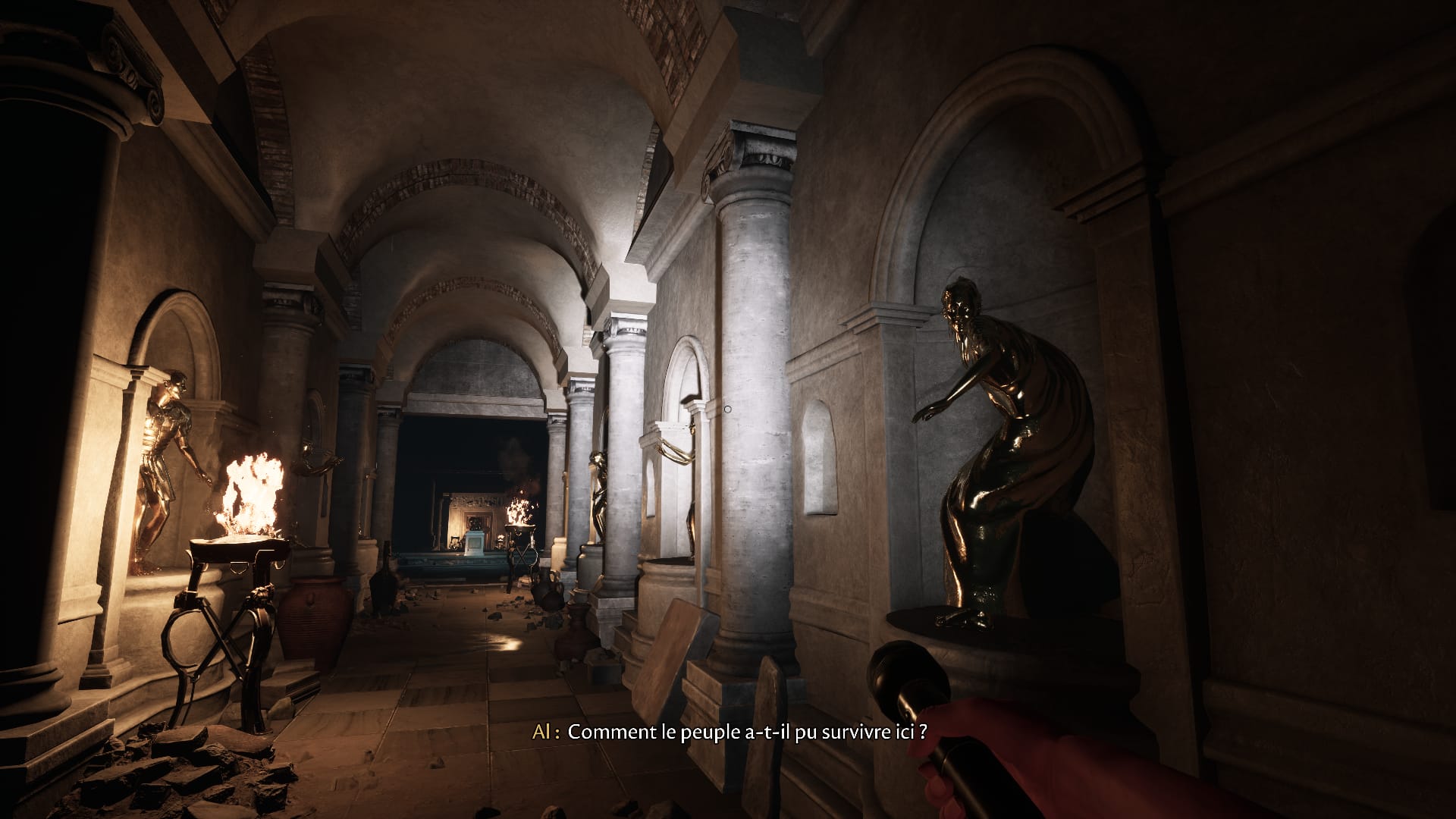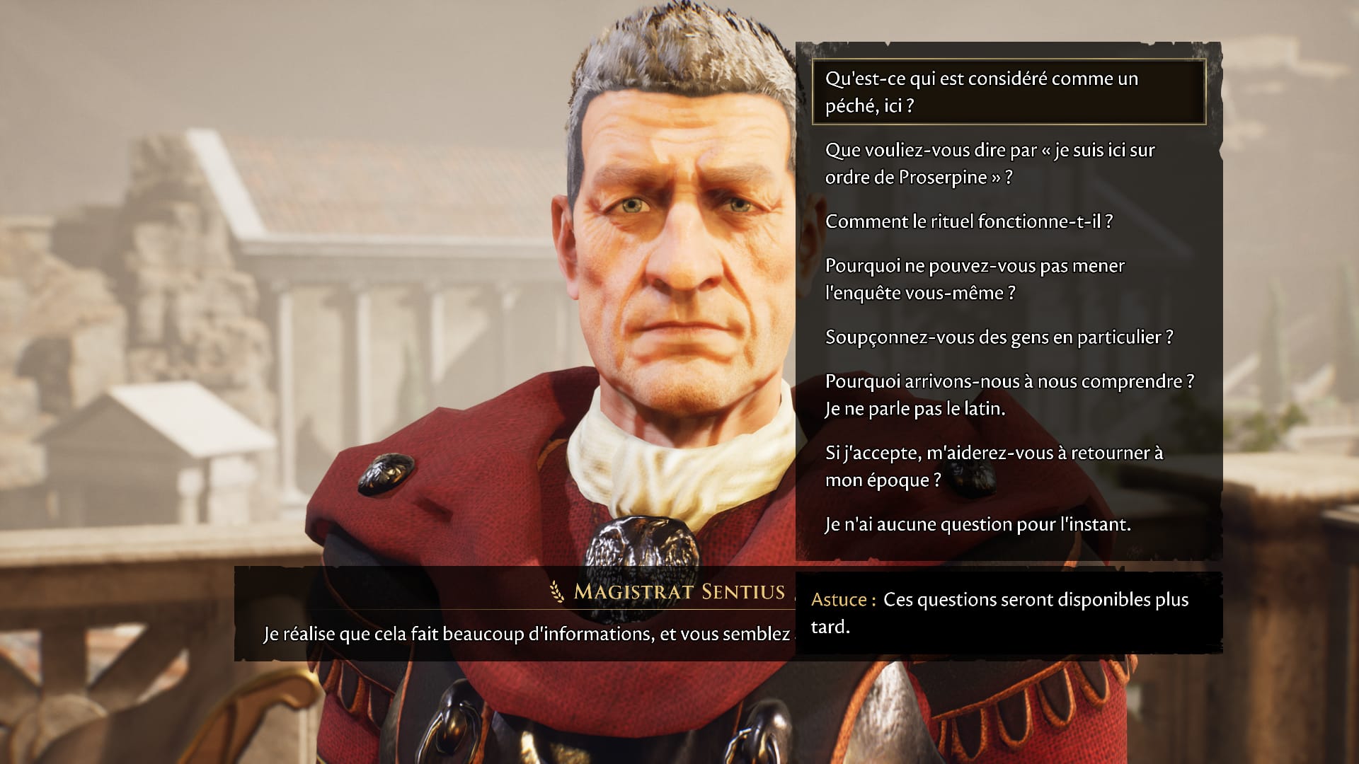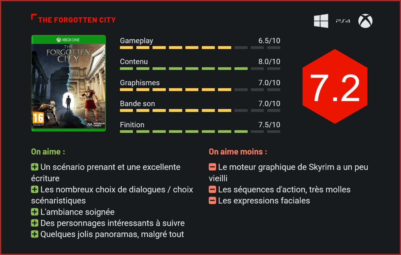 Le premier jeu du studio Modern Storyteller propose de se plonger 2000 ans dans le passé pour découvrir le mystère qui entoure une curieuse cité romaine, frappée par une terrifiante malédiction. Développé par une toute petite équipe de trois passionnés, The Forgotten City était à l’origine un mod de Skyrim qui est devenu avec le temps un véritable jeu à part entière. Bien qu’il s’agisse d’un mod, The Forgotten City parvient à prendre ses distances avec son paternel. Il hérite certes de son moteur graphique et de la vue à la première personne, mais la comparaison s’arrête là. Car Forgotten City n’est pas un jeu de rôle. Il s’agit d’un jeu d’enquête qui vous place dans la peau d’un aventurier amnésique qui se réveille sur la rive du Tibre, en Italie, et se retrouve embarqué malgré lui pour une incroyable aventure à la découverte d’une vieille cité romaine enfuie sous terre. Si le moteur graphique de Skyrim a vieilli, The Forgotten City ne s’en sort pas si mal, techniquement. Sur fond de boucle temporelle et de voyage dans le temps, le joueur partira à la découverte d’une vieille cité romaine qui est victime d’une terrible malédiction. Le moindre crime commis en ses murs conduit à la mort de tous ses habitants. Une règle d’or y régit les rapports entre tous les habitants. Pas de meurtre, pas de vol, pas de suicide, ou tout le monde y passe. Le responsable des lieux, un magistrat romain qui voit en vous le sauveur de la petite bourgade, vous confie alors la mission de tenter de découvrir quel habitant de la ville entend la condamner à son triste sort… Car parmi eux sa cache un citoyen prêt à commettre l’irréparable. Malgré ses apparences de jeu de rôle, The Forgotten City se présente donc comme un jeu d’enquête. Le joueur se promène librement dans les différents quartiers de la ville oubliée pour interroger les citoyens les uns après les autres. En interagissant avec eux, il apprendra à les connaître, se verra confier de petites quêtes annexes et sera amené à faire des choix moraux qui le conduiront parfois à commettre l’irréparable. Dans ce cas de figure, les statues d’or de la ville prendront vie et massacreront tous les habitants les uns après les autres… Vous aurez alors une seule et unique chance de fuir vers le portail qui vous ramènera au tout début de l’aventure, à travers une faille temporelle. Attendez-vous à de nombreux dialogues! Tout l’intérêt du jeu repose sur ces failles temporelles qui vous permettent de progresser petit à petit dans l’aventure et sur vos interactions avec les citoyens. Le joueur sera amené à faire de nombreux choix dans l’aventure, qui le conduiront à quatre fins différentes. The Forgotten City offre ainsi plusieurs approches à chaque situation. Pour une seule et même quête, vous pourrez choisir de venir en aide à un PNJ, de profiter de sa crédulité ou de commettre l’irréparable… Chaque action aura toutefois des conséquences, jusqu’à la prochaine faille temporelle. S’il s’agit d’un jeu d’enquête, The Forgotten City ne se montre toutefois jamais réellement frustrant ni difficile. Les développeurs parviennent également à tenir le joueur scotché à son siège avec une intrigue passionnante, des personnages bien développés, des dialogues très bien écrits et un très bon rythme. Seule petite ombre au tableau peut être : les quelques séquences d’action où vous devrez utiliser un arc à flèches ou un révolver manquent réellement d’intensité. Les contrôles sont mous et on n’éprouve pas vraiment de sensations dans les combats. Ceux-ci apportent toutefois un peu de diversité dans le gameplay. L’univers du jeu a vraiment beaucoup de charme. The Forgotten City brille avant tout pour la richesse de son scénario et de son univers, plein de charme. Sachez-le toutefois avant de vous lancer dans l’aventure, le jeu n’est pas bien longue. Comptez 5 à 7 heures environ pour finir l’aventure. A 29,99€, ça fait tout de même un peu cher l’heure de jeu. D’autant plus que la première heure fait littéralement office de tutoriel. Côté technique, il ne faut pas non plus s’attendre à une claque. Le moteur graphique de Skyrim a vieilli, les visuels sont datés, les animations aussi, mais le charme opère toujours, en grande partie grâce aux jolis panoramas du jeu et son univers très mystérieux. Le plus gros reproche à adresser concerne toutefois les expressions faciales, parfois si drôles qu’on a beaucoup de mal de prendre au sérieux nos interlocuteurs. Au niveau de la bande son, rien à signaler. Les doublages en anglais sont plutôt bons, et traduits en français sous la forme de sous-titres. Les musiques immergent correctement le joueur mais n’ont malheureusement rien de vraiment marquant. Vous l’aurez compris, The Forgotten City est un jeu qui s’adresse avant tout aux amateurs d’enquêtes policières qu’aux amateurs de jeux de rôle. Conclusion Développé par une toute petite équipe de trois passionnés, The Forgotten City est un passionnant jeu d’enquête narratif qui nous plonge 2.000 ans dans le passé, à la découverte d’une mystérieuse cité victime d’une terrible malédiction. Se jouant entièrement à la première personne, le titre propose un récit passionnant, qui nous est distillé progressivement à travers de nombreux dialogues brillamment écrits. Tout l’intérêt du titre repose sur son scénario et les nombreux choix de dialogues avec les habitants de la ville. Bien qu’il soit à l’origine un mod de Skyrim, The Forgotten City ne partage que son moteur graphique et sa vue à la première personne avec le jeu de Bethesda Softworks. Il ne faut donc pas s’attendre à une aventure épique, bien que quelques séquences d’action soient au programme. Techniquement, le jeu est loin d’être à la hauteur des standards actuels. Mais certains de ses pa