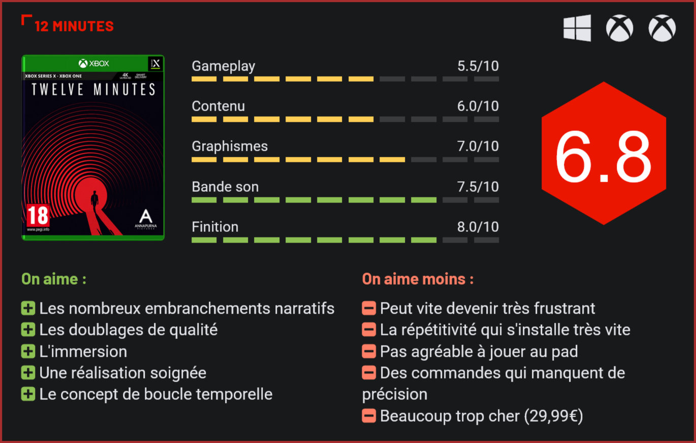 Attendu au tournant depuis sa présentation lors de l’E3 de 2019, 12 Minutes aura fait couler beaucoup d’encre. Connu initialement sous le nom “The Witness”, le jeu repose sur un concept unique de boucle temporelle. Sorti de l’imagination de Luis Antonio, un vétéran de l’industrie qui a notamment travaillé des années chez Rockstar Games, 12 Minutes avait fait sensation lors de la keynote 2019 de Microsoft. A travers un trailer haletant, son créateur était parvenu à capter l’attention du public. Complètement à part, son jeu propose une expérience unique, à mi-chemin entre le thriller narratif et le point & click. L’ambiance du jeu est soignée dans ses moindres détails. Malgré les apparences, il ne s’agit pas d’un jeu d’action, mais d’un point & click à l’approche plutôt originale puisque le joueur est ici soumis à une pression constante. Un inconnu débarquera dans quelques minutes dans son appartement pour lui régler son compte à lui et à sa compagne. Le temps presse donc pour éviter le bain de sang. La réponse se trouve dans le passé… Pour finir le jeu, il faudra donc interagir avec sa compagne et son environnement. 12 Minutes fait partie de ces jeux qui jouent la carte du die & retry. Chaque tentative se terminera par un échec, jusqu’à ce que vous arriviez à la combinaison parfaite. En cas d’échec, retour à la case départ, quelques minutes avant l’arrivée du tueur. Votre objectif : tout faire pour éviter ce drame. La particularité de 12 Minutes, c’est que le jeu se joue entièrement avec une vue du dessus, qui donne une très belle lisibilité du théâtre de jeu. Le drame se joue dans un environnement confiné, ce qui signifie qu’il faudra mettre à contribution tous les objets qui vous entourent pour progresser dans l’aventure. Forcément, de par sa nature, 12 Minutes est un jeu répétitif. Tout le concept repose ici sur une boucle temporelle, et on ne va pas vous le cacher, le titre peut vite devenir très frustrant voir même agaçant de par sa structure et son minimalisme. Luis Antonio explique avoir tiré son inspiré de films comme Memento ou Un Jour sans fin. Son jeu partage d’ailleurs quelques éléments avec les productions cinématographiques. Il intègre un casting de haute volée avec quelques excellentes doublures, parmi lesquelles Willem Dafoe et James McAvoy. Difficile de ne pas reconnaître le talent du créateur, qui nous livre ici un thriller particulièrement séduisant. Si l’ambiance du jeu est travaillée, on ne peut malheureusement pas en dire autant de son scénario, qui fonde tout son intérêt sur les mystères du passé. Les dialogues du jeu restent très plats et l’ensemble manque de subtilité. 12 Minutes n’est certes pas une grosse production, mais vu le prix auquel le jeu est vendu (29,99€) et le bruit qu’on a fait autour, on était toutefois en droit d’en attendre beaucoup plus. A chaque échec, retour à la case départ. Car outre par sa répétitivité, le jeu déçoit par son manque de profondeur et d’ambition. Les embranchements scénaristiques sont nombreux, mais on finit tout de même par faire 30 fois la même chose, jusqu’à découvrir une nouvelle façon de progresser. La première que l’on parvient à maîtriser l’opposant, un sentiment de fierté vous envahit soudainement, mais il vous faudra encore plusieurs dizaines d’essais avant d’arriver au bout du récit… On progresse dans l’intrigue principale à tâtons. Et avec parfois beaucoup de frustration. D’autant plus que le background du jeu est très léger. A aucun moment vous ne connaitrez par exemple le nom des deux époux. Vous explorerez rapidement la plupart des lignes de dialogue, qui n’explorent d’ailleurs pas vraiment la personnalité des rôles principaux, se contentant majoritairement de nous faire progresser dans l’intrigue. Chaque tentative vous rapprochera un peu plus près de la vérité, mais pour les joueurs les moins imaginatifs, l’expérience deviendra vite très pénible. On notera au passage que si la vue supérieure est très réussie, l’absence de proximité avec les protagonistes fait qu’on a forcément beaucoup de mal à s’y attacher. Si le concept est furieusement séduisant, 12 Minutes montre donc vite ses limites. Au pad d’ailleurs, le jeu est une véritable plaie à joue. Les contrôles manquent de précision et la sélection d’objets est une véritable plaie. On regrette également la présence de nombreux bugs : d’un personnage qui reste bloqué en un seul endroit à l’apparition de répliques et d’éléments narratifs que l’on n’a pas encore découvert, simplement parce que le jeu a été conçu pour être joué d’une certaine façon. Par exemple, lors de l’un de nos premiers essais, nous avons mis la main sur le téléphone et vu apparaître plusieurs propositions spoilant complètement la suite. L’ambiance est soignée, mais le récit manque de subtilité. Techniquement, le jeu se défend plutôt bien. Ce n’est pas forcément une claque, mais les environnements sont soignés et la mise en scène est réussie. La bande son est en revanche excellente, avec des doublages, bruitages et sons de qualité, dignes d’une production hollywoodienne. S’il séduit par son originalité et n’aura sans doute pas de mal à trouver son public, 12 Minutes peine toutefois à convaincre sur la durée, de par un manque d’ambition flagrant. Un drame en huis-clos, prenant, à condition d’accrocher au concept. Dommage que niveau finition, ça ne suive pas tout à fait. Clairement, quelques développeurs de plus n’auraient pas été de trop pour soutenir ce projet. Conclusion Avec son concept unique, qui consiste à revivre sans cesse une séquence de jeu au cours de laquelle un inconnu rentre dans votre appartement pour vous menotter et vous tuer, 12 Minutes s’impose comme un thriller prenant, dans lequel le joueur sera amené à ex