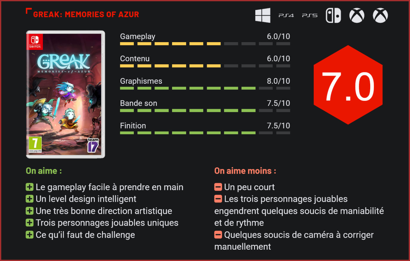 Sorti il y a quelques jours sur consoles de nouvelle génération ainsi que sur PC et Switch, Greak: Memories of Azur est un jeu d’action/aventure en 2D qui montre bien le talent de sa petite équipe de développement. Greak: Memories of Azur est un jeu indépendant développé par Navegante Entertainment. Il s’agit du tout premier projet de ce petit studio basé au Mexique. Greak raconte l’aventure d’un jeune garçon éponyme dans les terres d’Azur. Celui-ci fait partie de la race magique des Courines, en proie à une invasion d’une faction ennemie nommée Urlag. Accueilli dans un village de survivants qui luttent contre cette invasion, il va tout faire pour retrouver les membres de sa famille et aider les villageois qui tentent de construire un aéronef pour s’échapper au loin. Ce jeu d’action et d’aventure en 2D consiste à explorer différentes zones peuplées d’ennemis pour y trouver des objets et résoudre des objectifs qui vont faire avancer la quête principale. Le titre se montre un peu corsé parfois, en particulier au début puisque notre personnage possède peu de points de vie et des poches vides. Il est en effet possible de stocker des objets dans un petit inventaire à l’espace limité, nous forçant à faire des choix entre objets de soins et loot à revendre contre de l’argent. Il faut utiliser les différents personnages jouables pour progresser. Greak, armé de son épée, part donc à la recherche de sa grande sœur Adara ainsi que de son grand frère Raydel. Ceux-ci finissent par nous rejoindre, nous permettant d’incarner jusqu’à trois personnages à tour de rôle. Si Adara est disponible rapidement durant l’aventure, il faudra toutefois attendre les dernières heures pour pouvoir contrôler l’aîné de la fratrie. Chacun des trois personnages est capable de se battre, à l’épée ou avec de la magie, mais ils possèdent tous des petites spécificités et capacités de combat qui les rendent uniques. Attention cependant, s’il est possible de contrôler les trois personnages, le jeu ne se veut pas être une aventure en coopération. Il est impossible de jouer à plusieurs, tous les personnages doivent être gérés par une seule et même personne. Toutes les énigmes et situations que l’on rencontre exploitent ce concept de personnages multiples et le résultat est plus que convaincant. Le level design est très bien conçu et demande d’utiliser au mieux les différents personnages pour résoudre les nombreuses énigmes disséminées un peu partout. Malheureusement, l’idée de devoir gérer trois personnages engendre des petits problèmes puisqu’ils sont tous dépourvus d’intelligence artificielle. Il est possible de synchroniser les frères et sœurs pour qu’ils effectuent les mêmes actions en même temps. Mais comme leurs animations et capacités diffèrent, cette option est rarement une bonne idée, en particulier durant des séquences de plate-forme précises. Il est donc souvent nécessaire de les déplacer manuellement chacun à leur tour, ce qui ralentit forcément le rythme de l’exploration. Quelques boss viendront vous barrer la route. Ces environnements intelligemment conçus proposent également une petite touche de Metroid-like puisqu’ils sont interconnectés, explorables à souhait et que débloquer les autres personnages va permettre de résoudre des puzzles impossibles à réaliser avec l’un d’entre eux uniquement. Il est dommage de voir que le concept ne soit pas poussé plus loin. Le jeu est relativement court, comptez environ cinq ou six heures pour en voir le bout lorsqu’on découvre. La formule reste simple et les capacités des personnages évoluent peu durant l’aventure. Le titre aurait peut-être bénéficié de plus de choses à trouver et de plus d’améliorations pour faire évoluer les membres de la fratrie dans le but de nous pousser à explorer les moindres recoins des différentes zones. Les améliorations de nos personnages sont parfois liées à des objectifs annexes, à l’image des nouvelles techniques de combat de Greak qui s’apprennent en remplissant des missions que lui confient un personnage du village. Le jeu indique où se trouvent les autres personnages. Passer au village va être l’occasion d’en apprendre plus sur l’univers et sur le scénario un peu absent du déroulé. En plus des quêtes annexes, des boutiques sont également disponibles pour ravitailler notre inventaire. Lorsqu’il ne s’agit pas de manœuvrer plusieurs personnages, le gameplay du jeu est agréable à prendre en main malgré quelques petits problèmes de caméra. Celle-ci a tendance à se placer de sorte à ne pas révéler les alentours, mais il est possible de la contrôler avec le stick droit, ce qui est d’une grande aide pour avoir une vision plus globale des zones et des énigmes. Enfin, il est impossible de parler de Greak sans aborder l’une de ses plus grandes forces, à savoir le soin tout particulier apporté à l’ambiance visuelle et sonore du titre. Les environnements et les personnages sont dessinés et animés à la main. Un travail conséquent qui rend le jeu plus qu’agréable à parcourir. Certaines scènes clé du scénario sont également réalisées entièrement en animation. Les musiques orchestrales sont également de très bonne facture, parfois épiques mais souvent calmes pour accompagner l’ambiance mélancolique de l’univers froid et meurtri d’Azur. Conclusion Greak: Memories of Azur est le premier projet d’un petit studio mexicain Navegante Entertainment. On y incarne Greak, un jeune garçon muni d’une épée qui se lance à la recherche de sa grande sœur Adara et de son grand frère Raydel dans un monde sombre et impitoyable. Il s’agit d’un jeu d’action et d’aventure en 2D où il faut explorer différentes zones interconnectées. Sans être véritablement un Metroid-like, Greak en reprend certaines idées dont la structure des env