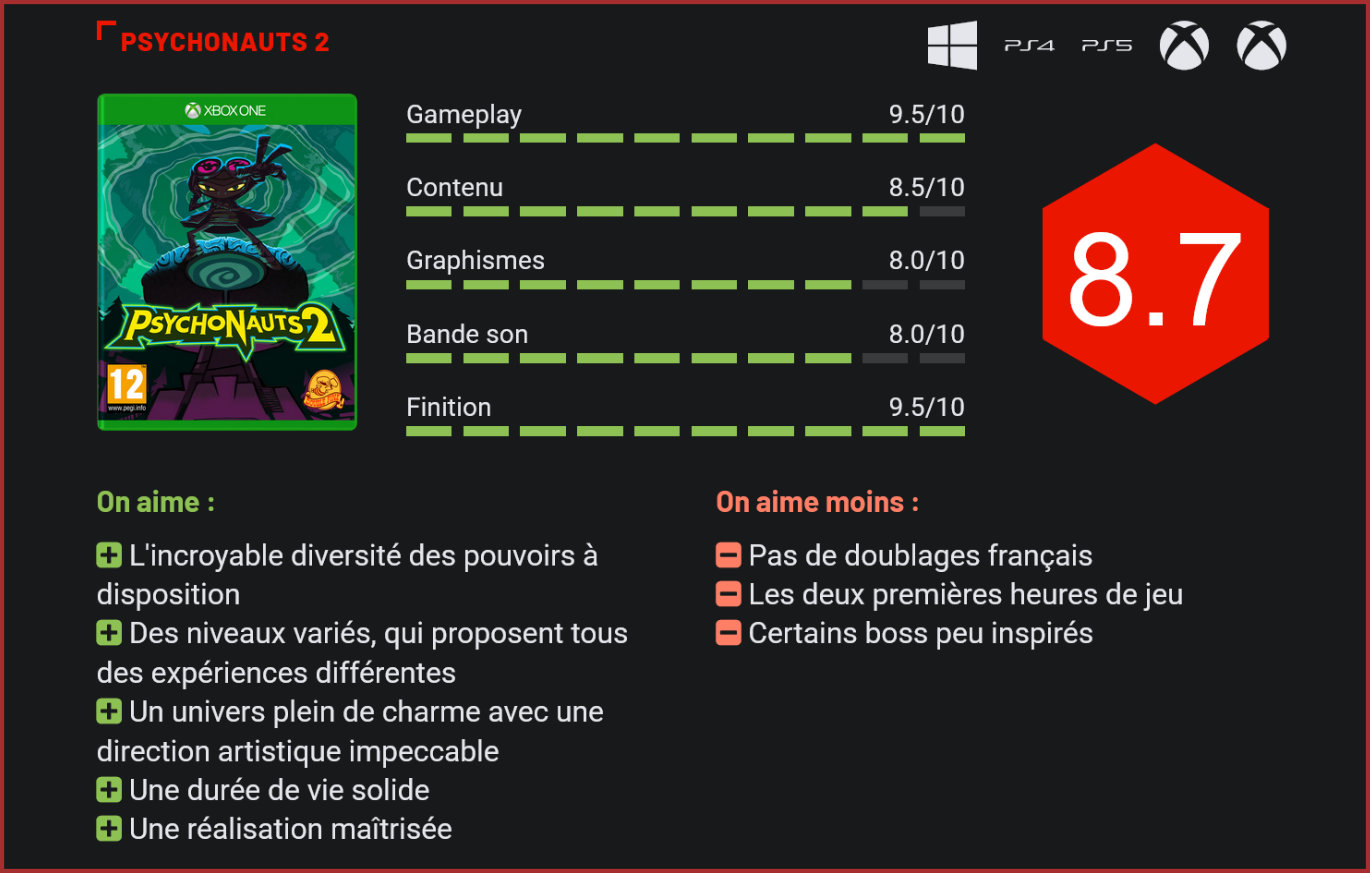 Seize longues années après le premier volet, Tim Schafer nous livre enfin la suite de Psychonauts. Cinq longues années auront été nécessaires au développement de cette suite, qui a bénéficié d’un budget beaucoup plus important que son ancêtre, en partie grâce au rachat du studio par le géant Microsoft. Et l’attente en valait bien la peine… Parmi ces titres qui avaient fait un joli flop à l’époque mais qui était parvenu à galvaniser une petite communauté de fans, Psychonauts reste sans l’ombre d’un doute l’une des oeuvres les plus marquantes de Tim Schafer, le créateur de Monkey Island, Full Throttle et Grim Fandango. Légende du jeu vidéo, le programmer avait fondé son propre studio de développement au début des années 2000. C’est là qu’il débutera une nouvelle carrière en créant ses propres franchises, avec d’abord Psychonauts, puis Brütal Legend, Costume Quest, Stacking ou encore Iron Brigade. Ces 15 dernières années, son studio a toutefois ramé pour garder la tête au bord de l’eau. Double Fine a frôlé plusieurs fois la faillite, déclinant toujours les offres de rachats d’éditeurs, jusqu’à ce que Microsoft frappe à la porte. Agréablement surpris par la nouvelle politique du géant américain, qui donne une complète liberté créative à ses studios, Double Fine a rejoint la barque. Une décision qui aura un énorme impact sur Psychonauts 2. Certains niveaux sont complètement psychédéliques. Le studio américain avait en effet choisi de financer son projet par une campagne de crowdfunding, avec des moyens relativement limités. Quelques mois avant sa sortie initiale, le studio avait alors annoncé qu’il devait revoir ses ambitions à la baisse et n’inclurait pas de boss dans le jeu. Le rachat de l’entreprise par Microsoft a permis au studio de bénéficier d’un beaucoup plus gros budget de développement. Psychonauts 2 est donc le grand gagnant de cette acquisition. L’autre bonne surprise pour les fans, c’est qu’en dépit du rachat par Microsoft, le titre est bel et bien resté multisupports. Il sort sur PC, PS4/5 et Xbox One/Series, et il a en plus le mérite d’être intégré au Gamepass. Entre les missions, le joueur navigue librement dans un hub central. S’il ne s’agit pas tout à fait d’un triple-A, Psychonauts 2 se rapproche tout de même beaucoup d’une grosse production. Contrairement à un Ratchet & Clank, Psychonauts 2 ne se destine toutefois pas à un public très large. Il partage certes avec les autres platformers plusieurs idées, mais son univers et son intrigue le réservent à une audience plus mature, son gameplay est exigeant et surtout, il n’a malheureusement pas été doublé en français. Pour y jouer, il faudra donc se contenter des sous-titres en français. Vous l’aurez compris, Psychonauts 2 s’adresse très clairement à un public d’adultes, malgré son look cartoonesque. L’intrigue du jeu reprend là où nous l’avions laissée il y a quinze ans déjà. Pas de panique si vous n’aviez pas joué au premier volet, un petit récapitulatif vous permettra de vous familiariser avec l’univers de Psychonauts avant de vous plonger dans l’aventure. Dans la peau de Raz, un apprenti-Psychonaut (des individus capables d’explorer le mental des autres en plongeant dans leur esprit), le joueur devra participer à une succession de missions pour se former à sa nouvelle carrière. Fidèle à l’original, Psychonauts 2 reprend tout ce qui faisait le succès de son ancêtre : son univers coloré et complètement délirant, sa diversité, son design très burtonesque et ses mécanismes de jeu résolument old-school. Les pouvoirs de votre héros sont extrêmement variés, de la télékinésie à la pyromanie, en passant par la création d’un petit personnage en papier qui vous aidera dans la résolution de plusieurs énigmes. La construction du jeu est très old-school. On progresse ici dans un hub central dans lequel on est amené à faire des allers–retours en début d’aventure pour faire progresser l’histoire en dialoguant avec divers PNJ. On se voit attribuer des missions qui nous amèneront à dialoguer avec d’autres PNJ, dont il faudra explorer l’esprit. Si le hub central fait donc figure de mini open-world, la structure du jeu repose bien sur des niveaux de taille plus réduite, souvent beaucoup plus linéaires. Quelque part à mi-chemin entre le jeu d’aventure et de plates-formes, Psychonauts 2 brille par la diversité de son gameplay. Raz se déplace facilement du bout du stick. Il est capable de sauter, de frapper et de réaliser des esquives. Toutefois, ce sont bien ses pouvoirs qui lui permettent de se démarquer des autres héros de jeux de plates-formes. On en dénombre dix en tout et pour tout. Mais vous ne pourrez en utiliser que quatre simultanément, avec l’un des quatre raccourcis à votre disposition : LB, LT, RB, RT sur la manette Xbox. Raz est capable de mettre le feu à ses ennemis, d’agripper des objets pour leur envoyer à la figure, de se déplacer beaucoup plus rapidement en roulant sur une petite boule, de scanner l’esprit de ses ennemis, de leur tirer dessus ou encore de créer un petit personnage de papier qui l’aidera à résoudre certaines énigmes. Psychonauts 2 parvient à surprendre là où on ne l’attendait pas avec un système d’expérience qui donne un joli sentiment de progression à travers l’aventure : notre personnage devient de plus en plus puissant au fil de ses succès et des collectibles qu’il récupère. Avec ses crédits gagnés, il débloquera de nouvelles capacités passives, de nouveaux objets et pourra améliorer ses compétences principales en débloquant certains effets. Malgré les apparences, Psychonauts 2 ne se destine donc pas du tout aux plus jeunes, qui auront sans doute beaucoup de mal à passer des séquences de jeu parfois très exigeantes. Car il faut non seulement avoir de bons 