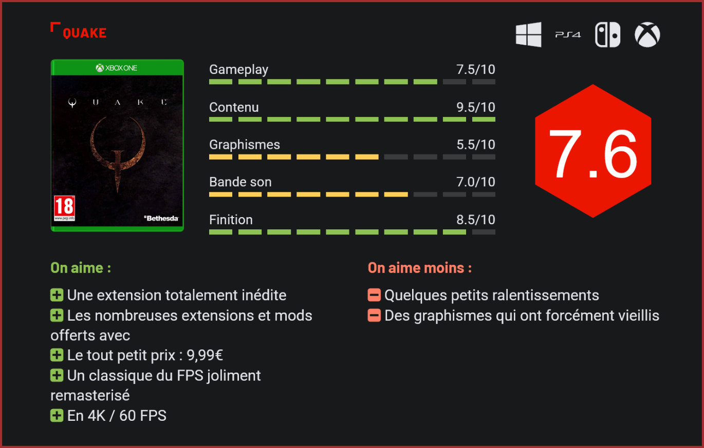 Né en 1996, Quake est l’un des FPS les plus emblématiques des années 90. La série n’a toutefois plus connu de nouvelle entrée depuis des années. Pour célébrer son anniversaire, idSoftware a confié au studio suédois MachineGames un remaster du tout premier épisode. Doom, Wolfenstein et Quake sont autant de séries cultes qui ont marqué l’histoire des jeux de tir à la première personne. Si les deux premiers ont eu droit à de multiples reboots et remasters, Quake restait le parent pauvre du catalogue d’idSoftware. Pour célébrer comme il se doit son anniversaire, l’éditeur vient toutefois de nous livrer un remaster du tout premier volet. Si le jeu a (forcément) beaucoup vieilli, il conserve un certain charme. Vendu 9,99€, ce remaster se veut plutôt généreux tant au niveau du contenu que de la forme. A ce prix, il ne faut bien sûr pas s’attendre à un remake complet. Esthétiquement, le jeu n’a pas été entièrement repensé, mais certains effets visuels ont été retravaillés, le titre s’affiche désormais en 4K et tourne en 60 FPS. Certains modèles ont également été retravaillés. Forcément, ses graphismes ont vieilli, mais ce joli coup de pinceau lui redonne un peu de fraicheur. On lui reprochera toutefois quelques petits ralentissements qui peuvent se faire ressentir occasionnellement. Tout l’intérêt d’un tel remaster, c’est bien sûr de permettre aux fans de remettre la main sur un classique qui n’était plus disponible sur de nombreuses plates-formes. MachineGames ne s’est toutefois pas contenté de porter le jeu sur les supports les plus récents puisque le titre intègre de nombreux contenus additionnels, dont les trois campagnes supplémentaires de l’époque, une nouvelle campagne (Dimension of the Machine) complètement inédite, la version Doom 64, proposée sous la forme d’un mod, de la coop en local, du deathmatch jusqu’à huit en ligne, et, cerise sur le gâteau, du cross-play! Le contenu de ce remaster est très généreux. Pad en main, le jeu reste très agréable à parcourir, seul ou à deux. Les mécanismes ont certes vieillis, mais le titre reste beaucoup plus moderne qu’un Wolfenstein ou qu’un Doom dans la structure de ses niveaux, qui ne sont pas trop labyrinthiques. Ceux-ci sont composés de zones relativement linéaires dans lesquelles il faudra massacrer les ennemis croisés, avant de récupérer des clés qui vous permettront d’ouvrir des portes et de progresser jusqu’à un boss de fin de niveau. Les patterns du jeu font que le titre est globalement très facile à jouer pour un vétéran. Pour les débutants, un mode facile le rendra totalement accessible. Si Quake est un titre qui a moins marqué l’histoire du jeu vidéo que Doom, il n’en reste pas moins un classique, et un titre très agréable à parcourir. Il se démarque des autres FPS de l’époque par son univers médiéval fantastique plein de charme et son bestiaire varié qui comprend chevaliers, zombies et monstruosités de toutes sortes. Alors certes, les plus jeunes auront sans doute du mal à lui trouver du charme, mais pour les amoureux du FPS, ce remaster est une véritable bénédiction. Complet, très riche en contenu, bon marché et surtout très joliment optimisé! Conclusion Moins connu que Doom et Wolfenstein, Quake n’en reste pas moins l’un des grands classiques du FPS. Le titre d’idSoftware a droit ici à un remaster très généreux, qui nous est signé par le studio suédois MachineGames, connu pour son reboot de l’excellent Wolfenstein. Le remaster de Quake brille pour deux aspects : côté réalisation, MachineGames a joliment remis au goût du jour l’esthétique du jeu, avec des modèles 3D et effets visuels retravaillés, le support de la 4K et du 60 FPS. Côté contenu, on retrouve le jeu original, ses trois extensions, une extension totalement inédite, du multi en local et en ligne, cross play, et même le support de mods! Généreux en contenus, l’éditeur nous livre une copie impeccable, dans le fond comme dans la forme. A 9,99€, ce remaster de Quake est donc un très joli cadeau pour les fans de ce FPS culte des années 90.