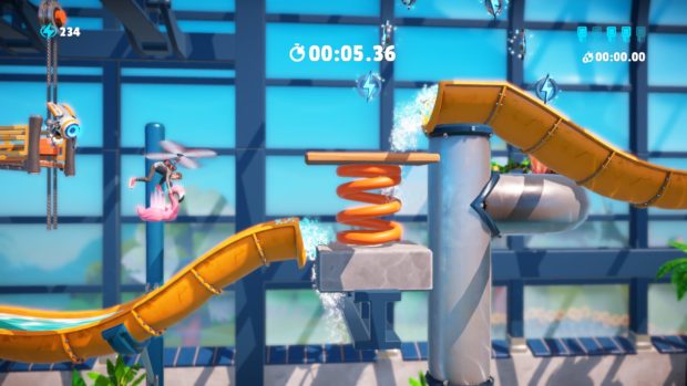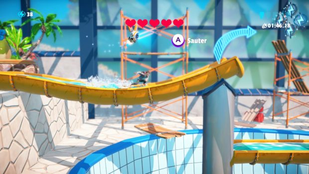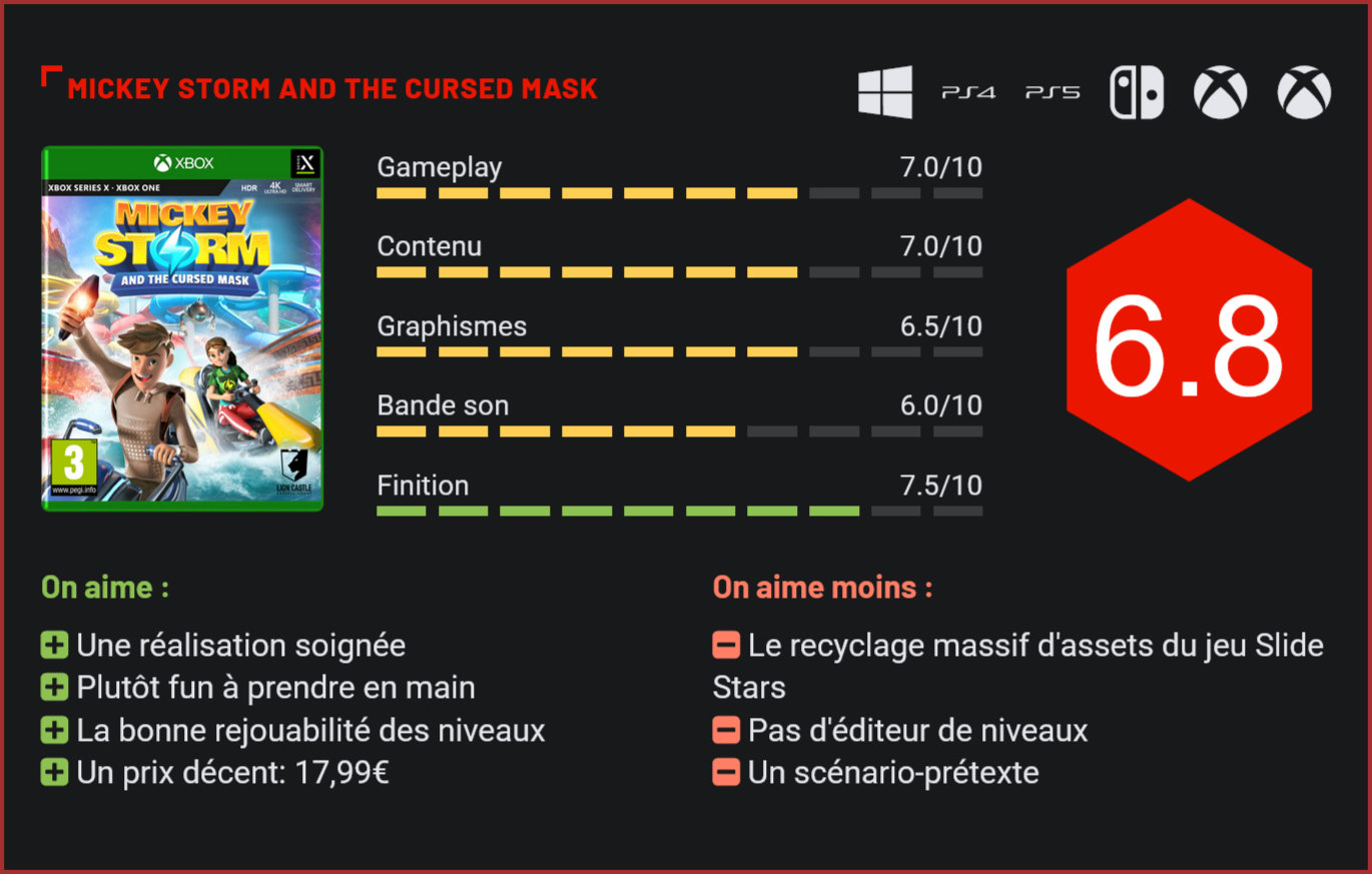 Un an après le sympathique Slide Stars, le petit studio Triangle nous revient déjà avec un nouveau jeu baptisé Mickey Storm and the Cursed Mask. Passé relativement inaperçu en 2020, Slide Stars était pourtant un sympathique jeu de plates-formes au concept délirant puisqu’il proposait de participer à des parcours d’obstacles aquatiques. Plutôt joli, fun à prendre en main et rigolo, le titre de Triangle Studios souffrait toutefois d’un gros défaut : il était vendu presqu’au plein tarif. Ses créateurs semblent s’être bien rendu compte de leur erreur puisqu’ils nous proposent aujourd’hui sa suite spirituelle, Mickey Storm and the Cursed Mask. Esthétiquement, le jeu est plutôt joli. Il fallait s’en douter, avec une période de développement de quelques mois seulement, Mickey Storm emprunte de nombreux assets de son prédécesseur. Le gameplay est pratiquement identique à celui de Slide Stars, à quelques subtilités près, le concept reste le même et de nombreux éléments graphiques sont même réutilisés. Si vous avez parcouru Slide Stars, le titre n’a que peu d’intérêt, sauf si bien sûr vous aviez vraiment accroché à son concept. Ce qui est intéressant avec ce titre, c’est qu’il adopte un ton et une approche sensiblement différents. Exit les influenceurs, place ici à une jeune aventurier dont les parents ont été enlevés et qui va tenter de les retrouver dans un gigantesque parc aquatique. Le jeu se destine cette fois à une audience beaucoup plus jeune, et cela se ressent dans le ton. On dénombre au total 74 niveaux. Mickey Storm conserve tout ce qui faisait le charme de son ancêtre : une prise en main accessible, des graphismes colorés, une progression basée sur la réalisation d’objectifs et des épreuves relativement variées. Le titre prend la forme d’un platformer en 2.5D – comprenez par là qu’il se joue comme un jeu de plates-formes en 2D, mais qu’il est réalisé en 3D. Le résultat est visuellement très réussi. Pad en main, mickey Storm est également très agréable à parcourir. On contrôle les déplacements du personnage du bout du stick, l’objectif est de progresser dans des niveaux bourrés de pièges en évitant de tomber de sa bouée. Comme dans tous les platformers, il est possible de sauter et de réaliser des double-sauts. Petite spécificité de ce Mickey Storm, notre personnage est également capable de planer quelques instants après un double saut. Une petite subtilité qui apporte un peu de fraicheur au gameplay. Le gameplay a quelques subtilités. Difficile de ne pas ressentir une vibe Sonic en parcourant les niveaux, qui renferment de nombreux grand huit et propulseurs. Ca va vite, parfois trop vite, et le joueur devra collecter dans chaque niveau des tas de collectibles. Globalement, le jeu est fun à prendre en main et très accessible, mais pour voir le bout, il faudra avoir des réflexes aiguisés. Dans l’aventure, on a droit à des épreuves assez variées avec des contre-la-montre, des défis de parkour et même des combats de boss. Vu son prix, le contenu est plus que correct. On retrouve au total 74 épreuves différentes. Le jeu est jouable seul ou en coop en local. Les niveaux se révèlent également un peu plus variés que dans Slide Stars et le gameplay a plus de subtilités aussi. Le titre paraît toutefois un chouilla moins fun que son ancêtre. Les niveaux sont assez variés. Techniquement, le titre parvient également à séduire, sans jamais impressionner. Le jeu est fluide et ne souffre pas de véritables défauts techniques. La réalisation est soignée également, avec des décors remplis de détails, des animations soignées et une direction artistique globalement réussie, sauf peut-être pour ce qui est du character design, toujours aussi douteux. Pour une petite production vendue 17,99€, Mickey Storm n’a pas à rougir. Sa bande son est également efficace, même si elle manque un peu de personnalité. En définitive, il s’agit donc plutôt d’une bonne surprise. S’il perd en personnalité par rapport à Slide Stars, Mickey Storm a le mérite d’être vendu à un tarif “décent”, au vu du contenu qui est proposé et de ses qualités. Petits et grands, voici une belle façon de se divertir cet été. Le jeu a d’ailleurs un côté très rafraîchissant qui plaira assurément aux plus jeunes. Conclusion Sorti de nulle part, Mickey Storm and the Cursed Mask est une agréable surprise pour les amateurs de platformers. Rafraîchissant, de par son concept et son univers délirants, le jeu de Triangle Studios parvient à se démarquer des autres titres du genre par ses décors colorés et sa prise en main très accessible. Vous contrôlez ici un jeune aventurier à la recherche de ses parents dans un gigantesque parc aquatique. Le contexte fait qu’on progresse dans le jeu sur une bouée, à travers des niveaux complètement délirants. C’est fun, agréable à prendre en main et clairement, un copié-collé du sympathique Slide Stars. Les développeurs du jeu ne se sont pas gênés pour réutiliser sans vergogne les assets de leur précédent jeu, sorti il y a moins d’un an. Ils ont toutefois appris de leurs erreurs : Mickey Storm est vendu à un tarif très décent : 17,99€, soit près de deux fois moins cher que son ancêtre. S’il manque un peu d’ambition, Mickey Storm reste un jeu très fun à prendre en main, qui séduira à la fois petits et grands.