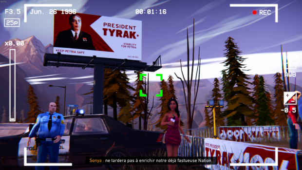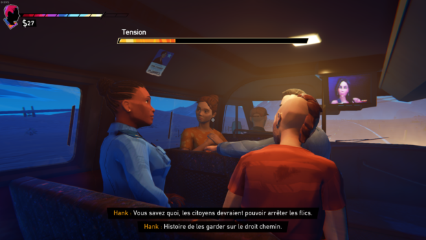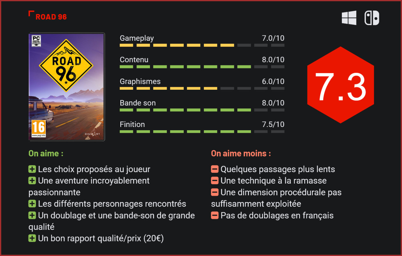 Pour sa troisième création, le studio montpelliérain DigixArt revient avec Road 96. Un jeu d’aventure sur fond de road trip, qui a de nombreuses armes en main pour nous séduire. Périlleux choix que la réalisation d’un road-trip vidéoludique. Le genre est tellement spécial, que le moindre faux pas peut conduire le joueur à s’ennuyer et à quitter une bonne fois pour toute le jeu. C’est pourtant ce qu’a tenté de produire le jeune studio DigixArt. Si ce nom ne vous est pas inconnu, c’est parce le studio est déjà à l’origine de deux productions à la qualité variable. Pour leur troisième essai, les français proposent donc Road 96. Dans Road 96, le contexte influence énormément le gameplay. On y incarne plusieurs jeunes, désireux de quitter Petria, une nation dirigée par un tyran autoritaire du nom de Tyrak. Le pays est ultra surveillé, et toutes les frontières sont surveillées par des soldats surarmés. Les jeunes veulent donc fuir cette tyrannie, mais doivent parfois parcourir plusieurs milliers de kilomètres. Qu’à cela ne tienne, en faisant de l’auto-stop, en appelant le taxi ou en prenant le bus, les jeunes adolescents comptent bien franchir la frontière. Road 96 retrace l’histoire d’une dizaine de jeunes adolescents qui fuguent pour quitter Petria, un pays en dictature. Ainsi, le joueur est pleinement maître de son aventure. A chaque escale, il aura la possibilité de choisir un nouveau moyen de transport pour progresser. Cela influe évidemment sur les personnes rencontrées, puisque vous ne croiserez pas le même personnage si vous continuez à pied ou en autocar. A chaque moment, nous sommes d’ailleurs surpris par la richesse de ses personnages. Ils sont tous très plaisants, et notre relation avec eux dépend de nos choix et de nos actions. D’ailleurs, durant vos conversations, vous aurez le choix entre des réponses révolutionnaires, abstentionnistes ou progressistes, qui influeront directement sur la fin du jeu et l’issue du scrutin des élections. A quelques moments, Road 96 aura perdu notre attention. Parmi ceux-ci, on se souviendra notamment des passages dans la limousine de la présentatrice Sonya, où l’on a principalement affaire à un monologue de notre interlocutrice. Sinon, le titre reste globalement très rythmé, ce qui était particulièrement difficile à réaliser pour un road-trip. Il se divise en plusieurs séquences très courtes, durant lesquelles les choix et mini-jeux seront nombreux. Ceux-ci sont d’ailleurs très variés. Tantôt, on devra jouer à un Puissance 4, tantôt il faudra faire le caméraman pour cette même Sonya et répondre à ses exigences. Outre cette impression que votre destin est pleinement entre vos mains, Road 96 se vante d’être un road-trip procédural. Ainsi, une partie ne peut être la même que la suivante. Ca, c’est la théorie, puisque les faits sont quelque peu différents. A chaque nouvelle partie, les différentes petites scènes de jeu interviendront dans un ordre différent. Cependant, rien ne change entre chaque partie. On rencontre les mêmes personnages dans les mêmes situations, et les choix proposés restent identiques à la partie d’avant. Seuls les quelques bonus récoltés au fil de la première aventure viennent assaisonner le tout, mais ce n’est pas suffisant pour assurer une rejouabilité importante. Certains passages mettront vos nerfs à rude épreuve, avec des choix cruciaux à faire. La narration est notamment aidée par un excellent doublage. S’il n’est, certes, disponible qu’en anglais sous-titré français, le doublage est de très bonne facture et rend chaque situation plus surprenantes les unes que les autres. Nous avons presque l’impression de vivre chacune des escapades de nos jeunes fugueurs, et surtout lorsque l’on entend que l’un des jeunes que nous avions précédemment incarnés a réussi à s’enfuir ou est mort. La bande-son est également de bonne facture, et retranscrit parfaitement les années 1980 dans lequel le titre prend place. Visuellement, Road 96 est très décevant et pâtit d’une technique aux fraises. C’est toutefois dans sa technique que Road 96 nous déçoit le plus. A aucun moment nous n’avons été charmés par les visuels du titre. Certes, il dispose d’une direction artistique qui lui est propre, très colorée et qui fait irrémédiablement penser aux années 1980. Mais le moteur de jeu utilisé n’est clairement pas à la hauteur, et le résultat final est très décevant. C’est d’autant plus marquant sur Switch, où l’on remarque très rapidement les limites techniques de la machine. Pour 20€, on ne peut que difficilement ne pas recommander Road 96. En près de huit heures de jeu, vous aurez bouclé votre première run et incarné le maximum de jeunes possible. Certes, la rejouabilité n’est pas vraiment au rendez-vous, ce que l’on regrette. Mais clairement, les équipes de DigxArt ne nous volent pas avec Road 96, qui est clairement l’une des bonnes surprises de cet été. Conclusion Difficile de ne pas être charmé par ce road-trip narratif procédural qu’est Road 96. Le titre, qui nous place dans la peau de jeunes adolescents souhaitant franchir la frontière à plus de 2000kms de chez eux, nous impose de faire des choix qui ont un impact non-négligeable sur la suite de l’aventure. On pourra toutefois pester contre l’aspect procédural du titre qui ne l’est pas tant que ça finalement avec des missions qui se répètent, ce qui impacte évidemment la rejouabilité. Malgré quelques problèmes de rythme, la progression dans l’histoire est très plaisante, notamment grâce à des personnages atypiques, brillamment doublés. La bande-son est elle aussi très réussie, et retranscrit parfaitement l’ambiance 80s du jeu. Enfin, s’il est un point sur lequel Road 96 déçoit, c’est du côté de sa technique. Le jeu est vilain et bien en deçà de ce qu’on avait pu