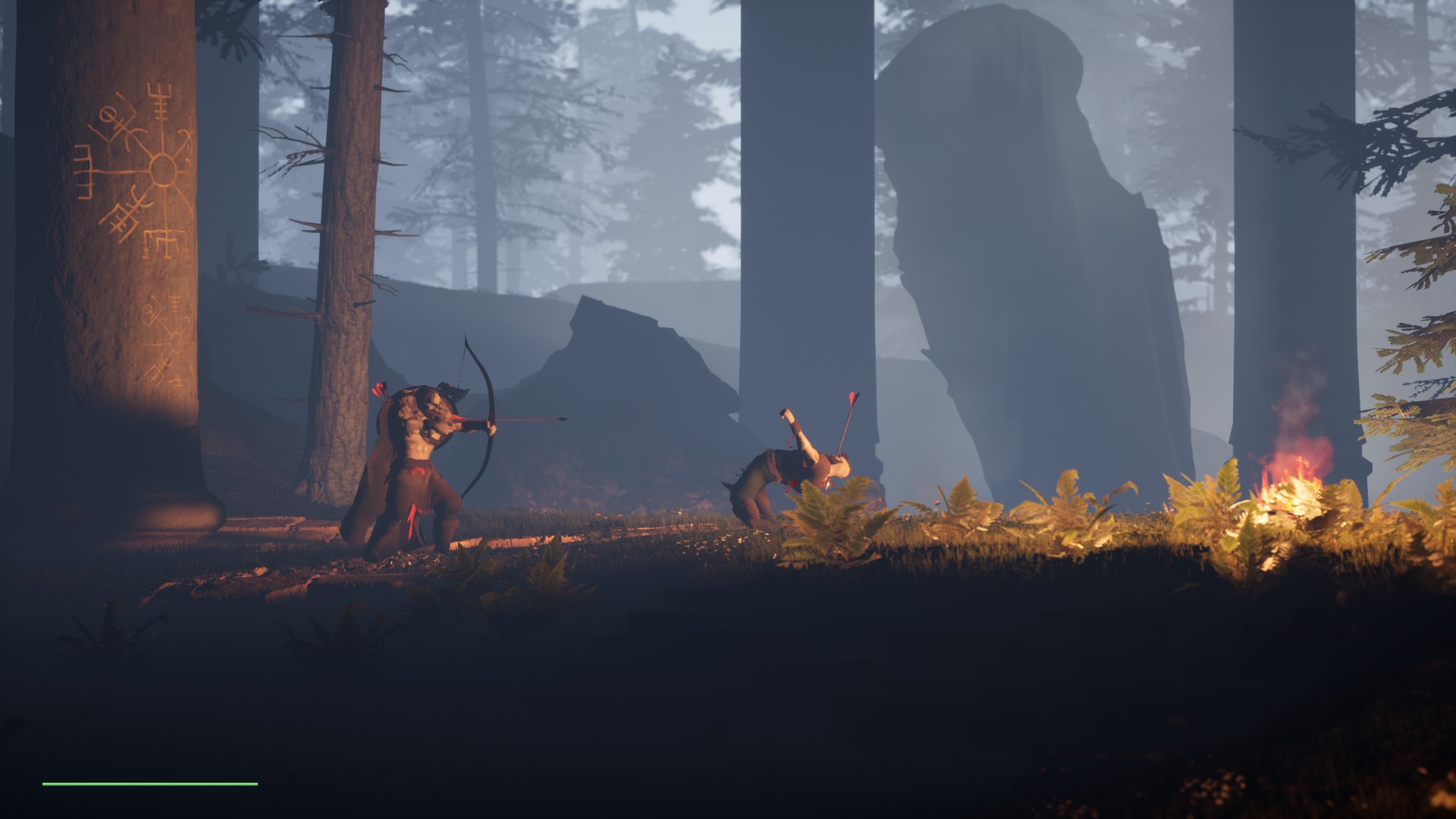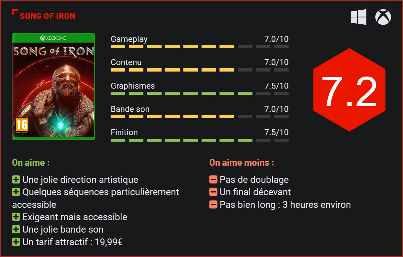 Parmi les titres indépendants attendus cet été sur PC et Xbox, Song of Iron figurait certainement tout en haut de la liste de certains joueurs. Le titre de Resting Relic nous avait certainement charmé avec sa direction artistique soignée… Il ne parvient toutefois à convaincre qu’à moitié. Explications. Cet été aura décidément été très chargé pour les amateurs de jeux indés sur PC et Xbox. Après 12 Minutes, Greak, The Ascent, Cris Tales et Death’s Door, voici un autre prétendant au titre du meilleur jeu indé de l’été qui débarque. Song of Iron aura fait couler beaucoup d’encre depuis son annonce. Il faut dire qu’artistiquement, le titre de Resting Relic a de quoi charmer la rétine avec son univers sombre et ses jeux d’ombres chinoises. Artistiquement, le jeu est une franche réussite. Le studio a choisi de concentrer ses efforts sur le gameplay, plutôt que la narration, qui passe ici au second plan. On incarne un guerrier viking aguerri qui va se retrouver malgré lui au cœur d’une terrible machination. Pas de cinématiques à l’horizon, quelques brefs dialogues seulement, qui n’ont même pas été doublés… Song of Iron est une expérience de jeu minimaliste qui mise tout sur son univers. Car ici, ce sont les superbes décors qui nous racontent une histoire, celle des valeureux guerriers vikings qui arpentèrent un jour les monts enneigés de la Scandinavie, celle aussi des mythes et légendes locaux. Les combats sont techniques, mais pas trop. Le jeu de Resting Relic prend la forme d’un beat them all en 2.5D. Les décors sont en 3D, mais le joueur se déplace sur un axe latéral. Par rapport à un Streets of Rage, le jeu se veut plutôt technique. Il faudra ici apprendre à maîtriser l’esquive et l’usage du bouclier pour parer les coups de ses adversaires. A votre disposition : un large arsenal d’armes qui vont de la hache de guerre à l’épée en passant par l’arc à flèches. Chaque type d’ennemi a sa faiblesse. L’arc se révélera inefficace face à un opposant armé d’un bouclier. En dehors de quelques guerriers, vous devrez aussi affronter différents types de créatures du folklore local. S’il se veut exigeant dans un premier temps, Song of Iron reste toutefois beaucoup plus accessible qu’un souls-like. La mort n’est ici synonyme que de quelques secondes de jeu perdues, tout au plus. La simplicité de ses commandes fait également qu’on apprend vite à maîtriser les rouages du métier. A ce titre, on pourra d’ailleurs regretter que la difficulté ne soit pas un peu plus corsée et que les combats de boss manquent globalement de piquant. Certains panoramas sont superbes. Entre les combats, Song of Iron alterne les séances contemplatives avec ses jolis panoramas et quelques séquences de plates-formes. Rien de bien compliqué en soi. Elles ont toutefois le mérite d’apporter un peu de diversité. Dans l’ensemble, on regrette toutefois que le jeu soit aussi court – comptez 3 heures environ pour en voir le bout -, et que l’aventure se termine sur une note qui ne plaira pas à tous, avec un changement de ton assez radical. Song of Iron est une expérience de jeu très prenante du début à la fin, et si le jeu est globalement très réussi, on ne peut s’empêcher de penser qu’il aurait été possible de faire encore mieux avec un peu plus de patience et de moyens. Certains aspects du jeu, comme sa narration, ont été bâclés. Le gameplay est solide, mais souffre également de quelques errances. La roulade a tendance à vite devenir votre meilleur allié puisqu’elle vous permettra d’éviter littéralement tous les coups de votre opposant et de le prendre rapidement à revers. Les à-côtés sont également peu nombreux et la rejouabilité forcément très limitée. Pour un petit titre indépendant, Song of Iron parvient toutefois à nous proposer une expérience de jeu singulière, qui nage à contre-courant des plus grosses productions, avec des séquences de jeu souvent contemplatives et un univers plein de charme. L’arc à flèches devient vite une arme incontournable. Techniquement, le constat est également plutôt positif. La direction artistique du jeu est superbe, le titre adopte une patte graphique unique qui lui donne une personnalité à part. On regrette en revanche que certains décors ne soient pas aussi réussis. Dès que le jour pointe le bout de son nez, le jeu a tendance à paraître un peu moins joli. On ressent un manque de détails dans les modélisations de certains objets, comme les arbres ou les habitations en arrière-plan. Même topo pour ce qui est de la bande son, qui souffle le chaud et le froid, avec des musiques très réussies mais aucun doublage, et des sous-titres très mal intégrés à l’écran… On le sent, le jeu a été fini un peu à la hâte. Conclusion S’il fait l’impasse sur la narration pour se concentrer sur l’expérience de jeu, Song of Iron n’en reste pas moins un jeu marquant, en grande partie grâce à sa superbe direction artistique et son jeu d’ombres chinoises. Dans la peau d’un guerrier viking, le joueur se retrouve livré à lui-même face à des hordes de barbares sanguinaires et devra tenter de survivre en s’enfuyant dans la forêt. Classique dans son approche du genre, le titre n’en reste pas moins très plaisant à parcourir avec ses combats techniques, ses séquences de jeu variées qui alternent affrontements, exploration et plates-formes, et surtout, ses superbes panoramas, qu’on ne se lasse pas d’admirer tout au cours du périple. Tout est bien sûr loin d’être parfait. Le jeu se boucle en quelques heures seulement, le final déçoit et on ne peut s’empêcher de penser que le titre aurait sans doute été beaucoup plus marquant si son créateur avait eu le temps de travailler un peu plus sa présentation. L’interface paraît souvent trop dépouillée. Song of Iron n’en reste pas moins un titre pre