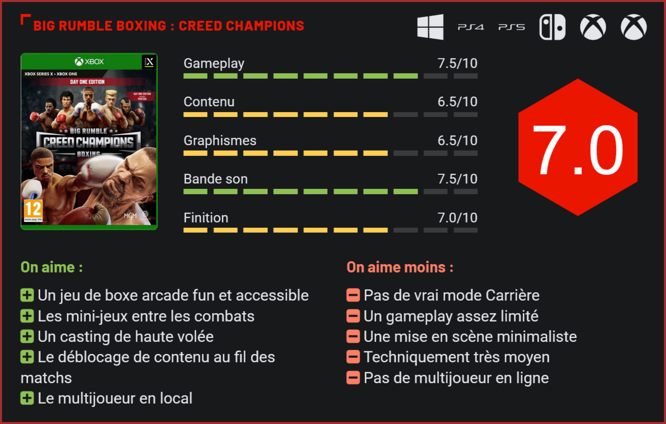 Trois ans après le sympathique Creed: Rise to Glory, les développeurs du studio Survios nous signent un nouvel épisode, qui délaisse cette fois la réalité virtuelle pour ce bon vieux pad. Vous vous souvenez sans doute de Creed: Rise to Glory, une adaptation plutôt réussie du film Creed en jeu vidéo, qui présentait la particularité de n’être jouable qu’en réalité virtuelle. Cette disponibilité limitée avait forcément réduit les chances du studio de toucher une large audience, raison qui les a probablement poussés à revenir à la charge avec Big Rumble Boxing. Finale d’anthologie entre Rocky et Drago. Car dans le fond, Big Rumble Boxing: Creed Champions est très proche d’un portage du jeu précédemment cité. Les développeurs ont repris la même formule, rangeant de côté l’immersion procurée par la VR pour nous livrer un jeu de baston purement arcade qui se joue entièrement au pad. Autant le dire tout de suite, Big Rumble Boxing n’a rien en commun avec un Fight Night. Il s’agit d’un jeu de boxe purement arcade. Il ne faut pas plus de quelques minutes pour mémoriser les commandes. Une touche est attribuée aux frappes légères, une aux frappes lourdes, une aux choppes, et puis, il y a bien sûr les coups spéciaux et les combinaisons. Alors oui, on pourra lui reprocher d’être peut-être un peu trop accessible, mais la bonne nouvelle, c’est que le jeu parvient à surprendre par la diversité de son casting et leurs différences de prise en main. Chaque personnage se joue ici très différemment avec des personnages qui sont plus axés sur la vitesse et d’autres davantage sur la force de frappe. Des mini-jeux entrecoupent les combats. Pas de mode carrière, on retrouve un seul mode arcade, dans lequel on pourra choisir le personnage de son choix pour participer à une série de combats. On retrouve des personnages cultes de la saga comme Creed, Rocky Balboa ou Drago, et d’autres moins connus. Chaque “carrière” est composée d’une demi-douzaine de combats, entrecoupés de mini-jeux basés sur le rythme. Il faudra courir le plus rapidement sur un tapis en alternant les pressions sur les gâchettes, frapper en rythme sur un cadavre d’animal ou s’entraîner avec son coach. Divertissant, à défaut d’être révolutionnaire. Les combats consistent en une succession de matchs durant lesquels il faudra mettre K.O. son adversaire en faisant chuter à zéro sa barre de vie. Il faut généralement entre 3 et 4 K.O. pour remporter la partie. Globalement, le jeu est très fun à jouer. L’accent est mis sur la défense, les contres et les coups spéciaux, qui ravagent la barre de vie de l’adversaire. Ca manque peut-être un peu de technicité, mais même un amateur de jeu de baston y trouvera son compte. La force du jeu, c’est de proposer un mode Arcade qui permet de débloquer de nombreux personnages, skins et combats inédits. Chaque run est différent. Clairement, l’accent n’est pas mis sur la narration. On regrette même clairement que le jeu n’offre pas davantage à ce niveau, avec des dialogues plats censés amener un minimum de background aux histoires de chacun des protagonistes. Le jeu se rattrape toutefois niveau gameplay avec des matchs riches en rebondissements et du fun à ne plus savoir qu’en faire. L’écriture est atrocement plate. Si l’on regrette l’absence d’un vrai mode solo, et d’un mode multi en ligne, le mode Arcade propose toutefois largement de quoi s’occuper pendant un moment et le mode multi en local est idéal pour le couch-gaming. A 39,99€, le contenu paraît suffisant pour justifier le tarif. On n’aurait pas été contre davantage de modes de jeu, mais force est de constater qu’on a déjà largement de quoi s’occuper. La réalisation du titre surprend également agréablement. Ingame, le jeu est plutôt joli, malgré son look un peu trop cartoonesque. Les effets visuels sont soignés, l’animation est fluide, les stades fourmillent de détails. Certains éléments sont toutefois un peu moins réussis, à l’image du public, notamment. La bande son n’est pas en reste avec tous les classiques de la série, dont l’incontournable Eye of the Tiger, et des doublages en anglais officiels. Les stades sont relativement variés. S’il s’adresse en définitive davantage aux néophytes qu’aux passionnés de boxe, Big Rumble Boxing comble un manque profond chez les amateurs de jeux de combat arcade. Le titre n’est d’ailleurs pas sans rappeler l’excellent Ready 2 Rumble, sorti à l’époque sur Dreamcast. Fun, accessible, plaisant à jouer et sans prise de tête, voilà un jeu de baston qui animera les soirées entre amis, sans nécessiter des heures d’entraînement. Il ne brille ni au niveau de sa réalisation, ni au niveau de son gameplay ou de son contenu, mais remplit parfaitement son office et s’impose comme un jeu très fun. Difficile toutefois d’être déçu, dans la mesure où on ne s’attendait pas non plus à grand chose de sa part… Conclusion On n’en attendait pas grand chose. Finalement, Big Rumble Boxing: Creed Champions est une très bonne surprise. Le jeu de baston en 3D de Survios est à la fois fun et très accessible. Il se destine avant tout au grand public, mais pas que. Car si son gameplay est peut-être un peu trop simpliste pour les amoureux du genre, les différents personnages qui nous sont proposés se contrôlent tous différemment et ont tous leur propre style. On est très loin ici d’une simulation de boxe. Beaucoup plus proche d’un Tekken que d’un Fight Night, Big Rumble Boxing est un jeu de baston fun et sans prise de tête. Il propose un contenu relativement léger : pas de multi en ligne ni de vrai mode carrière à l’horizon. Mais son système de progression fait qu’on prend un plaisir à parcourir l’histoire de chaque personnage pour débloquer de nouveaux combattants. A défaut d’être jouable en ligne, il est jouab