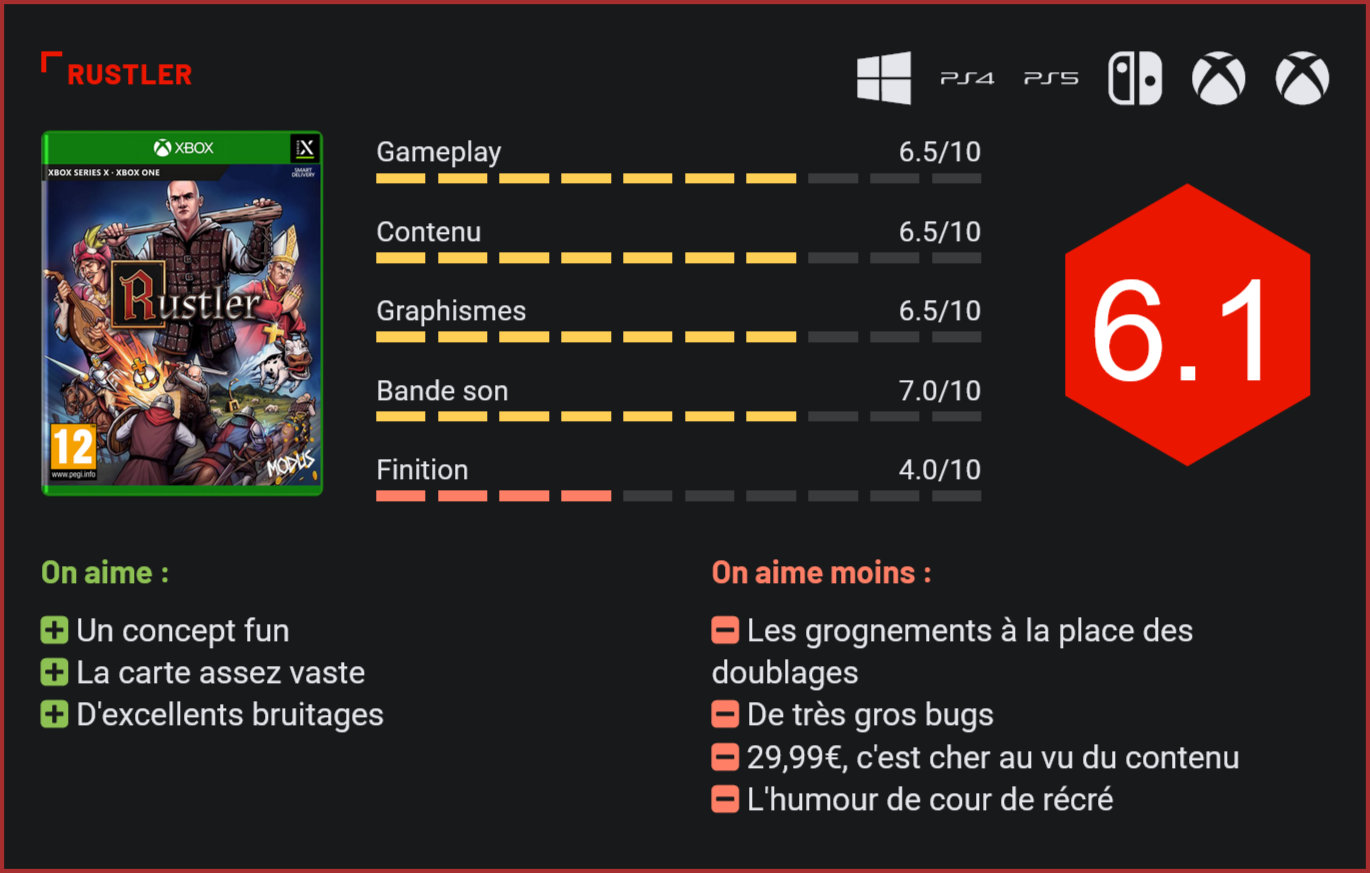 Nouveau projet des créateurs du sympathique 911 Operator, Rustler est un GTA-like à l’ancienne qui joue la carte du fun, dans un univers médiéval complètement délirant. Connu surtout pour ses jeux grand public qui prennent place dans un univers fantaisiste, l’éditeur Modus Games tente une approche sensiblement différente avec Rustler, un petit jeu indépendant qui se veut un hommage aux premiers Grand Theft Auto. Le public cible est donc radicalement différent d’un Trine. Irrévérencieux, Rustler joue avec les codes du genre et n’hésite pas non plus à tomber dans un humour cracra pour séduire son public. Si la formule est séduisante, le titre est toutefois loin de convaincre… L’univers du jeu est plutôt fun. Tout d’abord parce que, si sur le papier le principe était séduisant, l’immersion est loin d’être réussie, avec un protagoniste principal sans aucune personnalité, un scénario creux et une mise en scène minimaliste. Tout l’intérêt de Rustler repose sur son gameplay et non pas sa narration. Il faudra d’ailleurs composer avec un humour peu inspiré, qui a tendance à souvent tomber dans le pipi-cracra. Pad en main, le jeu est pourtant plaisant. On y incarne un manant qui va être amené à réaliser toute une série de quêtes aux quatre coins du royaume. Des missions d’assassinat, du vol, de l’infiltration… En terme d’expérience de jeu, on est très proche en effet des premiers Grand Theft Auto, avec une vue du dessus qui donne un très bel aperçu de l’action, une carte gigantesque, remplie de points d’intérêt, et des missions principales et secondaires qui vous amèneront à faire des allers-retours incessants. La particularité de Rustler, c’est qu’il prend place dans un univers médiéval. Pas de voiture donc ni de mitrailleuses, il faudra chevaucher ici des montures, utiliser un arc, une arbalète, une hallebarde ou une hache. Dans le fond, ça ne change pas grand chose. Rustler se joue véritablement comme un Grand Theft Auto, à la seule différence qu’il ne se prend pas du tout au sérieux. De nombreuses compétences peuvent être débloquées. Comme dans un Grand Theft Auto, le joueur sera amené à prendre part à des missions secondaires parfois très funs. Par exemple, il sera possible de participer à des combats en arènes pour gagner des crédits. Egalement, le jeu propose des défis plus idiots, comme effrayer les passants en incarnant “la mort”. C’est fun durant un moment, mais ça devient forcément vite répétitif. D’autant plus que les mécanismes de jeu restent globalement trop calqués sur ceux de GTA. Par exemple, il faudra faire repeindre sa monture après une course poursuite pour passer inaperçu. Contrairement à un GTA, la finition lui fait toutefois défaut. Rien ne vous empêchera dans Rustler de changer la couleur de votre monture tout en étant poursuivi… Auquel cas, vos poursuivants oublieront immédiatement pourquoi ils étaient à votre poursuite, une fois sorti du tunnel… Le jeu est malheureusement rempli de bugs et d’approximations. L’IA est d’ailleurs catastrophique. Il ne sera pas rare de voir un garde qui vous poursuivait changer soudainement de direction sans aucune raison apparente. Dans notre progression, nous nous sommes également retrouvés coincés par un élément des décors, sans aucune option de chargement ou de réinitialisation, ce qui nous a poussé à devoir recommencer l’aventure… Le monde ouvert de Rustler propose un cycle jour/nuit. S’il est sympa à parcourir, Rustler n’est donc pas un grand jeu : le titre est très mal fignolé, sa structure est très répétitive et l’aventure principale s’expédie en quelques heures seulement. A 29,99€, on y réfléchit donc à deux fois avant de craquer. La bonne nouvelle, c’est que les développeurs promettent de corriger les principaux bugs du jeu au fil des mises à jour. Un patch day-one était d’ailleurs disponible dès la sortie. Côté technique, le jeu s’en sort également plutôt bien. Les visuels sont agréables à la rétine, le monde de Rustler offre suffisamment de variété pour pousser le joueur à la découverte et certains effets visuels surprennent même agréablement. Ne vous attendez toutefois pas à une claque graphique, il s’agit d’une petite production indépendante. On notera d’ailleurs que s’il est noté comme “optimisé pour next-gen”, ladite optimisation reste minimaliste. La bande son ne parvient également à convaincre qu’à moitié avec quelques musiques d’ambiance sympathique, d’excellents bruitages, mais de simples grognements en lieu et place des doublages, un peu à la façon des jeux Rare des années 90. Ca a son charme dans un platformer rétro, beaucoup moins dans un GTA-like. Conclusion Malgré un concept séduisant – Rustler lorgne du côté d’un Grand Theft Auto rétro, dans un univers médiéval -, le nouveau jeu de Jutsu Games peine à convaincre, la faute à un humour très cracra, un univers sous-développé et une abondance de bugs, parfois très gênants puisqu’ils iront jusqu’à vous forcer à recommencer l’aventure dans certains cas, faute de sauvegardes multiples. Pad en main, Rustler est pourtant plutôt plaisant à parcourir les premiers instants. On y dirige un manant chargé de basses besognes dans un univers médiéval totalement délirant. En plus des quêtes principales, le joueur sera amené à participer à des activités secondaires décalées. Occasionnellement grisant, le titre souffre toutefois d’une finition désastreuse qui finit par entacher l’expérience de jeu, que ce soit au niveau de l’IA, des bugs ou de la contextualisation. A 29,99€, ça fait tout de même un peu cher payé le délire.