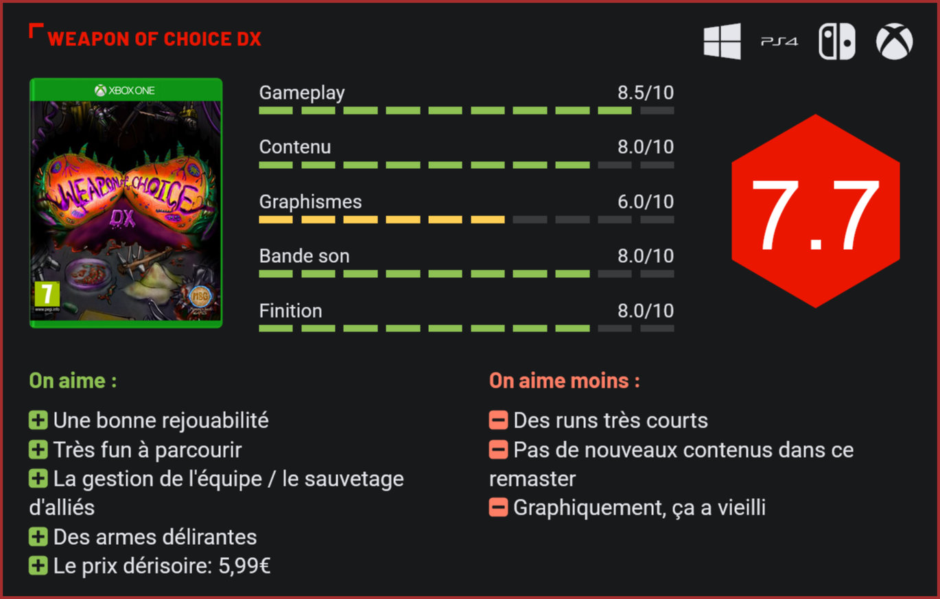 Après Explosionade DX et Shoot1UP DX, l’éditeur Mommy’s Best Games nous livre le remaster d’un autre de ces classiques méconnus du shoot them up avec Weapon of Choice DX, une parodie délirante de l’excellent Contra. Run and Gun indépendant sorti en 2008 sur PC et Xbox 360 (dans la catégorie des indies), Weapon of Choice était parvenu à se forger une solide fan base avec son univers décalé et son gameplay grisant. S’il s’inspire de classiques du genre comme Metal Slug ou Contra, Weapon of Choice ne se prend pas du tout au sérieux et n’hésite pas non plus à s’en distinguer avec des idées rafraîchissantes. La patte graphique est très particulière. Tout d’abord parce qu’ici, vous n’incarnerez pas un seul personnage mais sept différents, qui se jouent tous différemment et disposent d’un arsenal qui leur est propre. Ensuite, parce que le jeu ne se prend pas du tout au sérieux et n’hésite pas à proposer un univers complètement délirant, avec des créatures aux looks parfois ridicules et une patte graphique sous LSD. Enfin, parce que le créateur du jeu n’a pas non plus hésité à introduire des tas d’idées totalement délirantes dans son jeu. pas de barre de vie par exemple, vous n’avez qu’une seule et unique chance de briller dans Weapon of Choice. Le jeu se révèle toutefois permissif puisqu’à l’approche d’un ennemi, le temps sera ralenti pour vous permettre de prendre les bonnes décisions. En cas de décès de l’un des membres de l’équipe, vous pourrez d’ailleurs venir le secourir avec un second personnage. La construction des niveaux surprend également par leur verticalité et les façons de se déplacer, que ce soit en utilisant des bras mécaniques pour s’agripper aux décors ou glisser sur le dos d’une étrange créature. Le jeu fait preuve d’une originalité débordante. Originalité qu’on retrouve jusque dans l’arsenal, complètement délirant lui aussi, avec des armes blasters qui vous serviront tant à canarder vos ennemis qu’à vous projeter dans les airs… Certains ennemis sont gigantesques! Pad en main, le jeu est très fun à parcourir, malgré les imprécisions du gameplay. Les parties ne durent toutefois guère plus de 20 minutes. Vous bouclerez en effet l’aventure principale en 20 minutes top chrono. Weapon of Choice DX offre toutefois une expérience de jeu très solide puisqu’il est possible d’emprunter plusieurs parcours et d’incarner plusieurs personnages aux capacités bien différentes. Il offre ainsi une excellente rejouabilité. Le prix dérisoire de 5,99€ auquel le jeu est vendu est donc pleinement rentabilisé. On regrette toutefois que ce remaster n’intègre aucun nouvel ajout niveau contenus. Le développeur s’est contenté de moderniser un peu l’esthétique très rétro du jeu pour que le tout s’affiche correctement sur nos écrans 4K / HDR. Malheureusement, ce remaster n’intègre aucun nouveau contenu. Forcément, le jeu a vieilli. En 2008 déjà, Weapon of Choice n’était pas vraiment une claque graphique. L’animation est ultra-rigide, les modélisations grotesques, mais le tout exerce un charme très étrange. Car Weapon of Choice, c’est un peu un Contra sous LSD. Les combats y sont intenses, l’expérience de jeu est fun et on se surprend à enchainer les parties jusqu’à débrancher la console à 3 heures du mat’. Clairement, Weapon of Choice DX s’adresse toutefois à un public très spécifique : les amateurs de shoot them up rétro qui étaient passé à côté de cette petite pépite en 2008. Il faut dire que le jeu n’était pas sorti au format Arcade comme la plupart des jeux de l’époque sur Xbox 360, mais parmi les productions indépendantes. Le retrouver aujourd’hui dans une version remasterisée sur les consoles de dernière génération est un véritable plaisir coupable pour les amateurs du genre, tant le titre sait se montrer rafraîchissant. Conclusion Parmi les shoot them up les plus inventifs et les plus délirants que vous pouvez trouver actuellement sur le marché, Weapon of Choice DX est sans l’ombre d’un doute l’un des meilleurs titres du catalogue de l’éditeur Mommy’s Best Games. Comme Shoot1UP, Weapon of Choice fait partie de ces shooters sortis initialement sur Xbox 360 et passé relativement inaperçu parce qu’il n’était disponible que sur le store des indés. Ce remaster sur consoles est donc une bénédiction pour les amateurs du genre, qui découvriront un titre très fun à parcourir, à l’ambiance complètement décalée, et qui n’hésite pas à jouer avec les codes du genre. S’il s’apparente à un Contra, Weapon of Choice sait se forger sa propre identité. Pas de barre de vie par exemple dans ce run and gun, ni de progression linéaire. Le créateur du jeu a fait preuve de beaucoup de créativité avec ce titre, avec un level design très vertical, un gameplay inventif et un univers décalé, peuplé de créatures aussi colorées que gigantesques. A 5,99€, Weapon of Choice est un joli délire à découvrir absolument pour les amateurs du genre. Il compense sa durée de vie très courte (un run se termine en 20 minutes top chrono), par une excellente rejouabilité grâce notamment à son système de progression unique à travers les niveaux. On regrette toutefois un élément principal : l’absence de nouveaux contenus dans ce remaster, qui se contente, pour le coup, du minimum syndical.