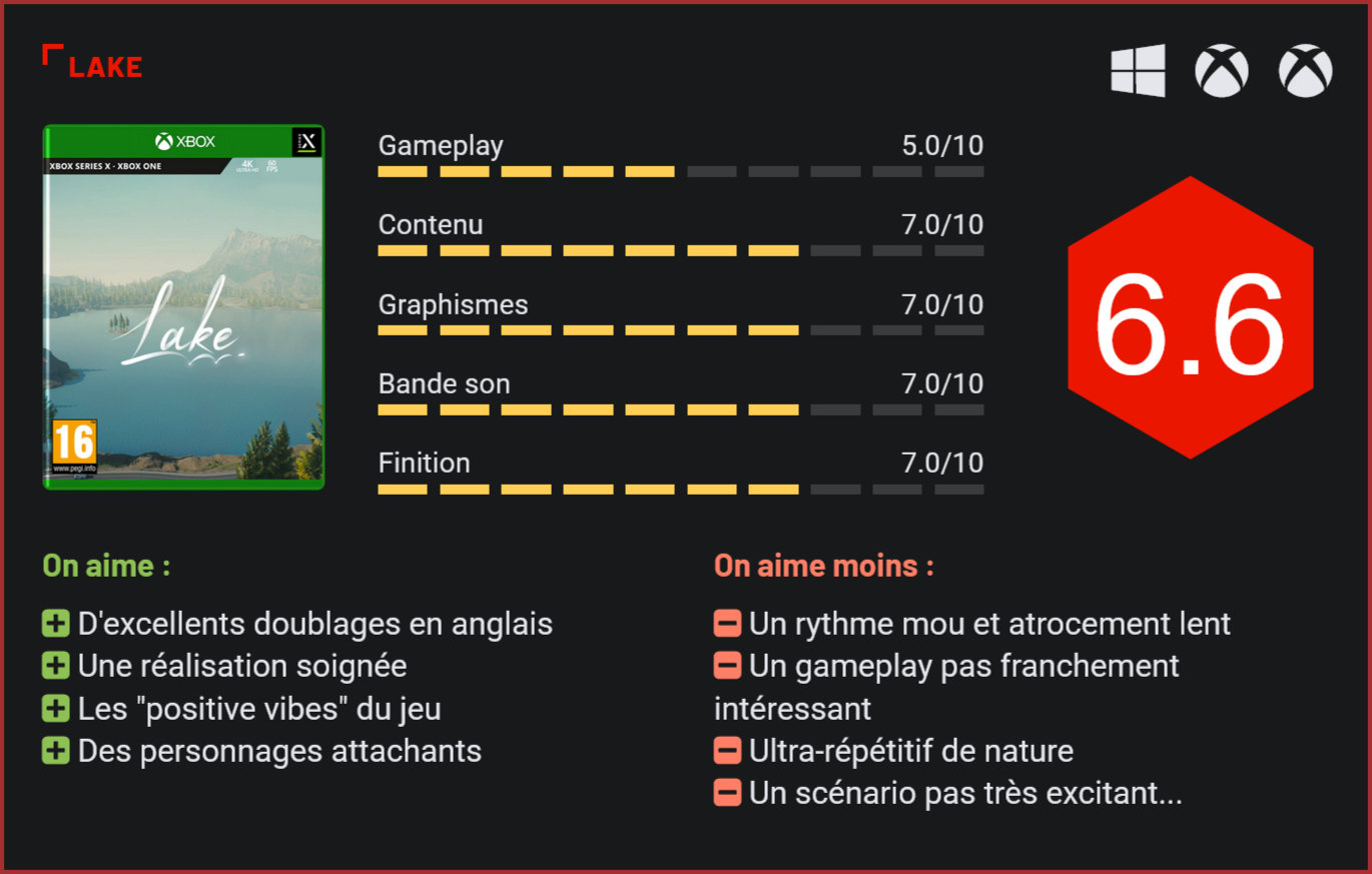 A côté des Call of Duty et autres shooters proposant une expérience de jeu intense, il existe une autre catégorie de jeux, pensés, eux, pour se relaxer. C’est dans cette catégorie qu’entre Lake, un jeu narratif qui nous propose d’incarner une programmeuse qui décide de tout plaquer pour se ressourcer à la campagne… Envie de se ressourcer entre deux grosses productions? Lake est potentiellement le titre qu’il vous faut. Si son concept ne vous repousse pas totalement. Car il faut bien l’avouer, les jeux narratifs ne sont pas la tasse de tous. Plus encore lorsqu’ils se veulent avant tout introspectifs. Vous allez livrer des tas de paquets et lettres dans ce jeu! La nouvelle production du studio néerlandais Whitehorn Digital vous propose d’incarner Meredith Weiss, une quadragénaire qui choisit de tout plaquer pour revenir dans sa ville natale, une petite bourgade de l’Oregon baptisée Providence Oaks. Développeuse informatique, Meredith a tout réussi dans la vie. Mais son retour dans sa ville natale va tout changer… Pendant deux semaines, elle va se reconnecter avec de vieilles connaissances, faire de formidables rencontres, et parfaitement épouser une nouvelle carrière, celle d’un livreur de courrier. De retour à Providence Oaks, Meredith se décide en effet à remplacer son père dans son travail durant la durée de son séjour. Si Lake se veut avant tout un titre narratif, tout son gameplay repose sur un petit monde ouvert construit autour d’un lac. Le joueur est ici totalement libre de ses mouvements. Chaque jour, il devra prendre le contrôle d’une camionnette, arpenter les rues de Providence Oaks et livrer ses colis et lettres aux habitants du coin. Le gameplay du jeu est très répétitif par nature, mais ces séquences de jeu n’en restent pas contemplatives et idéales pour l’introspection. Rempli de bonnes intentions, le titre mise avant tout sur les connections que le joueur fera avec les habitants de la petite bourgade. A travers des choix de dialogues, il pourra faire évoluer ses relations avec les locaux, et dans certains cas leur prêter main forte. Ces petites histoires se rejoignent toutes d’une façon ou d’une autre, et influenceront forcément votre décision en fin de partie. Retournerez-vous en ville pour poursuivre votre carrière ou abandonnerez-vous tout pour de bon pour mener une existence paisible à la campagne? A travers ses dialogues – très bien écrits – et ses nombreuses interactions, le jeu joue la carte de l’introspectif, avec des situations comparables à celle que chacun vit dans la vie de tous les jours. Avec ses personnages attachants et ses vibrations très positives, Lake séduit. La réalisation très soignée du jeu, qui rappelle celle d’un film d’animation de Pixar, lui donne une identité très particulière. Lake se distingue également des autres jeux narratifs par son rythme tout d’abord, très lent, qui laisse beaucoup de place pour la réflexion lors des longues promenades en camionnette, ses paysages bucoliques et son atmosphère très paisible. Jamais vous ne ressentirez ici le moindre stress. Voici le véhicule que vous conduirez aux quatre coins de la petite bourgade. S’il est tout à fait possible de suivre le cheminement tracé par les développeurs, le joueur pourra également investir un peu plus de temps dans l’expérience et prendre le temps de connaître chaque habitant de la petite bourgade. Ce qui ouvrira la porte de quêtes annexes… En vous liant d’amitié avec une vieille dame, celle-ci vous demandera peut-être d’amener l’un de ses chats chez le vétérinaire… Ce qui ouvrira un nouveau pan du scénario du jeu. Forcément, tout le monde n’accrochera pas au concept. Sous ses airs de GTA-like en open-world, Lake est en réalité un jeu très calme, dans lequel il ne se passe pas grand chose, et dont le scénario reste ancré dans une réalité très paisible. Ne vous attendez pas ici à des révélations surprenantes, Lake reste avant tout un jeu introspectif, qui pose davantage de questions qu’il n’y répond. Avec son univers délicieusement 80’s, ses décors colorés et ses dialogues soignés, le jeu a plus d’une corde à son arc pour séduire. D’autant plus qu’il est vendu sous la barre des 20€. Attention toutefois, il n’existe pas encore de version française ni même de traductions sous-titrées. Le titre se joue entièrement en anglais pour le moment. Malgré son charme, il convient également de se poser les bonnes questions avant de se lancer dans cette aventure. Lake a beau être un jeu fondamentalement très réussi, le manque d’enjeux dans son aventure et son rythme très lent le destinent à un public cible bien particulier. Conclusion Expérience avant tout narrative, Lake se présente comme un jeu introspectif qui alterne de longs dialogues très bien écrits avec les habitants d’une petite bourgade de l’Oregon et des séquences de jeu plus contemplatives, au volant d’une camionnette, qui seront l’occasion pour prendre le temps de réfléchir paisiblement. Très chill dans son ambiance, le jeu de Whitehorn Digital pose les bonnes questions. Vous y incarnerez une programmeuse qui a tout réussi dans la vie et qui décide de tout plaquer pour revenir dans sa ville natale et y aider son père dans son travail. Elle devra, durant deux semaines, assurer les livraisons de colis et de lettres à sa place. Avec son open world plein de charme, ses décors enchanteurs et ses nombreuses personnages à la personnalité bien trempée, Lake a plus d’une corde à son arc pour séduire. Son rythme très lent, la répétitivité des séquences de jeu et son scénario introspectif le destinent toutefois à un public bien particulier. Le jeu a en tout le cas le mérite de nous faire réfléchir et remettre en question certaines de nos propres décisions…