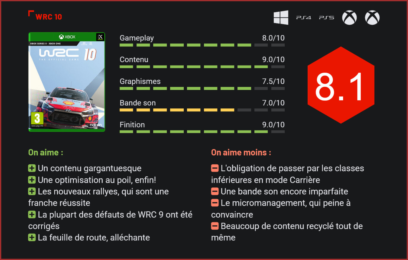 Après un neuvième volet décevant, surtout au niveau de sa finition, la série des WRC fait son grand retour avec un épisode anniversaire qui surprend par l’abondance et la qualité de son contenu. Cette fois, c’est sûr, c’est la bonne! La série des WRC de Nacon a toujours eu du mal à percer malgré des qualités évidentes. Passée des mains de Milestone à celles de KT Racing, la série est parvenue à montrer un réel potentiel ces dernières années. Bourré de bonnes idées, les derniers épisodes n’étaient toutefois pas exempts de défauts. Notamment, au niveau de la finition. L’arrivée des consoles next-gen représentait un joli espoir pour la franchise, d’enfin s’affranchir de ses démons. S’il faudra se montrer patient pour un épisode qui tirera vraiment parti des capacités des consoles next-gen, ce dixième volet est une franche réussite à presque tous les niveaux. L’Estonie fait partie des nouvelles destinations. La série de Nacon a connu des hauts et des bas. WRC 8 et WRC 9 avaient pu montrer un réel potentiel en introduisant toute une série de nouveautés majeures pour la franchise avec, en vrac, un nouveau mode carrière, l’introduction de la météo dynamique et un moteur de jeu entièrement repensé. Le dernier volet de la série souffrait toutefois d’un gros manque de finition. L’éditeur français Nacon était bien décidé à marquer le coup pour cette édition anniversaire. Le studio KT Racing a donc mis les bouchées doubles. Reste que, le doute planait sur les qualités de ce dixième volet, avec la pandémie qui a lourdement affecté le développement de nombreux titres. On ne va pas vous le cacher, WRC 10 recycle de nombreux éléments des deux précédents volets : plus de la moitié des tracés qui nous sont proposés sont identiques à celles des cuvées 2019/2020. L’interface et le mode carrière n’ont pratiquement pas évolué. KT Racing a toutefois réalisé un très gros travail au niveau de la finition pour cet épisode, qui tire un trait sur les bugs graphiques, le clipping et les quelques ralentissements du précédent volet. Les éléments des décors s’affichent tous bien à l’avance. Plus de “pop-up” de certains éléments au dernier moment, ni de clipping, comme on pouvait en constater si souvent dans la dernière mouture de la série. Le jeu tourne également en 120 Hz dans des conditions vraiment optimales. Plus de ralentissements ni de clipping, le jeu est d’une fluidité exemplaire. Côté graphique, on remarque également une jolie évolution, principalement au niveau de l’éclairage. Dans WRC 9, on avait constamment cette désagréable sensation que les décors étaient continuellement surexposés. Ce n’est plus le cas dans WRC 10. Les contrastes sont beaucoup mieux gérés et le rendu est beaucoup plus agréable à la rétine. Le jeu n’est pas pour autant une claque graphique. Il semble d’ailleurs utiliser le même moteur que WRC 9. Côté technique, ce sont surtout les effets visuels et la météo qui impressionnent. Le moindre rayon de soleil qui traverse le feuillage nous laisse pantois d’admiration. Les modélisations de certains éléments du décor – notamment le public et les véhicules le long des routes – contrastent avec la beauté des paysages qui s’affichent désormais à perte de vue. On s’en doute, WRC 10 est encore un épisode transitif. Il faudra sans doute attendre la prochaine cuvée pour une véritable évolution. Mais les petites retouches apportées à cet épisode ne lui donnent pas moins une belle allure! Visuellement, le jeu est très propre. WRC 10 surprend également agréablement au niveau de son contenu. Les précédentes éditions du jeu proposaient déjà un contenu gargantuesque avec des modes course rapide, des modes de jeu en ligne, la création de clubs, un mode carrière, des saisons et bien plus encore. WRC 10 va encore plus loin avec un nouveau mode Anniversaire qui introduit le joueur à une succession de défis au volant de véhicules iconiques de la franchise, sur des spéciales longues qu’ils ne croiseront pas forcément dans le mode carrière. Ledit mode est une franche réussite. Les amoureux du rallye se feront en effet un réel plaisir de prendre le volant de ces véhicules iconiques sur des tracés qui ne le sont pas moins. La difficulté est relevée de plusieurs crans par rapport au mode carrière, avec des bolides beaucoup plus difficiles à maîtriser et qui présentent tous leurs propres particularités. L’épine dorsale du jeu reste son mode carrière, assez contraignant au demeurant puisqu’il faudra commencer tout en bas de l’échelle même si vous êtes un habitué de la franchise. Ledit mode se révèle toutefois particulièrement savoureux sur la durée avec ses 120 spéciales, ses 52 équipes, ses épreuves variées et son micromanagement. La formule n’a que très peu évolué mais on note toutefois quelques petites nouveautés qui font mouche. Il est ainsi possible de personnaliser davantage encore l’expérience en optant pour des épreuves plus courtes ou plus longues et en paramétrant dans les moindres détails la difficulté et l’impact des dégâts sur la tenue de route du véhicule. A ce titre, WRC 10 parvient à réconcilier puristes et amateurs de jeux d’arcade avec une formule qui s’adapte à tous les publics. Côté micromanagement, il faudra toujours gérer son agenda en choisissant les prochaines épreuves. Pour ce faire, il faudra gérer la fatigue de son équipe, prioritiser parfois les maintenances du véhicule pour assurer son bon fonctionnement, et être stratège également, tant avec le recrutement du staff, qui améliorera votre efficacité dans divers domaines qu’avec les “perks” à débloquer avec l’XP, qui permettent par exemple d’améliorer l’adhérence du véhicule, de gagner davantage d’expérience ou d’augmenter sa notoriété. On retrouve d’ailleurs beau