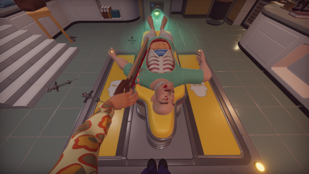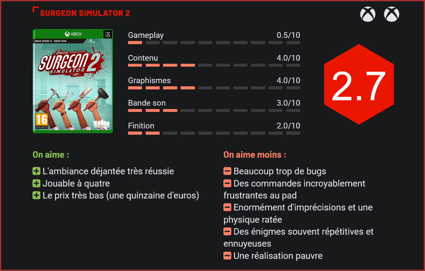 Le deuxième opus de la plus célèbre simulation de chirurgie profite d’une sortie sur consoles. Une opération qui s’annonce bien plus compliquée que prévu. Depuis plusieurs années, les titres de simulation se multiplient sur consoles et PC. Certains sont très bons, d’autres moins. En 2013, la Global Game Jam propose de créer en 48 heures un jeu avec comme thème les battements du cœur. Quatre employés de Bossa Studios travaillent alors sur un simulateur de chirurgie. Surgeon Simulator est né. La petite création est tellement réussie qu’elle est commercialisée. Le succès est au rendez-vous, malgré un gameplay absurde et frustrant. 8 ans plus tard, sa suite voit le jour et connait un succès immédiat sur PC. Depuis le premier opus, pratiquement rien n’a changé au niveau du gameplay. Le titre vous place dans la peau d’un chirurgien déjanté dans un bloc opératoire, devant opérer par tous les moyens possibles et imaginables un patient. Avant cela, une petite énigme vous est proposée pour accéder au bloc ou pour récupérer vos instruments de chirurgie. Le titre est d’une imprécision incroyable, au point d’en devenir frustrant et énervant. Si vous n’avez jamais joué à Surgeon Simulator, sachez que son gameplay est on ne peut plus simple. Votre “héros” ne peut agripper les objets qu’avec un seul bras, que vous contrôlez avec les différentes gâchettes de la manette. Ainsi, utiliser le joystick gauche et la gâchette arrière gauche permet de pivoter le poignet, tandis que l’avant gauche fait avancer ou reculer le bras. En faisant cela, vous pourrez attraper différents objets, comme des marteaux, seringues ou bras et jambes pour ensuite opérer le patient. Sur PC, déjà, le titre faisait preuve d’une imprécision remarquable et relativement décriée. Il était ainsi assez difficile d’attraper les objets, ce qui pouvait créer un sentiment de frustration chez les joueurs. Sur consoles, sachez que le résultat est bien pire, au point d’en être presque injouable. On se bat littéralement avec la manette et les gâchettes pour attraper un objet ou réaliser une opération. Lorsque vous utilisez par exemple une scie pour couper le bras d’un patient, il faut littéralement vous battre avec les joysticks pour couper de manière fluide et rapide. La physique n’est pas non plus bien adaptée, avec des objets qui glissent dès qu’on veut les attraper et qui sont ensuite extrêmement difficiles à prendre en main. Si le concept pouvait donc s’avérer amusant sur PC, l’expérience est un véritable désastre sur consoles. De nombreuses énigmes se dressent devant vous pour avancer dans l’opération. Elles ne sont malheureusement pas toujours bien imaginées. Avant chaque opération, le titre nous demande de résoudre une petite énigme. En observant l’environnement et les objets qui vous entourent, il est bien souvent facile de réussir un puzzle. Cependant, ceux-ci sont, dans leur grande majorité, pas très élaborés ou complexes. Ils sont également bien répétitifs, avec seulement quelques détails qui changent d’une mission à une autre. Un des points positifs de Surgeon Simulator 2 est qu’il peut se jouer intégralement jusqu’à quatre joueurs. Si, seul, on s’énerve bien trop vite et que l’on souhaite au plus vite désinstaller ce maudit jeu et ranger la manette dans l’armoire, la frustration est plus vite remplacée par de l’amusement et des moments de délire lorsque l’on joue entre amis. Mais attention, le gameplay n’est en rien impacté si vous jouez en groupe ou seul. Ainsi, si vous êtes du genre à vite vous énerver et que vous ne voulez pas vous disputer avec vos amis, il serait peut-être préférable de ne pas inviter vos amis à une petite opération dans Surgeon Simulator 2… Si, toutefois, il est un point sur lequel le jeu est plaisant, c’est incontestablement dans sa direction artistique et l’ambiance du titre. Le très léger mode scénario auquel nous avons droit n’est, certes, pas incroyable, mais est terriblement décalé et drôle. Avec un univers cartoonesque et des opérations folles. S’il y a bien un point que l’on appréciera toujours autant dans Surgeon Simulator, c’est son côté fun et décalé. Les opérations prennent toujours un virage absurde. La bande-son est, pour sa part, très moyenne. Les mélodies ne sont pas vraiment variées ni incroyables, et on les entend très vite en boucle lorsque l’on cale sur une énigme ou que l’on ne parvient pas à avancer sur une opération. En revanche, le doublage (anglais uniquement) des personnages de l’histoire est plutôt réussi. Toutefois, on regrettera que les développeurs n’aient pas davantage travaillé sur les visuels du soft. Ce n’est pas très joli, et la 4K des consoles next-gen n’aide en rien. A vrai dire, même sur l’ancienne génération, le titre ne brille pas vraiment par ses visuels. Côté finition, Surgeon Simulator 2 est une vraie calamité. On aurait pu espérer qu’avec plus de moyens et de personnels sur cette suite les bugs soient moins nombreux et notamment moins marqués. Ils sont pourtant bel et bien présents, que ce soit au niveau du gameplay que de l’affichage. Par exemple, en partie multi, le titre ne prenait pas en compte les produits anti saignements injectés dans un personnage ce qui, lorsqu’on lui coupe un membre, cause inéluctablement la défaite. Du côté de l’affichage, certains éléments ne s’affichent pas correctement dans les menus ou temps de chargement. Les temps de chargement sont parfois incroyablement longs, tandis qu’il n’est pas rare qu’on se retrouve bloqué avec un écran noir ou l’écran de chargement. Conclusion Gros succès sur PC, Surgeon Simulator rate complètement le coche sur consoles avec un portage désastreux. Le jeu de chirurgie a beau avoir un concept très séduisant – opérer des patients jusqu’à quatre en coop -,