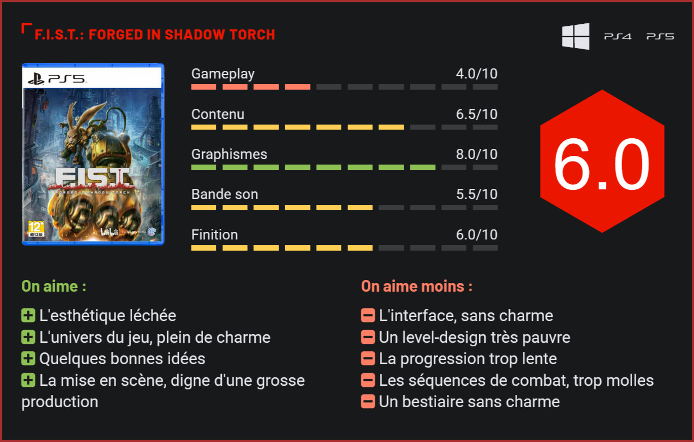 Présenté lors de la dernière keynote de Sony, F.I.S.T.: Forged In Shadow Torch fait partie des exclus du catalogue de la PS4/PS5 sur lesquelles Sony a choisi de miser en cette fin d’année. Le jeu de Shanghai TiGames Network Technology Limited tient-il toutes ses promesses? Pas passé inaperçu lors de la dernière keynote de Sony, F.I.S.T.: Forged In Shadow Torch était l’une des productions indés les plus attendues de la rentrée. Le jeu de Shanghai TIGames débarque en exclu sur PC/PS4 et PS5, en attendant un possible portage sur d’autres plates-formes dans quelques mois. Avec sa direction artistique inspirée et sa réalisation grandiose, le jeu du studio chinois avait plus d’un argument pour séduire. Les phases de combat sont celles qui fonctionnent le moins bien dans F.I.S.T. On ne va pas vous le cacher, F.I.S.T. brille avant tout par sa réalisation splendide. Le jeu tire parfaitement parti des capacités de la PS5 sur next-gen, avec des décors d’une beauté à couper le souffle, qui fourmillent de détails. S’il s’agit d’un metroidvania qui se joue sur un plan en 2 dimensions, l’arrière-plan est très travaillé avec des décors superbes, que ce soit en intérieur ou en extérieur. Il ne sera d’ailleurs pas rare de s’arrêter quelques instants pour admirer la vue. Sa direction artistique inspirée lui donne également une identité qui lui est propre. Plus surprenant encore : malgré son statut de petit jeu indépendant, le titre a bénéficié d’une attention toute particulière au niveau de la mise en scène, avec des séquences animées qui n’auraient rien à envier à celles d’une production de Pixar. Techniquement, F.I.S.T. est réellement très impressionnant. Pad en main toutefois, on finit vite par déchanter. Les développeurs ont opté pour un mélange de genres proche d’un metroidvania. F.I.S.T. comprend quelques séquences de plates-formes, quelques dialogues, un peu d’exploration mais surtout beaucoup de combats. Et c’est là que le bas blesse car dès les premières minutes de jeu, on se rend compte que le titre manque de nervosité par rapport à un Ori par exemple. Notre lapin est d’une lenteur presque dégradante pour son espèce. Les coups prennent plusieurs secondes à sortir et très vite, on en vient à privilégier les attaques qui font le plus de dégâts. La bonne nouvelle, c’est que le gameplay évolue tout au cours de l’aventure, avec de nouvelles attaques et combos à débloquer avec les crédits accumulés. Notre cher lapin gagne également des aptitudes comme le dash dans les airs ou le double saut. Mais s’il se complexifie, le gameplay ne gagne toutefois pas en nervosité. Même après plusieurs heures de jeu, on s’ennuie ferme dans les combats, face à un bestiaire non seulement peu inspiré mais qui manque également de réactivité. Les décors sont d’une beauté à couper le souffle. L’ennui, c’est que si sur le papier, la formule fonctionne, les mécanismes de jeu sont ici très mal huilés. Les séquences de combat sont molles, les séquences de plates-formes courtes et sans réelle imagination et la structure même des niveaux et du level-design est pauvre, avec des allers-retours incessants et des zones de jeu qui se ressemblent toutes. On est très loin de l’excellence d’un Ori. Pour ajouter à notre malheur, le jeu a tendance à souffrir de pics de difficulté. Dès que les adversaires sont plus de deux ou trois à l’écran, il devient très difficile de remporter le combat sans avoir à recommencer plusieurs fois. Chaque type d’ennemi (fantassin de base, guerrier lourd, mitrailleur,…) suit un pattern bien particulier, relativement facile à identifier. Lorsque leur nombre augmente, il devient beaucoup plus difficile de s’y retrouver et on finit souvent par foncer dans le lard sans trop réfléchir. Ce qui souligne la mauvaise gestion de la difficulté et du game design. L’univers du jeu avait pourtant tout pour charmer, avec ses curieuses créatures à la morphologie humaine mais au faciès bestial. F.I.S.T. nous propose de nous plonger dans la ville de Torch City, aux relents cyberpunk. L’histoire nous propose de suivre les péripéties de l’une de ces créatures, qui va tenter de sauver son meilleur ami, qui a disparu. L’histoire n’est pas forcément extraordinaire, mais a le mérite de poser un contexte et elle est surtout joliment mise en avant par des cinématiques de qualité. Malgré les apparences, le jeu n’est pas si linéaire qu’il n’y parait. S’il est difficile de ne pas tomber sous le charme du jeu, il est difficile aussi d’ignorer ses nombreux petits défauts et ses gros problèmes de game design. Malgré les apparences, F.I.S.T. n’est pas un jeu linéaire. Il reprend les codes du metroidvania avec des allers-retours incessants sur une carte qui ne cesse d’évoluer. Ca fonctionne au début… Puis l’on se rend compte des erreurs du game design : les salles trop similaires, la construction maladroite des niveaux, la répétitivité de l’action, les sections où il ne se passe rien… F.I.S.T. avait un réel potentiel qui est malheureusement gâché par le manque d’expérience du studio. C’est typiquement le genre de jeu devant lequel on s’extase 30 minutes avant de ranger sa manette au placard 30 minutes plus tard… Et c’est bien dommage, car le potentiel était bien là. Reste qu’à 29,99€, son prix de vente n’est pas non plus excessif. Conclusion Visuellement très impressionnant pour une petite production indépendante, F.I.S.T. Forged in Shadow Torch n’est toutefois pas le metroidvania le plus affuté. Mélange de platformer et de beat them all, le jeu de Shanghai TiGames Network Technology Limited peine à convaincre avec son level-design très pauvre, son gameplay mollasson et ses problèmes de rythme. Le titre avait pourtant plus d’un atout pour séduire avec son univers plein de charme, sa réalisation soi