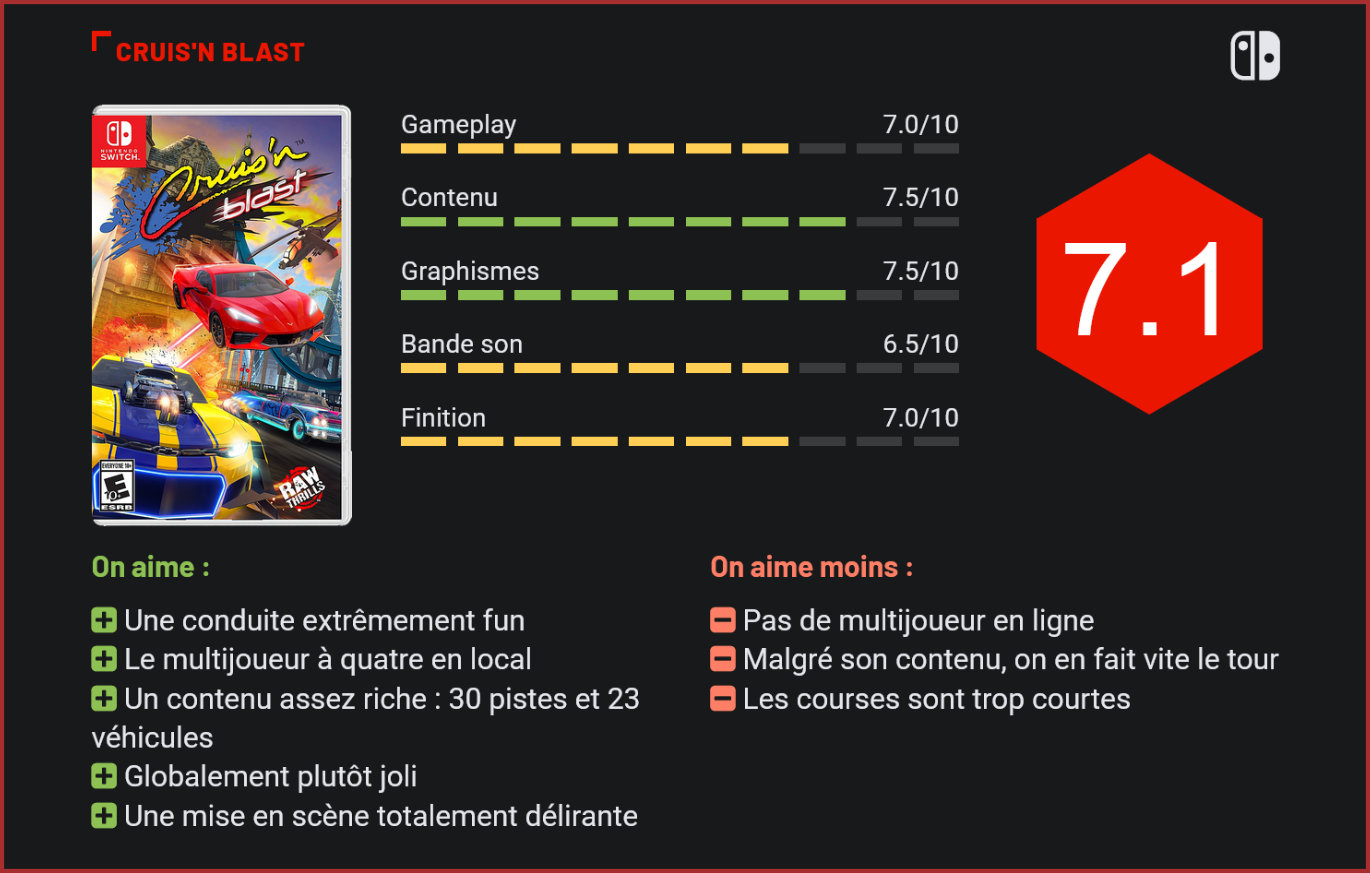 Rescapé de l’ère des Outrun, Hydro Thunder et autres Excite Truck, Cruis’n s’offre un nouvel épisode ambitieux sur Switch. Les amateurs de jeux de course arcade vivent une époque très triste. Outrun, Hydro Thunder, Excite Truck, San Francisco Rush et Burnout n’ont plus eu droit à de nouveaux opus depuis des années. Dans le meilleur cas, il faut se contenter de piètres remasters, vendus au prix plein. Parmi les fans du genre, ceux de Cruis ‘n étaient sans l’ombre d’un doute les plus désespérés. Après pas moins de trois épisodes sur Nintendo 64, la franchise était tombée dans l’oubli, jusqu’à la sortie d’un reboot complètement raté sur Wii, qui semblait avoir définitivement enterré toute chance de voir un jour la série faire son retour sur le devant de la scène. Mais c’était sans compter sur la volonté des créateurs de la franchise de nous livrer un reboot complet. Sorti d’abord en arcade, Cruis’n Blast débarque aujourd’hui sur Switch dans un portage particulièrement séduisant… Le jeu est très coloré. On retrouve dans cet épisode tout ce qui faisait le charme des originaux – et en particulier l’excellent Cruis ‘n World -: un gameplay arcade, une ambiance délicieusement 80’s, du fun à gogo et des tracés complètement délirants qui nous emmènent aux quatre coins du globe. Si Cruis ‘n Blast ne propose pas beaucoup de modes de jeu (un mode tournoi, qui fait office de mode solo, un mode arcade, un mode course unique et du multijoueur en local), il n’en propose pas moins un contenu décent avec pas moins de 30 circuits différents répartis sur une demi-douzaine d’environnements, et 23 bolides qui vont de la Formule 1 à l’hélicoptère, en passant par le SUV, la supercar ou… le dinosaure. Il n’est pas rare de traverser les cieux dans Cruis ‘n. Vous l’aurez compris, Cruis ‘n Blast est un jeu de course qui ne se prend pas du tout au sérieux. Le gameplay est extrêmement arcade, les bolides surréalistes et les tracés complètement fous. Sur l’un d’eux, vous devrez parcourir des monts enneigés, quand soudain, un gigantesque yeti apparaîtra et brisera la glace au sol, ouvrant les portes d’un monde souterrain à la végétation luxuriante. Un tas de choses se produisent à l’écran, en permanence : des voitures de police tentent de vous intercepter, des hélicoptères envoient une salve de missiles, des F16 passent en rase motte, une tornade emporte un toit devant vos yeux, un troupeau de zèbres traverse la route… Au milieu de ce chaos, le conducteur devra veiller à éviter les accrochages avec ses opposants, profiter des nombreux boosts parsemés sur le tracé et récupérer bonus et cash. L’objectif est bien entendu d’arriver le premier. Et pour ce faire, il faudra maîtriser l’art du drift, du boost et des crashs, en n’hésitant pas à envoyer valdinguer ses adversaires dans les décors. Le jeu est résolument très fun, plus encore quand on y joue à quatre en local. A quatre joueurs, Cruis ‘n Blast est un véritable régal. Cruis ‘n Blast est un gigantesque défouloir qui ravira les amateurs d’un genre délaissé depuis des années. Le jeu brille avant tout par sa simplicité d’accès et ses tracés complètement déjantés. Il est toutefois plus riche qu’il n’y paraît avec son système d’upgrade de véhicules, qui permet d’améliorer à la fois leur esthétique et leurs performances, ses véhicules à débloquer et ses nombreux modes de difficulté. Malgré l’abondance de contenus, on fait malheureusement assez vite le tour du propriétaire. Comptez 2 petites heures de jeu pour finir le mode facile. C’est normal, les courses sont très courtes. Elles ne durent en général pas plus d’une ou deux minutes. On y reviendra toutefois volontiers pour retenter l’aventure dans un mode de difficulté plus corsé, débloquer de nouveaux bolides ou s’y amuser à plusieurs. A 39,99€, l’addition reste toutefois un poil salée. D’autant plus que le titre ne propose pas de mode multijoueur en ligne. Il se passe toujours quelque chose à l’écran. Côté réalisation toutefois, s’il ne nous met pas une claque, Cruis ‘n Blast n’en reste pas moins joli, fluide et coloré. C’est kitsch au possible, mais la direction artistique fait mouche. L’univers du jeu est très vivant. Il ne se passe pas une seconde sans que quelque chose se passe à l’écran. Quelques effets visuels sont également très réussis, à l’image des flaques d’eau qui réfléchissent les néons sur les rues de certaines pistes nocturnes. Attendez-vous clairement à en prendre plein les yeux. Côté audio en revanche, le résultat déçoit un peu avec des musiques qui manquent de punch et de diversité et des bruitages minimalistes. On aurait aimé quelque chose d’un peu plus ambitieux. Cruis ‘n Blast est clairement une belle surprise. Malgré un budget limité, les développeurs du jeu sont parvenus à nous livrer un jeu de course arcade très fun, qui renoue avec les classiques du genre des années 90. Un véritable régal pour les nostalgiques. Conclusion Reboot inattendu pour la série de Midway, Cruis ‘n Blast remplit parfaitement son contrat avec son ambiance décalée, ses tracés complètement fous et sa conduite arcade très fun. Le jeu de Raw Thrills parvient à capturer l’essence des épisodes originaux et s’impose comme l’un des jeux de course arcade les plus funs de ces dernières années. Ici, vous dévalerez les pentes de l’Everest à toute allure, aux commandes d’une formule 1, vous réaliserez des descentes vertigineuses des sommets des falaises de Rio, à plus de 300km/h, sans trop vous soucier de vos adversaires. Très accessible, le titre n’en reste pas moins un véritable régal avec son système de drift très efficace et ses boosts qui vous envoient virevolter dans les airs. Malgré l’abondance de tracés et bolides, on en fait malheureus