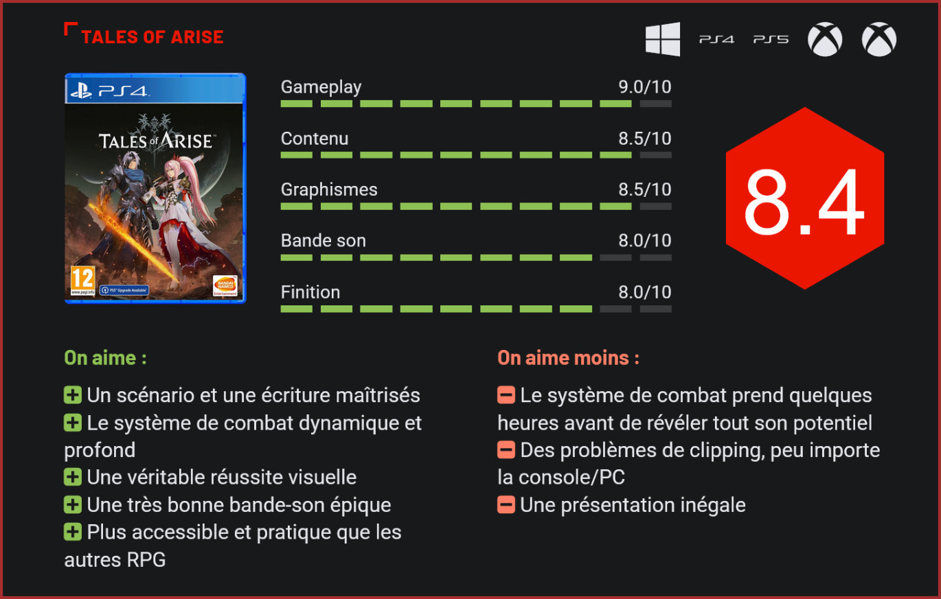 Après plusieurs années d’attente, la série des “Tales of” revient avec un tout nouveau titre qui secoue les grandes traditions de la licence. Ce nouvel épisode a la lourde tâche de redynamiser une saga vieille de 25 ans. Née en 1995, la série des “Tales of” est une saga d’Action-RPG Japonais de Bandai Namco qui a beaucoup fait parler d’elle depuis son premier épisode sur Super Famicom. En effet, si les premiers jeux de la licence sont restés exclusifs au pays du Soleil-levant, elle fera une percée en occident avec le fameux Tales of Symphonia sur Gamecube. Depuis lors, la majorité des jeux sont disponibles par chez nous, malgré un succès fluctuant. La saga fête ses 25 ans avec l’arrivée d’un tout nouvel épisode plusieurs années après le dernier jeu, la série nous ayant pourtant habituée à un rythme de sortie très soutenu. Plusieurs années de développement qui se sont avérées nécessaires pour mettre sur pied l’épisode qui veut rafraîchir la saga. Nul besoin de savoir quoi que ce soit avant de se lancer dans un nouveau Tales of. À la manière de Final Fantasy, les épisodes sont généralement déconnectés les uns des autres, ne partageant que certains traits et un univers d’Heroic fantasy. Arise prend place dans un monde comprenant deux planètes du nom de Rena et Dahna. Suite à une guerre entre les deux peuples, les Reniens envahissent et asservissent les Dahniens grâce à leur supériorité technologique. 300 ans plus tard, nous incarnons un jeune homme dénommé Alphen. Celui-ci est amnésique, insensible à la douleur et son visage est couvert d’un masque de fer. Alphen est un esclave sur Dahna, obligé de servir le seigneur local jusqu’à sa rencontre avec une jeune femme Renienne du nom de Shionne. Leur collaboration va les mener à rejoindre la résistance et à se lancer dans une quête à travers différentes régions de la planète pour libérer Dahna et arrêter les seigneurs Reniens. Durant leur aventure, les deux protagonistes vont rencontrer d’autres combattants qui rejoindront le groupe, formant ainsi une petite équipe de six personnages soudés. Le jeu offre de très jolis panoramas. L’histoire que raconte Tales of Arise est très efficace et assez simple à suivre. On y suit un conflit qui n’est pas pour autant totalement manichéen, on y ressent une certaine maturité dans l’écriture. Le titre possède tout de même un univers plus complexe et des personnages bien développés dont on ressent également l’évolution. Ces aspects sont surtout disséminés dans les dialogues optionnels. Que ce soit les saynètes, les quêtes annexes ou autres, Arise est rempli de scènes facultatives qui vont renforcer notre compréhension du monde et l’attachement que l’on ressent pour notre groupe de personnages principaux. Ce scénario est porté par une très bonne bande-son signée Motoi Sakuraba, le compositeur récurrent de la série, mais également celui à qui nous devons les musiques des jeux Dark Souls et que nous avons déjà entendu cette année sur les mélodies de Mario Golf: Super Rush. Tales of Arise brille également par son gameplay nerveux et complet. Entrer en contact avec un ennemi va lancer un combat dans une arène où nous contrôlons un des quatre personnages actifs. Tel un jeu d’action, le gameplay se déroule en temps réel et propose des attaques au sol et aériennes, ainsi qu’une esquive qui permet de contre-attaquer si elle est utilisée au bon moment. Ce qui fait le sel de ce système de combat c’est tout ce qu’il y a autour, et notamment l’utilisation des Artes. Les Artes sont des capacités que les personnages apprennent en combat et qui peuvent être enchaînées pour réaliser des combos dévastateurs. C’est donc à vous d’essayer des combinaisons différentes pour trouver les enchaînements qui fonctionnent le mieux, tout en prenant en compte les différentes propriétés de ces capacités (qui peuvent parfois envoyer les ennemis en l’air par exemple) ainsi que votre limite. En effet, les Artes ne peuvent pas être utilisées indéfiniment puisque l’on possède une “jauge d’Artes” qui nécessite d’attendre un peu une fois épuisée. Celle-ci va évoluer durant l’aventure, vous permettant de faire des enchaînements plus longs encore. Enchaîner les combos n’est pas difficile mais demande une certaine connaissance des Artes de notre personnage. Chacun des six personnages principaux sont jouables et possèdent leurs propres Artes et capacités uniques, ce qui leur octroie des petits rôles et des avantages face à certains ennemis. Shionne et son fusil seront particulièrement efficaces face aux créatures volantes, Law et ses coups de poings destructeurs vont permettre de briser les défenses des adversaires blindés, tandis que Rinwell pourra interrompre les sorts des ennemis pour se les accaparer… Il est également possible de déclencher des actions en tandem, des attaques très puissantes et impressionnantes à regarder. Apporter du support durant les combats est un processus qui a été revu pour cet épisode. Les personnages ne possèdent pas de points de magie mais toute l’équipe possède une quantité de “Points de Soin” dans laquelle on va aller puiser pour soigner les membres de l’équipe ou pour réaliser certaines actions en dehors des combats. Ces points se rechargent en passant la nuit auprès des feux de camp disséminés dans le monde ou en dormant dans une auberge. Cela fait peut-être beaucoup de choses à appréhender, en particulier si on souhaite maîtriser chacun des personnages jouables, mais l’importante durée de vie de cette aventure nous permet de nous acclimater petit à petit à tout ce que ce système de combat propose. Il faut tout de même un certain temps avant de débloquer toutes ces possibilités et les affrontements sont moins passionnants durant les premières heures. Mais une fois qu’une bonne par