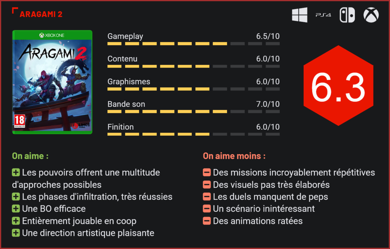 5 ans après un premier épisode séduisant, la franchise Aragami fait son grand retour sur consoles et PC. Lince Works a-t-il réussi à proposer un second épisode aussi réussi que le premier ? Aragami, c’est le titre tout droit sorti de l’esprit d’étudiants espagnols en 2014. Path of Shadows, c’était son nom à l’origine, était un hommage aux célèbres assassins japonais ancestraux. Le titre a finalement été commercialisé sous le nom d’Aragami, et s’est même vendu à 600.000 exemplaires. De quoi donner des envies de suite aux développeurs de Lince Works. C’est ainsi qu’est né Aragami 2. Dans Aragami 2, vous incarnez toujours le ninja éponyme dans la vallée de Rashomon, univers fictif très largement inspiré du folklore japonais. Aragami est assassiné par les officiers de l’armée d’Akatsuchi venue envahir votre monde. Vous vous réveillez ensuite dans un petit village du nom de Kakurega où vous apprenez, de la bouche du chef du clan, que vous et les autres habitants du village ont été touchés par une malédiction qui les rend immortels, mais qui les prive de toutes émotions. Ils doivent alors porter un masque exprimant leurs ressentis. Votre objectif est donc de briser cette malédiction en remplissant diverses missions. Une intrigue qui n’est guère très originale et qui reste très (trop ?) proche de celle du premier opus. On aurait ainsi aimé davantage d’originalité sur ce point, d’autant que l’univers est suffisamment porteur pour offrir au titre une histoire digne de ce nom. Le scénario n’est pas très original et ne nous aura que très peu emballés. Le port du masque par les habitants est un raccourci très bien imaginé par les développeurs pour ne pas avoir à s’attarder sur un élément ô combien difficile à maîtriser dans le jeu vidéo : l’animation faciale. Tous les personnages portent un masque. Enfin presque, puisque certains sont exempts de cette malédiction et ne portent pas de masque. Malheureusement, lorsqu’ils parlent, leur visage est dépourvu de la moindre animation faciale. Les animations générales des personnages sont elles aussi légèrement datées et très simples. Si les animations ne sont pas très élaborées, c’est également le cas des environnements. Les différents univers ne sont pas toujours très différents les uns des autres tandis que leur réalisation laisse à désirer. En effet, on regrettera que techniquement, Aragami 2 ne soit pas à la hauteur de ce que nous sommes en droit d’attendre, surtout après l’arrivée des consoles next-gen. Le titre ne sort ni sur PS5 ni sur Xbox Series et il donne même l’impression d’avoir été conçu pour la PS3 et la Xbox 360. C’est relativement daté et clairement pas du niveau des titres actuels. Ajoutez à cela le clipping omniprésent au fur et à mesure que nous progressons dans les niveaux et des textures très mal fichues, et ça nous fait des environnements franchement pas plaisants à découvrir… Les phases d’infiltration sont la pierre angulaire du titre et sont tout particulièrement réussies. Comment parler d’Aragami 2 sans évoquer ses innombrables phases d’infiltration ? Sans surprise, vous allez à de nombreuses reprises devoir vous faufiler dans les niveaux sans vous faire repérer, comme les célèbres ninjas. Sur ce point, les développeurs de Lince Works ont habilement conçu ces phases, puisqu’elles sont tout simplement très réussies. Plusieurs approches sont notamment proposées, et ce, grâce au pouvoir de téléportation d’Aragami. Celui-ci vous permet par exemple d’atteindre des lieux qui seraient en temps normal inaccessibles. Lorsqu’il le faut, vous pouvez également prendre par surprise les ennemis et les tuer dans la discrétion la plus totale, pour ensuite cacher leur corps. Si vous vous faites repérer, ce sera alors la catastrophe. En effet, outre la tonne d’ennemis qui vous feront face, vous devrez vous battre au corps à corps. Autant le dire de suite, les affrontements en face à face d’Aragami 2 sont terriblement décevants. Les personnages sont lourds dans leurs déplacements et attaques, et nombreuses sont les imprécisions lorsqu’il faut parer un coup ou esquiver l’attaque de votre opposant. On regrettera également que les combats soient très mous et qu’ils manquent de punch. Finalement, Aragami 2 ne nous surprendra que très rarement. Les missions ne varient jamais vraiment, puisqu’elles consisteront toujours à rejoindre un lieu en assassinant les ennemis qui vous feront face. Certes, le prix auquel le jeu est proposé n’est pas vraiment élevé (35€) par rapport aux 17 heures de durée de vie. 17 heures lors desquelles on s’ennuie très vite. Heureusement, le titre est jouable entièrement en multi/coop, ce qui permet de varier les plaisirs et d’offrir une certaine rejouabilité. D’ailleurs, on ne pourra que vous conseiller de directement jouer au titre avec un ami. La communication n’en sera que meilleure et le gameplay moins lassant. Visuellement, Aragami 2 est très daté et donne l’impression d’être sorti en 2010 sur PS3. On ne pourra en revanche que s’incliner devant la très réussie direction artistique d’Aragami 2. Certes, le cell-shading du premier épisode est moins marqué, mais ce n’est en soi pas très grave. L’ambiance du Japon féodal est très réussie et l’on est très vite emporté dans le pays du Soleil Levant (même si le titre ne s’y déroule pas). La DA est évidemment aidée par une bande-son de qualité. Les mélodies retranscrivent très bien l’ambiance du Japon féodal et mettent toujours l’accent sur l’aspect infiltration du titre. Le doublage est également réussi, même si rares sont les personnages à parler. En effet, votre personnage ne parle jamais et les différents protagonistes et antagonistes qui parlent le font dans une langue propre au titre. Heureusement, il existe des sous-titres f