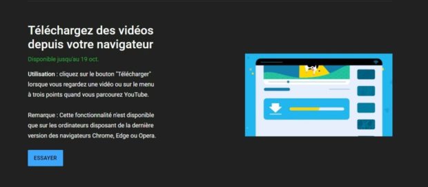Cette fonctionnalité existe déjà sur smartphone et elle arrive enfin sur ordinateur grâce à un test qui a lieu jusqu’au 19 octobre : vous pouvez télécharger des vidéos YouTube sur votre PC pour les regarder hors connexion. Pour l’instant, cette nouvelle option n’est accessible que sur YouTube Premium. Jusqu’au 19 octobre, les utilisateurs Premium ont l’opportunité de télécharger leurs vidéos préférées à partir de leur navigateur. Les internautes doivent disposer de la dernière version de Chrome, Opera ou Edge pour que le téléchargement soit autorisé. YouTube Premium YouTube tente de s’imposer face aux nombreux sites qui proposent cette alternative depuis des années de façon illégale. Depuis leur création, le géant des vidéos en ligne lutte contre ce fléau. C’est pourquoi, dans le cadre de ce test, un bouton « Télécharger » est apparu entre « Partager » et « Enregistrer ». L’objectif est de proposer une option légale de téléchargement. YouTube Premium Les téléchargements sur smartphone sont disponibles depuis quelques temps sur YouTube Premium grâce à une application mobile. Il était donc temps qu’ils le soient aussi sur navigateur pour permettre aux utilisateurs de regarder des vidéos sur PC à tout moment. Ils sont invités à installer une application sur leur ordinateur, la web app PWA, pour accéder à tous leurs téléchargements. YouTube précise aussi que « les téléchargements restent disponibles tant que votre appareil dispose d’une connexion Internet active, au moins une fois tous les 30 jours. » Au moment du téléchargement, à eux de sélectionner la qualité de la vidéo. Il est à noter que la 4K n’est pas disponible. Après le 19 octobre, YouTube prendra certainement une décision définitive quant à ce test : conserver cette option de téléchargement depuis le navigateur ou non. Il faudra déterminer si l’essai a été concluant.