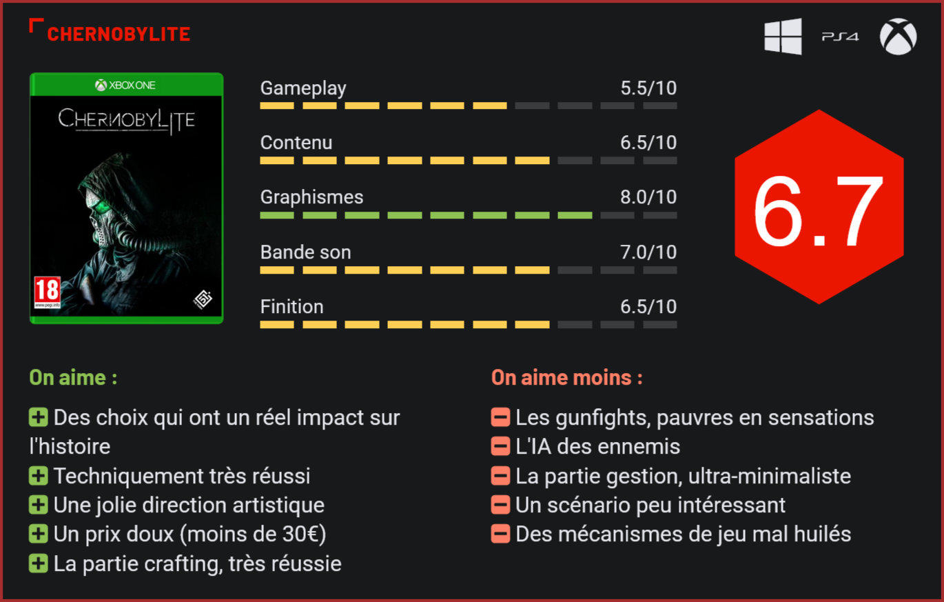 Après NecroVision, Get Even et Deadfall Adventures, les développeurs polonais de Farm51 nous reviennent avec un projet encore plus ambitieux. Marchant sur les traces d’un S.T.A.L.K.E.R., Chernobylite vous invite au cœur de la zone d’exclusion pour un récit de science-fiction. 1986. La ville de Prypjat est évacuée peu après un incident nucléaire. C’est le jour où la vie d’Igor, un employé de la centrale de Tchernobyl bascule. S’il survit à la catastrophe, sa tendre épouse n’a pas cette chance. Il ne l’a plus jamais revue depuis la catastrophe. L’homme retourne 30 ans plus tard sur place pour tenter de découvrir le mystère de sa disparition. Esthétiquement, le jeu est très réussi. Si l’univers du jeu est très séduisant sur le papier, il a un peu plus de mal à convaincre pad en main. Tout d’abord, parce que la narration se fait essentiellement à travers de longs dialogues pas forcément très passionnants à suivre. Ensuite, parce que si la Zone d’exclusion est un lieu passionnant à explorer, l’approche des développeurs a de quoi surprendre. Le scénario n’apporte que peu d’éclaircissements sur la situation… Les événements se déroulent 30 ans après la catastrophe. On apprend que la région est désormais contrôlée non pas par les forces militaires ukrainiennes mais par des mercenaires (?) Les développeurs n’ont également pas hésité à ajouter une dimension SF à leur jeu avec des créatures qui semblent tout droit sorties d’un autre monde, des portails et une mystérieuse pierre qui joue un rôle clé dans l’intrigue, la chernobylite. Vous vous sentez un peu perdu au milieu de tout ça? Nous aussi. Les gunfights passent complètement au second plan. Clairement, la narration n’est pas le point de Chernobylite. Son univers en revanche, reste séduisant avec ses zones de jeu désolées, ses bâtiments abandonnés dans lesquels errent de terrifiantes créatures. L’ambiance de jeu est soignée. Assez pour vous foutre la chaire de poule à plusieurs reprises. On admire également l’énorme travail qui a été réalisé au niveau de la modélisation de cet univers. Malgré son statut de petite production, Chernobylite est un jeu visuellement très réussi, qui n’a rien à envier à un jeu triple-A. Seules les animations des personnages et créatures déteignent. Côté gameplay, il faut le savoir, Chernobylite n’est pas un FPS à proprement parler. Oui, le jeu se joue à la première personne et oui il y a des gunfights, mais ceux-ci sont relativement peu nombreux (vous tuerez au maximum 6 ennemis les deux premières heures de jeu, à titre d’exemple). Les développeurs insistent d’ailleurs : Chernobylite est davantage un RPG qu’un FPS. Il emprunte la plupart des éléments de son gameplay au genre : points d’expérience qui améliorent progressivement les capacités de notre personnage, système d’upgrade des armes, loot et même crafting. Durant vos sorties, il faudra en effet récupérer toutes les ressources que vous croiserez : matériel électronique, vivres, fuel,… Tout cela vous servira à créer des upgrades pour vos armes mais aussi à améliorer votre campement. Le jeu intègre un système d’upgrade des armes. Car oui, le jeu intègre aussi des mécanismes de jeu de gestion. Il faudra continuellement améliorer son campement pour booster le moral de ses hommes, choisir les rations à leur livrer et améliorer votre nid douillet en ajoutant des éléments cosmétiques dans votre demeure, et d’autres pratiques, comme des générateurs d’électricité, des lits de campement, etc. Le concept est sympa, mais tout cela n’a finalement que peu d’impact sur le reste du jeu : les vivres sont nombreuses, il sera pratiquement impossible d’en tomber à court. Les mécanismes de crafting sont, à l’inverse, une jolie réussite. Car on ne se contente pas ici de crafter quelques munitions. Il faudra aussi crafter des potions, des objets, des améliorations d’armes et bien plus encore, via l’établi de son campement ou sur le terrain, avec un établi que l’on aura soi-même crafté au cœur de l’action. Les radiations sont une menace constante dans Chernobylite. Quelque part à mi-chemin entre un jeu de rôle et un jeu de survie, Chernobylite n’hésite pas à jouer avec les codes du genre et à faire preuve d’originalité. La zone d’exclusion permet ainsi d’explorer quelques concepts uniques, comme l’impact de la radioactivité sur le joueur. Celui-ci devra constamment vérifier le niveau de radioactivité de son environnement pour éviter que celui-ci n’affecte sa santé. Notre personnage n’étant pas un super-soldat, il n’est d’ailleurs pas très performant dans le combat. Il faudra dès lors favoriser l’infiltration face aux adversaires. Dans le même ordre d’idée, votre personnage subit la pression et la violence, ce qui affecte son esprit. Cela se retranscrit dans le jeu par une zone sombre qui affecte la lisibilité à l’écran. Les créateurs de Chernobylite ont également été très loin dans les à-côtés, avec la création de pièges pour venir à bout de ses adversaires, un système de météo dynamique, et même la gestion d’équipe. Chaque jour, vous devrez choisir votre mission mais aussi celles de vos alliés, qui contribueront à la survie en ramenant des vivres. C’est pour cette raison qu’il convient d’aménager ses quartiers et de faire attention à la qualité de vie de vos camarades ainsi qu’aux vivres. Des tas d’idées très intéressantes et joliment explorées dans le jeu. On regrette cependant que les développeurs n’aient pas autant soignés les mécanismes de combat. S’il est un jeu de survie réussi, Chernobylite est un piètre FPS. Tout d’abord en raison de l’IA catastrophique des ennemis : si vous ouvrez le feu dessus, vous planquez derrière un arbre, ils auront oublié l’incident moins d’une minute plus tard. E