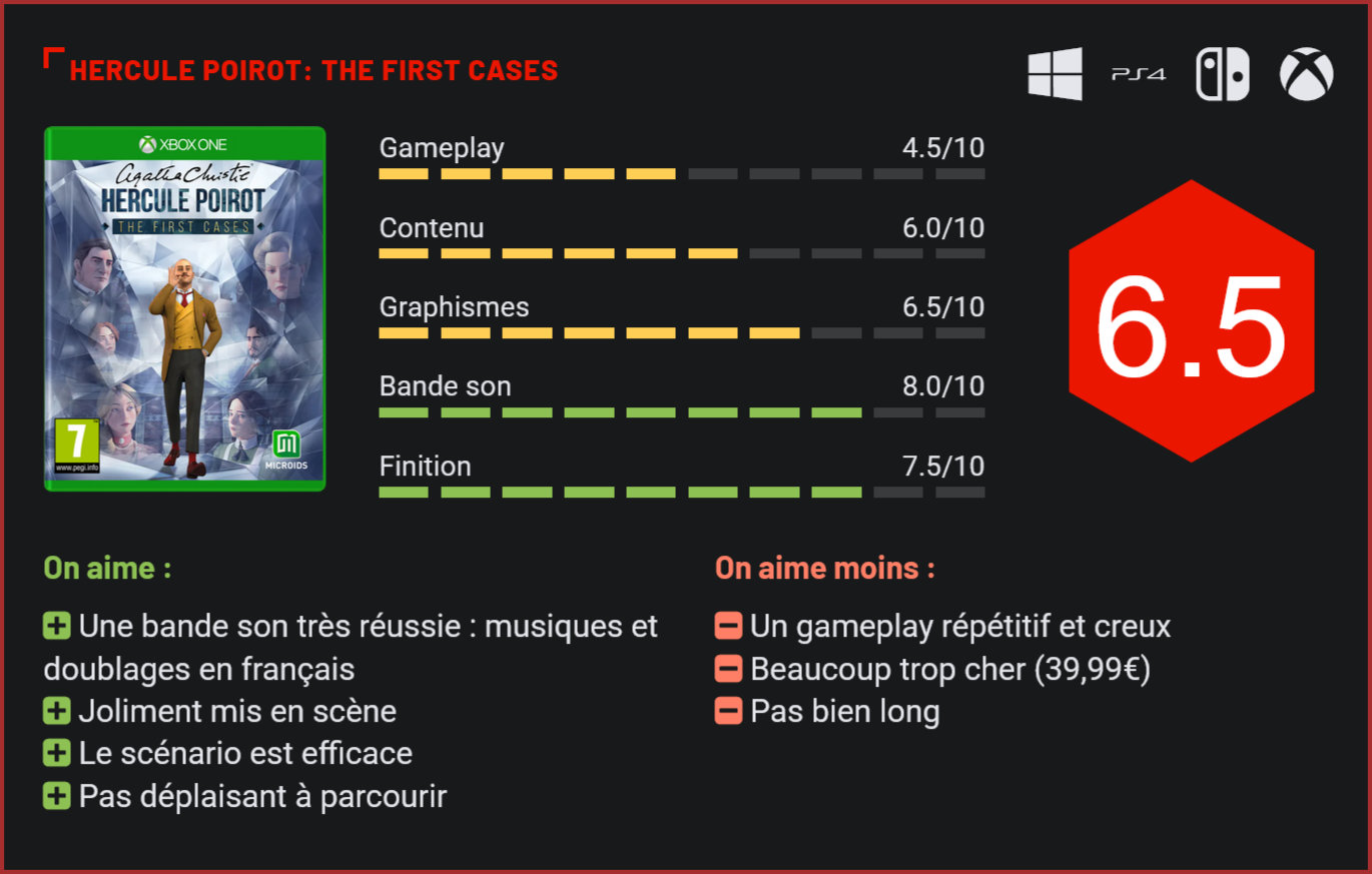 Parmi les détectives les plus connus de la littérature, Hercule Poirot n’avait toutefois jamais vu ses histoires adaptées en jeu vidéo. L’ouvrage d’Agatha Christie est enfin décliné en jeu, sous la direction de l’éditeur Microids. L’éditeur français a confié au petit studio BlazingGriffin, auteur du sympathique Murder Mystery, l’adaptation de l’ouvrage d’Agatha Christie. Plus ambitieux que les précédents projets du studio, Hercule Poirot: The First Cases reste toutefois un petit projet, mené par une petite équipe en un temps record. Et cela se ressent puisque pratiquement tous les mécanismes de jeu sont hérités de la dernière production du studio. Pour résoudre les énigmes, il faudra mener l’enquête pas à pas. On se retrouve donc ici face à un jeu d’enquête qui lorgne du côté des point & click. Tout se déroule toutefois en temps réel. L’utilisateur déplace le détective du bout du stick à travers des environnements de taille très modestes. Il passe au peigne fin les décors à la recherche d’indices, dialogue avec les PNJ puis, par la pression d’un simple bouton, accède à une interface qui lui permet de tirer des conclusions sur base des indices, jusqu’à la résolution de son enquête. The First Cases est un jeu très chill. N’espérez pas y trouver une séquence d’action. Il faut connecter les différents éléments pour résoudre l’enquête. Côté mise en scène et scénario, le titre de BlazingGriffin surprend plutôt agréablement. L’histoire commence doucement, avec un tutoriel peu intéressant mais qui permet de se familiariser avec les mécanismes du jeu. Puis, l’aventure démarre. Le joueur y incarne un Hercule Poirot très jeune, au début de sa carrière. Invité à une réception par l’influente famille Van den Bosch, à l’occasion de l’annonce des fiançailles de leur fille, notre détective préféré devra enquêter sur le meurtre d’un invité dans un contexte assez particulier, puisqu’une tempête de neige sévit à l’extérieur, isolant les invités du reste du monde… Le scénario du jeu est plutôt réussi et joliment mis en scène à travers de courtes cinématiques riches en détails sur la contextualisation et des dialogues soignés entre les personnages. L’écriture est excellente et le scénario agréable à suivre. Malgré son statut de petite production, le jeu a toutefois eu droit à d’excellents doublages en français et une très bonne bande sonore. Ce qui ne fait qu’aider le joueur à s’immerger dans l’univers d’Agatha Christie. Visuellement, le jeu est propre, mais très simple. Pad en main, on a en revanche beaucoup de mal à adopter la formule épousée par les développeurs. Car les mécanismes de jeu sont d’une simplicité et d’une répétitivité déconcertante. Dans chaque chapitre, il faudra procéder exactement de la même façon. Explorer les décors pour identifier chaque élément susceptible d’aider à faire progresser l’enquête, poser des questions aux PNJ, puis entrer dans l’interface qui vous permettra de connecter les différents éléments de l’enquête et ainsi progresser dans le scénario. Le concept aurait pu être plaisant si ces éléments n’étaient pas tous disposés d’une façon prédéfinie, de sorte à ce que le joueur puisse facilement identifier les éléments à interconnecter. Car il n’y existe pas de nombreuses connexions possibles. De façon générale, il est également relativement facile de créer des liens pelouse humide + traces de pas = le voleur a certainement du passer par là… Le temps d’un ou deux chapitres, la formule fonctionne. Ensuite, difficile de ne pas ressentir de lassitude. Car on est finalement ici clairement sur un rail narratif et un jeu sans grande complexité. Les jeux d’enquête sont déjà assez rares… Les bons jeux d’enquête le sont encore plus. L’ambiance est plutôt soignée. En définitive, difficile de ne pas être déçu par l’aspect ludique de ce jeu, réussi artistiquement et scénaristiquement mais qui manque cruellement d’ambition – en particulier pour un jeu vendu 39,99€. La licence se paye cash… Et l’aventure n’est de surcroit pas bien longue. Ceci étant dit, si son gameplay est relativement creux, Hercule Poirot: The First Cases n’en reste pas moins un jeu agréable à parcourir, qui parvient à séduire par son atmosphère soignée, ses dialogues riches et son scénario accrocheur. Esthétiquement, c’est loin d’être au niveau des standards actuels, mais c’est suffisamment joli pour qu’on ait envie de progresser. La galerie de personnages rencontrés a également suffisamment de charme pour intéresser les passionnés de littérature, qui se feront un bonheur de réexplorer la genèse des aventures de Mr. Poirot dans sa Belgique natale. Conclusion Avec The First Cases, Microids livre une adaptation fidèle de l’univers d’Agatha Christie en jeu vidéo. The First Cases s’intéresse aux premiers pas d’Hercule Poirot dans son rôle de détective, dans sa Belgique natale. Avec son scénario efficace, sa jolie galerie de personnages et ses dialogues soignés, le jeu est une jolie réussite sur le plan narratif. Un peu moins d’un point de vue ludique. Car le gameplay est assez creux. Il s’agira de se déplacer dans des environnements de taille modeste pour collecter des indices, dialoguer avec des PNJ, puis dresser ses propres conclusions en interconnectant les différents indices. Une formule répétitive mais qui manque surtout de piquant et de complexité, puisqu’on n’a souvent pas beaucoup de choix dans les connexions à établir. Malgré sa simplicité, le jeu reste toutefois plaisant à parcourir. Les excellents doublages des personnages lui donnent également un certain charme pour une petite production au budget modeste.
