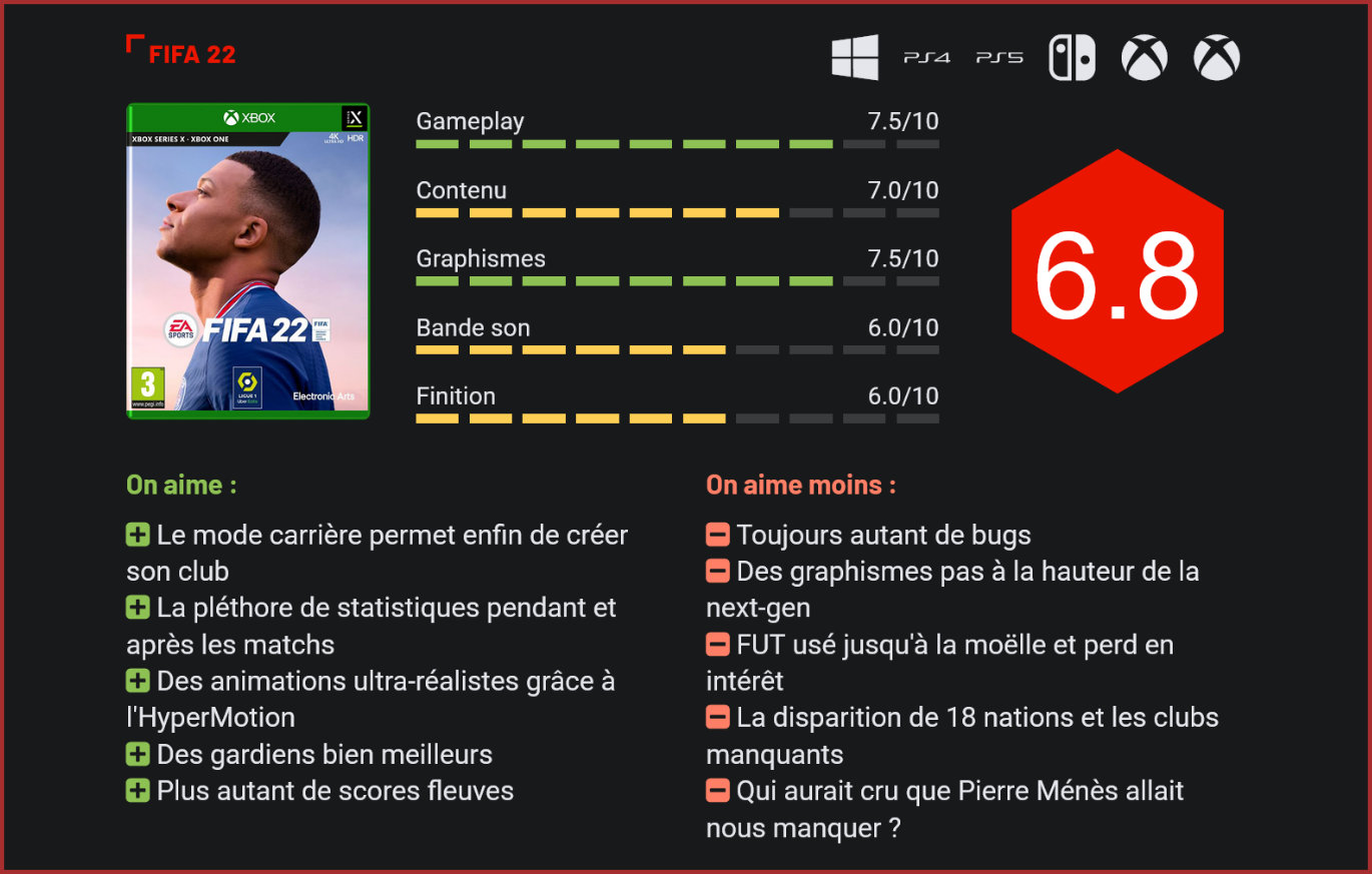 Comme chaque année, la franchise de simulation de football FIFA fait son retour sur PC et consoles et, comme chaque année, il n’y a pas de gros bouleversements… Cette année, la rentrée a pris un tout autre visage du côté des simulations vidéoludiques de football. L’illustre Pro Evolution Soccer a modifié son modèle économique et son nom pour adopter un modèle free-to-play. Malheureusement, les premiers retours montrent que le titre a été complètement bâclé et que le choix de Konami n’était probablement pas le bon. Electronic Arts a pour sa part conservé le modèle de jeu vendu au prix fort chaque année. FIFA 22 débarque cette année après un FIFA 21 décevant en bien des points. Le second épisode à sortir sur PS5 et Xbox Series, et dont on en attendait beaucoup, notamment parce que l’épisode précédent était considéré par beaucoup comme un épisode de transition. Il s’agit peut-être d’un épisode de transition, mais pas pour les raisons que l’on croit. Autrefois réputé pour proposer énormément de licences, FIFA commence tout doucement à perdre du terrain face à eFootball sur ce point. On dénombre notamment la disparition de 18 sélections nationales. Présentes l’année dernière, mais sans licence officielle, ces nations ont cette année été laisser à l’abandon par EA. On notera ainsi l’absence de l’Uruguay, du Cameroun ou encore de la Turquie, trois nations majeures du football. Outre ces sélections, FIFA 22 ne propose non plus 2 grands d’Italie en version non-officielle, mais désormais 4, à savoir l’Atalanta Bergame, la Lazio, la Juventus et la Roma. Ils sont donc dépourvus de leur nom, maillot, stade et écusson officiel. Ultimate Team ne s’est clairement pas amélioré depuis l’année dernière, il ne fait que stagner … Le célèbre mode de jeu en ligne de FIFA, Ultimate Team, commence tout doucement à s’essouffler. Voilà quelques années que le mode n’évolue plus tellement, au point même de régresser sur quelques points. En effet, EA a par exemple retiré les matchs d’évaluation au tout début de Division Rivals pour jauger votre niveau. Cela signifie que, très vite, vous tomberez contre des joueurs très forts, avec une excellente équipe là où vous aurez encore le pack de base avec les cartes bronze. Autant vous dire que vous serez très vite frustré. Désormais, EA privilégie une progression par palier, dans le sens où vous démarrez directement de la division la plus basse, la 10e Division, puis vous devrez enchaîner les victoires pour atteindre un premier palier. Une fois ce premier palier atteint, vous êtes assuré d’y rester, ou en tout cas, de ne plus régresser, si vous veniez à perdre. Une nouveauté qui a le mérite d’exister, mais qui ne parviendra jamais à elle seule à réinventer le mode de jeu. S’il y a un toutefois un mode sur lequel on ne peut que s’enthousiasmer et avec lequel Electronic Arts trouve chaque année la recette gagnante, c’est sans conteste le mode carrière. L’année dernière, le mode le plus célèbre de FIFA intégrait les entraînements de toute l’équipe et la simulation en temps réel des matchs. Désormais, c’est une nouveauté bien plus marquante et majeure qui fait son apparition : la création de club. La firme américaine a voulu ajouter beaucoup plus de personnalisation à son mode fétiche avec cette nouvelle feature. Désormais, vous aurez la possibilité de choisir d’entraîner un club existant, mais également d’en créer un de A à Z. Il vous sera ainsi demandé dans quel championnat il jouera et à la place de quelle équipe, de choisir son rival, mais également de lui attribuer un écusson, un stade (que vous pourrez renommer) et les maillots domicile et extérieur de vos joueurs, à créer selon vos envies. Enfin, vous entrerez dans le vif du sujet en paramétrant l’équipe et le noyau. Joueurs confirmés et vétérans ou jeunes prometteurs, les possibilités sont énormes. Vous pourrez également configurer le budget transferts de votre club et recruter par la suite des stars internationales comme Erling Haaland ou Virgil Van Dijk. Les attentes du CA seront elles aussi à configurer, ce qui vous permettra de choisir entre une difficulté aisée ou très élevée. Le mode carrière permet désormais de créer son propre club, une grosse nouveauté. Outre ces deux modes emblématiques de FIFA, Electronic Arts en a profité pour remodeler en profondeur le “petit nouveau” : Volta. Là où, précédemment, on avait accès à un mode solo légèrement scénarisé et des parties solo appréciables, les développeurs ont fait le choix audacieux de ne proposer qu’une expérience purement multijoueur. Désormais, on joue à quatre avec trois inconnus et on enchaîne les matchs et les modes de jeu assez barbants et sans intérêt. En effet, le but réel du mode n’est pas vraiment sexy, puisque gagner des matchs ne permet que de remporter des accessoires et vêtements pour notre footballeur. Autant aller droit au but, le mode a énormément perdu en intérêt, lui qui avait de sérieux atouts à faire valoir. Le foot féminin n’a quant à lui pas bougé d’un iota, tant au niveau du gameplay que des modes de jeu proposés. On regrettera toutefois que l’équipe nationale du Japon ne soit plus disponible, alors qu’elle faisait partie des bonnes équipes féminines. Côté gameplay, Electronic Arts a légèrement changé la donne, avec des matchs plus réalistes, notamment au niveau de l’IA. L’année dernière, nous pestions contre les gardiens, souvent trop laxistes et incapables d’arrêter les ballons. Désormais, ceux-ci sont bien plus intelligents et disposent de meilleurs réflexes. Ils sont ainsi moins frustrants, notamment dans FUT où le gardien peut souvent s’avérer décisif. Les portiers sont ainsi moins laxistes et ne permettent donc plus autant de scores fleuves. Fini donc les 7-1 ou les 