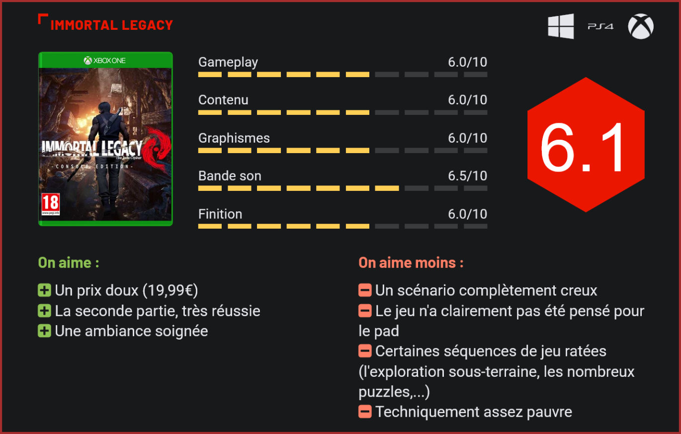 Sorti en 2019, Immortal Legacy était parvenu à trouver son public sur PC et PlayStation 4. Deux ans plus tard, ses créateurs nous livrent un portage du jeu sur consoles, cette fois sans plus aucune compatibilité avec les casques de réalité virtuelle. C’est un fait, la réalité virtuelle a du mal à séduire. Nombreux sont aujourd’hui les studios qui font le choix de porter leurs productions VR en jeux qui se jouent entièrement au pad sur un téléviseur pour rentabiliser leur investissement… Avec de temps à autre de belles surprises à la clé. Les gunfights sont plutôt intenses en début d’aventure. Passé relativement inaperçu au moment de sa sortie, Immortal Legacy était pourtant parvenu à récolter quelques jolies notes dans la presse spécialisée, allant jusqu’à se faire surnommer – injustement – “l’Uncharted de la VR”. Le jeu du studio chinois Vivagames jouait la carte de l’immersion et de l’action, avec une aventure riche en rebondissements, qui se jouait entièrement à la première personne. Forcément, porter un jeu VR sur grand écran est toujours un peu casse-gueule. Certains s’en sortent mieux que d’autres. Lorsqu’il s’agit d’un FPS, on sent forcément cette sensation de flottement propre aux jeux en réalité virtuelle et Immortal Legacy n’échappe pas à la règle. Changement radical d’ambiance dans le second acte. Le jeu nous place dans la peau d’un aventurier des temps modernes qui se retrouve on ne sait guère trop comment ni pourquoi sur une île tropicale qui renferme de nombreux secrets. On ne va pas vous le cacher, niveau scénario, on est proche du nanar. L’aventure débute d’ailleurs avec la rencontre de Ksana, une jeune influenceuse venue sur l’île on ne sait guère trop comment pour “filmer des dragons” pour ses fans – ça ne s’invente pas. Le scénario mélange légende chinoise, mercenaires et expérimentations scientifiques dans un complexe abandonné, le tout sous un ton très léger. Assez paradoxalement, la sauce prend pourtant plutôt bien. On commence l’aventure armé d’un simple revolver face à des hordes de mercenaires armés jusqu’aux dents. Pad en main, le personnage est assez lourd et on sent cette désagréable sensation de flottement à chaque déplacement, mais les gunfights n’en restent pas moins intenses et assez techniques. Une ou deux balles suffisent à vous mettre au tapis. Après 30 minutes de jeu, le ton change radicalement. Le joueur s’enfonce dans les profondeurs d’un complexe abandonné infesté d’affreuses créatures que l’on croirait tout droit sorties de Dead Space. Les séquences de jeu sont variées mais loin d’être toutes réussies. C’est dans ce second acte que le jeu brille le plus. L’atmosphère change radicalement. Le joueur se retrouve dans des catacombes à évoluer seul dans le noir avec une lampe torche et quelques munitions. Il faudra éviter les nombreux pièges qui l’attendent sur son chemin mais surtout éliminer les monstruosités qui peuplent les sous-sols. Le design des créatures est particulièrement réussi et il ne sera pas rare de sursauter face à son écran. Vu qu’il a été pensé comme un jeu d’aventure en réalité virtuelle, Immortal Legacy ne respecte pas vraiment les codes du FPS et n’hésite pas à enchainer les séquences de jeu diverses et variées. On retrouve ainsi quantité de puzzles à résoudre, plusieurs séquences de parkour et même quelques combats de boss. Il est donc loin d’être question d’un simple shooter. De par sa construction, le titre se rapproche souvent d’ailleurs d’un survival-horror, jusque dans sa gestion de l’équipement, très clairement inspiré d’un Resident Evil. Le joueur dispose d’un nombre de slots pour y glisser toutes ses armes et accessoires. Il devra dès lors faire des choix dans ses outils… Il faudra régulièrement résoudre de petites énigmes. Immortal Legacy parvient à très agréablement nous surprendre lors de certaines séquences de jeu particulièrement inspirées : la guérilla dans la montagne, les passages d’ambiance sous-verre, et tout son côté survival. Beaucoup moins lors d’autres séquences, nettement moins maîtrisées, à l’image des “chutes” qui se réduisent à de longues séquences durant lesquelles le joueur devra pencher son stick de gauche à droite et inversément pour éviter des obstacles, ou lors des combats avec les drones. Visuellement, le titre s’en sort correctement. La direction artistique du jeu est plutôt inspirée. Un gros travail a été accompli sur le design des monstres, particulièrement réussi. Esthétiquement toutefois, on est loin d’un jeu triple-A. Les animations des personnages sont basiques, les effets visuels minimalistes et on ressent clairement qu’on est en face d’un jeu de 2019 reconditionné. Pour autant, cela ne gâche pas trop le plaisir de jeu. Car à 19,99 €, l’offre reste solide et le divertissement n’est guère déplaisant à parcourir. Ambiance, ambiance… Reste un gros défaut : s’il fallait 5 à 6h de jeu pour en voir le bout en VR, il ne faut pas plus de 2 à 3h de jeu pour le finir en ligne droite sur son téléviseur. La durée de vie a été littéralement divisée par deux. Et pour cause, puisqu’il est beaucoup plus facile de se diriger au pad dans les couloirs sinueux d’Immortal Legacy. Et ce, bien que le titre ait clairement été pensé pour la réalité virtuelle, de par sa structure. A 19,99€, Immortal Legacy reste un FPS plaisant à parcourir mais qui manque cruellement de profondeur. Un jeu “pop-corn” que l’on déguste en l’espace d’une soirée et sur lequel on ne reviendra pas forcément. Le jeu présentait un réel potentiel. On le sent toutefois : le projet était sans doute trop ambitieux pour le petit studio chinois, qui malgré d’excellentes idées, ne parvient jamais réellement à trouver la recette parfaite. Conclusio