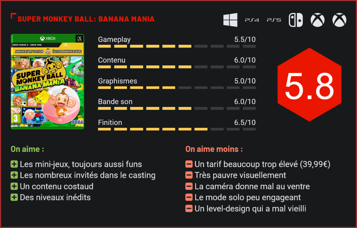 Deux ans presque jour pour jour après Banana Blitz HD, Sega nous livre un autre remaster de sa série culte des Super Monkey Ball. Difficile de ne pas s’y perdre dans l’historique des sorties de la franchise Super Monkey Ball. Plus d’une quinzaine de jeux ont vu le jour depuis la sortie du premier volet, en 2001 en arcade et sur Gamecube. Si l’on met de côté les quelques épisodes sortis sur mobiles et les remasters, la dernière entrée dans la série remonte toutefois à… 2011, soit il y a dix ans déjà! Visuellement, ça a très mal vieilli. En réalité, on pourrait subdiviser la série selon trois axes : les épisodes originaux, sortis à l’époque sur Gamecube, les spin-off divers et variés qui ont rencontré un succès beaucoup plus modéré, et les revivals sur Wii, qui ont relancé la franchise. L’épisode sorti en 2019 sur les consoles de dernière génération était un remaster du Banana Blitz sorti à l’époque sur Wii, et qui reste l’un des meilleurs volets de la franchise à ce jour. Sega a eu la drôle d’idée de continuer sur sa lancée en nous livrant un autre remaster, cette fois de Super Monkey Ball Deluxe, le titre qui réunissait le contenu des deux premiers volets sortis sur Gamecube à l’époque. Le level-design a très mal vieilli. Il fallait s’en douter, le jeu a très mal vieilli. Sega a beau avoir retravaillé les graphismes, le résultat reste très en deçà de ce qu’on était en droit d’attendre sur les consoles actuelles. Rappelons-le, il ne s’agit pas d’un remake mais d’un remaster. Les modèles 3D ont été retravaillés, quelques textures également, mais le travail de remasterisation s’est arrêté là. Esthétiquement, le titre est très pauvre. Logique, il s’agit d’un titre de 2001. Le jeu tourne toutefois au moins en 60 FPS et en 4K sur les consoles next-gen. Niveau gameplay également, avec des contrôles qui restent très approximatifs, une caméra mal-stabilisée qui donne vite mal au ventre et un level-design vieillot. Quelques options d’accessibilité ont été ajoutées, mais rien de vraiment révolutionnaire : le joueur a la possibilité de passer un niveau sur lequel il bloque et de ralentir le temps par la pression d’un simple bouton. Le concept, lui, reste le même en solo : il s’agit toujours de diriger un singe coincé dans une boule sur un gigantesque plateau en orientant celui-ci. Le tout, en récupérant un max de bananes sur le plateau. Tout le concept du jeu est basé sur la physique. Il faudra toutefois garder un oeil sur le chrono puisque pour compléter le challenge, il faut finir le niveau dans le temps imparti. Si les premiers niveaux sont très simples, ils gagnent en complexité au fil des heures de jeu avec des tas de pièges plus vicieux les uns que les autres et un level-design de plus en plus corsé… mais qui a très mal vieilli. La difficulté est d’ailleurs très mal dosée dans certains niveaux où votre réussite dépendra davantage de votre chance que de vos compétences. Les mini-jeux sont toujours au programme. S’il propose un contenu gargantuesque avec ses centaines de défis, Banana Mania souffre d’une structure peu engageante. Son mode solo se résume à une succession de tableaux à boucler, entrecoupés par quelques cinématiques peu inspirées. Inutile de vous le préciser : la plupart des joueurs lâcheront très vite le pad pour se concentrer sur le plus fun : les mini-jeux, qui sont bien entendu jouables à plusieurs. Car c’est très clairement ce qui fait la richesse de Super Monkey Ball. Des tas d’activités sont proposées : du football au basketball en passant par le golf et le tennis. La qualité est inégale, mais on y trouve toutefois largement de quoi s’amuser à plusieurs. Reste qu’à la base, tout cela n’était censé être que du bonus… SEGA a enrichi le contenu avec de nouveaux niveaux et des bonus à débloquer : des personnages supplémentaires intégrés au casting du jeu mais aussi des costumes alternatifs. Des petites bonus fort appréciables mais qui n’apportent finalement pas de grosses nouveautés au titre. Si les fans de la série seront sans doute ravis de pouvoir ajouter ce remaster des deux premiers volets à leur collection, les deux titres ont toutefois beaucoup vieilli et il est peu probable que les nouveaux joueurs tombent sous leurs charmes. D’autant plus que la compilation est vendu au tarif de 39,99€, ce qui reste assez élevé pour un remaster minimaliste… Conclusion 20 ans après ses débuts, Super Monkey Ball revient à travers une compilation des deux premiers volets, qui se jouent désormais en 4K et en 60 images par seconde. Généreux en nouveautés côté contenu (nouveaux niveaux, personnages et skins), ce remaster peine toutefois à convaincre. Les mécanismes de jeu, graphismes et le concept ont très mal vieillis. Si l’on s’amuse volontiers à dévaler les pentes de ses gigantesques plateaux de jeu dans la peau d’un singe coincé dans une gigantesque bulle, on finit vite par se lasser d’un concept qui ne se renouvelle pas assez et d’un level design vieillot. Restent, heureusement, les mini-jeux, toujours aussi amusants à plusieurs. A 39,99€, l’addition reste toutefois fort salée pour le remaster d’un jeu d’il y a vingt ans…