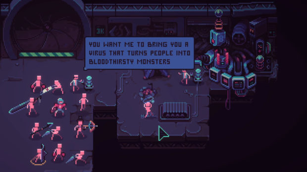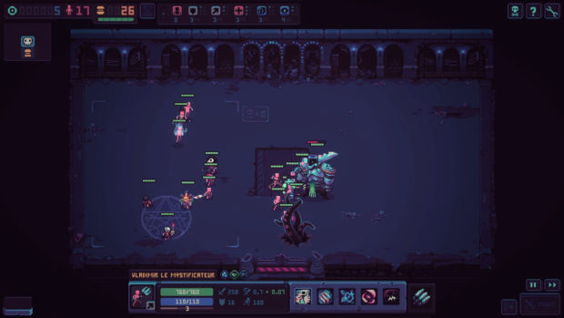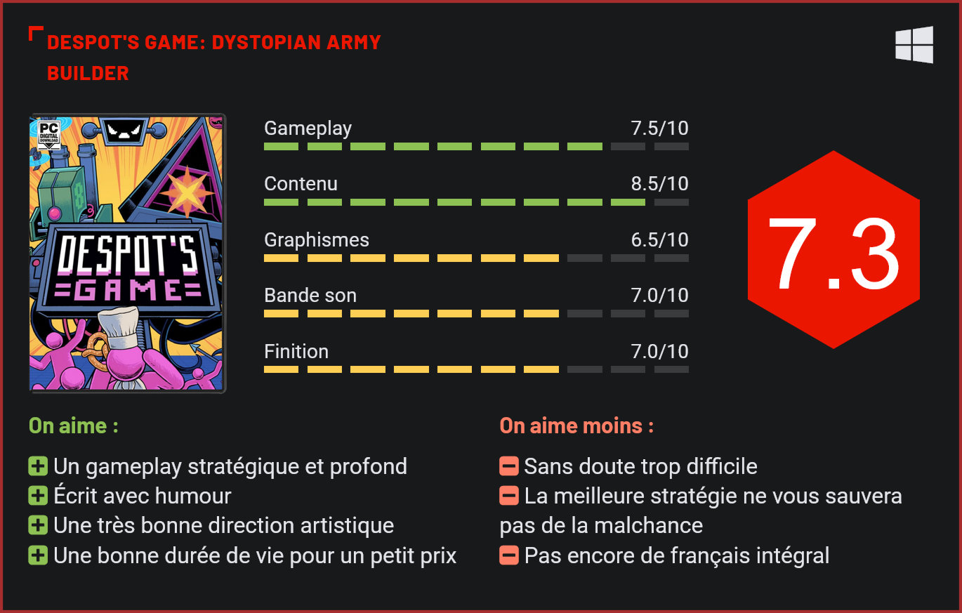 Après un premier titre sorti en 2018, Konfa Games propose cette fois Despot’s Game: Dystopian Army Builder, un mélange de stratégie et de rogue-like très convaincant. Les joueurs ont déjà pu s’y essayer dans une démo lors du Steam Game Festival au début de l’année, Despot’s Game débarque en ce mois d’octobre en accès anticipé. Développé par un studio du nom de Konfa Games et édité par tinyBuild, il s’agit d’un savant mélange de jeu de stratégie et de rogue-like. Despot’s Game: Dystopian Army Builder est le successeur d’un autre titre nommé Despotism 3k, sorti en 2018. Il s’agissait d’un jeu de gestion dans lequel nous incarnions une intelligence artificielle devant exploiter des humains. Despot’s Game reprend beaucoup de son prédécesseur. Son ambiance, de nombreux éléments graphiques ou encore son écriture teintée d’humour noir, tout cela était déjà dans le premier titre. Mais cette fois, il est question de prendre le contrôle des humains, forcés à participer à un jeu morbide par cette même intelligence artificielle. Ceux-ci doivent sortir sain et sauf d’un donjon où rôdent toutes sortes de monstruosités. Si le nombre d’humains qui composent notre armée est modeste au départ, celui-ci va vite augmenter. Nous devons donc gérer une troupe d’humains dans un donjon généré procéduralement. La majorité des salles abritent des monstres que les humains seront forcés d’affronter pour pouvoir progresser. Ces affrontements se font automatiquement une fois le bouton dédié enfoncé. Entre les combats, nous avons tout de même la possibilité de disposer nos unités comme bon nous semble sur le terrain. Il faut forcément prendre en considération qui sera envoyé en tête de notre armée. Une fois le combat terminé et quelques deniers empochés, certaines salles donnent accès à des magasins permettant d’acheter des armes mais aussi, et surtout, des humains pour venir renforcer vos rangs. En leur équipant une arme, ceux-ci prennent une des dix classes du jeu, des classes plutôt classiques de RPG tel que Tank, Mages, Soigneurs… Chacune des classes possède ses propres atouts et avoir plusieurs personnages avec des armes différentes de la même classe permet d’obtenir des effets passifs importants. À cela viennent s’ajouter les mutations, des effets passifs que l’on peut soit trouver dans certaines salles des donjons, soit acheter dans un arbre de compétence. Des effets qui peuvent s’appliquer à certaines classes ou à l’entièreté de l’équipe. Il faut également faire attention à notre réserve de nourriture qui se consomme à chaque changement d’écran. Avoir 10 humains dans notre armée consomme donc 10 unités de nourriture à chaque salle et va donc demander de se réapprovisionner souvent, et ce à l’aide de la même monnaie que pour les armes, humains et mutations. Notez qu’il est également possible de sacrifier des humains pour obtenir de la nourriture. Certains étages possèdent des événements qui peuvent rapporter gros. Chaque étage se termine par un boss qui, une fois vaincu, nous donne accès à une nouvelle zone. Tous les débuts de zone sont l’occasion d’un événement textuel qui donnera différents effets selon nos choix. Des évènements souvent écrits avec humour, parfois un peu d’humour noir, et bourrés de références aux jeux vidéo et à la pop culture. Cet aspect caractérise d’ailleurs une bonne partie du jeu. Derrière ses créatures au design apocalyptique, le titre fait preuve de beaucoup d’humour dans son écriture et dans le design des différentes classes d’humains. Despot’s Game est entièrement réalisé en pixel art et se montre très convaincant. Si l’apparence des humains paraît simpliste, les ennemis et autres personnages ont un design beaucoup plus travaillé. Les animations sont aussi très fluides et détaillées. Très rythmé, la bande-son propose de très bonnes compositions aussi, même si elles sont peu nombreuses. Le gameplay montre une bonne dose de profondeur grâce aux différentes possibilités qu’offrent les classes et les mutations. Il est, en général, préférable de se concentrer sur quelques classes et de trouver une synergie qui fonctionne, au lieu de jouer tout en même temps. Les différentes mutations exploitent bien les mécaniques du jeu et le titre devient vite addictif. Despot’s Game est bien plus proche d’un rogue-like que d’un rogue-lite, entendez par là que l’on progresse très peu entre les parties et que chaque game over nous demande de tout reprendre à zéro. Le titre devient vite très exigeant. Cet aspect amène forcément une petite frustration après une partie qui a peut-être duré plus d’une heure. L’autre élément frustrant du jeu c’est sa difficulté particulièrement impitoyable, et ce même en mode facile. Si terminer une run ne prend que quelques heures, y parvenir va demander de bien gérer ses dépenses et de réfléchir à la composition de son équipe. Mais plus que tout, ce qui semble important pour réussir c’est la chance de tomber sur de bons événements et sur de bonnes mutations. Malheureusement, la chance prévaut sur la stratégie. Il faudra également composer avec une traduction française encore incomplète mais qui devrait se finaliser dans les temps à venir. Le titre ne propose pas une densité de contenu très importante mais permet tout de même de débloquer des variations intéressantes de la formule de base et de comparer son armée à celle des autres joueurs une fois arrivé au bout du donjon. Despot’s Game n’est pas, pour l’instant, un de ces rogue-like qui vous tiendra durant des centaines d’heures, mais sa durée de vie est déjà très correcte pour le prix auquel il est proposé. Conclusion Successeur spirituel de Despotism 3k, Despot’s Game: Dystopian Army Builder est le nouveau titre du studio Konfa Games. Dans Despot’s G