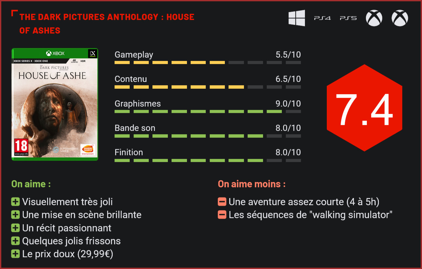 Troisième épisode de la saga “Dark Pictures” de Namco-Bandaï, House of Ashes reprend la formule de ses deux ancêtres sans apporter de grosses nouveautés. Ce nouvel épisode nous plonge toutefois dans une histoire passionnante qui prend cette fois place au Moyen-Orient. Après le grand large et la Nouvelle Angleterre, direction le Moyen-Orient pour ce troisième chapitre de la saga Dark Pictures de Namco-Bandaï. Juste à temps pour Halloween, l’éditeur nous livre le troisième épisode de sa série de jeux d’horreur narratifs. Si “Man of Medan” avait eu du mal à nous séduire, “Little Hope” était plutôt une jolie réussite. House of Ashes marche sur ses traces. La mise en scène est toujours aussi soignée. Pour les habitués, la formule reste la même. On est ici littéralement face à un film d’horreur interactif, une “histoire dont vous êtes le héros”, dans laquelle chacune de vos décisions aura un impact sur le scénario et sur le destin des personnages. Le gameplay se découpe en 3 types de séquences : les QTE pour les actions rapides, qui peuvent mener à la mort d’un personnage, les choix narratifs et les séquences de gameplay pures, qui se réduisent malheureusement une fois de plus à de l’exploration et de la collecte de collectibles. Comme son ancêtre, House of Ashes brille surtout dans sa narration, sa mise en scène et son esthétique. Visuellement, le jeu nous en met plein les yeux. Les environnements sont extrêmement détaillés, les modélisations superbes, les jeux de lumière aussi. Seuls les modélisations des visages et quelques effets visuels nous rappellent qu’on n’est pas face à un film. Les modélisations des visages sont très réussies. Niveau scénario, House of Ashes parvient également à très agréablement nous surprendre avec une histoire prenante. Le scénario prend place en Iraq, en 2003. Le régime de Saddam Hussein s’est effondré. Quelques poches de résistance subsistent. Une unité militaire est envoyée dans les Monts Zagros pour prendre d’assaut une installation qui pourrait abriter des armes chimiques. Dans la peau de chacun des membres de l’équipe, le joueur devra d’abord prendre d’assaut les lieux avant de s’engouffrer dans les profondeurs d’une grotte. Car sur place, la situation tourne vite au chaos. Après une secousse sismique, le sol s’ouvre. Les soldats sont, en parallèle, pris en embuscade par une unité iraquienne fidèle au régime de Saddam. Dans les ruines d’un temple sumérien, les survivants découvrent alors qu’ils ne sont pas les seuls à déambuler librement… Les phases de gameplay manquent cruellement d’intérêt. On le sent, Supermassive Games commence à maîtriser la recette. Les personnages croisés à travers cette histoire sont beaucoup plus profonds que dans les deux précédents titres. On s’attache également beaucoup plus facilement à eux. Jusque là, le studio suédois avait fait le pari de miser principalement sur des personnages très jeunes. Dans House of Ashes, vous incarnerez un groupe de marines, un soldat irakien et deux agents de la CIA. Le casting est alléchant. Tous ne se valent bien sûr pas. Mais les relations entre les différents personnages n’en restent pas moins captivantes à suivre. Le récit aussi. Car non seulement le changement de ton est brutal une fois l’intro passée, mais en plus, le récit ne cesse de nous surprendre avec plusieurs jolis retournements de situation. L’atmosphère au sein de la grotte est également claustrophobe au possible. Globalement, House of Ashes est un excellent divertissement. Le jeu alterne brillamment des dialogues passionnants à suivre, de l’exploration et quelques séquences d’action qui se jouent toujours sous la forme de QTE. Et la formule fonctionne globalement plutôt bien. Les choix du joueur ont un réel impact sur le scénario : certaines décisions causeront la mort d’un personnage instantanément. Les QTE restent très efficaces pour plonger le joueur au coeur de l’action. Les séquences “ingame” où l’on contrôle le personnage, beaucoup moins. Car s’il est intéressant de collecter des objets, collectibles et documents qui nous en apprennent plus sur le scénario du jeu, la prise en main est ultra-rigide, les déplacements sont très lents et tout cela se résume finalement à un bête walking-simulator sans grand intérêt. On aurait beaucoup aimé que le jeu se transforme en TPS pour ne serait-ce que quelques courtes séquences… Les séquences horrifiques sont nombreuses. Un très gros travail a été réalisé au niveau de l’immersion avec une bande son glaçante, des doublages d’excellente qualité, une mise en scène absolument irréprochable et une jolie alternance entre les différents personnages – l’intro et le final sont également deux des moments parmi les plus forts de l’aventure. Enfin, comme dans les autres volets, les chapitres du jeu sont entrecoupés par de brefs interludes avec le narrateur qui analyse les choix du joueur. Comme dans les autres épisodes de la saga, l’aventure est jouable en solo mais aussi à plusieurs. L’expérience est amusante mais on ne va pas vous le cacher, nous avons personnellement trouvé que le titre était plus intéressant à parcourir en solo. Pour le boucler, il faudra compter entre 4 et 5 heures de jeu. La rejouabilité nous a également parue meilleure qu’avec les précédents volets, avec des choix beaucoup plus impactants. Bref, un grand oui, bien que le titre conserve quelques vilains défauts, hérités du premier volet… Si suite il y a, Supermassive Games devrait clairement se montrer plus ambitieux sur le plan ludique. Conclusion Après un second volet séduisant, Supermassive Games continue à peaufiner sa recette. Le studio suédois nous livre un jeu d’horreur narratif particulièrement prenant, qui surprend par la richesse de son scénario, de son univers, de sa mise en sc