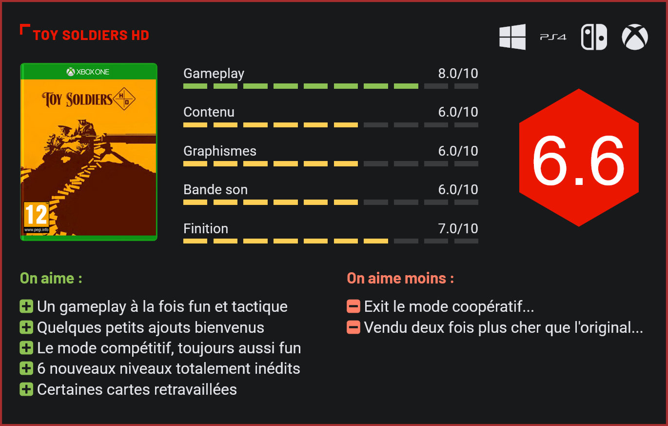 Sorti initialement sur Xbox 360 en 2010, Toy Soldiers était parvenu à s’imposer comme l’un des meilleurs jeux du catalogue du Xbox Live Arcade. 11 ans plus tard, il est de retour dans une version HD. Vous vous souvenez peut-être de ce sympathique tower defense baptisé Toy Soldiers, qui vous proposait de prendre le contrôle des forces alliées et des empires centraux à tour de rôle. A l’époque de sa sortie, le jeu avait reçu un accueil très chaleureux des critiques. Assez pour justifier la mise en production d’une suite baptisée Cold War, qui sortira quelques temps plus tard. A vous de personnaliser vos défenses pour empêcher l’ennemi de pénétrer vos lignes. Le concept du jeu était très simple : dans la peau de l’une des deux factions, le joueur devait renforcer ses lignes de défense. Au début de chaque mission, il devait utiliser le budget à sa disposition pour installer des mitrailleuses lourdes, canons, lance-flammes et autres machines meurtrières pour empêcher l’ennemi de pénétrer ses lignes. S’il s’agit avant tout d’un tower defense, Toy Soldiers se démarque des autres titres du genre par son approche unique : le joueur peut prendre le contrôle des unités sur le terrain en cours de partie et ainsi mitrailler ou arroser d’obus les forces ennemies qui le chargent. Il peut même contrôler quelques unités spéciales comme des chars, pour de bref instants sur le champ de bataille. De nombreux types d’unités sont à disposition du joueur. Toy Soldiers HD est un remaster dudit titre qui n’apporte en soi pas vraiment de grosse nouveauté mais a le mérite de débarquer cette fois sur tous les supports. Les développeurs ont axé leur travail sur deux angles bien particuliers : l’esthétique du titre, qui a été sensiblement retravaillée pour les écrans 4K, et le contenu. On retrouve tout le contenu du jeu original, de ses extensions, 6 nouvelles missions totalement inédites, mais en revanche pas le mode coop qui avait été ajouté à la réédition Toy Soldiers Complete sortie en 2016. On ne peut d’ailleurs s’empêcher d’être un peu déçu par l’absence de ce mode coop, qui était l’un des points forts de cette réédition. Qu’à cela ne tienne, le contenu reste généreux entre le mode solo qui vous occupera un bon moment, les nouvelles missions et le mode compétitif, toujours aussi fun. Toy Soldiers HD bénéficie également de quelques petites modifications au niveau de son contenu. Les développeurs se sont permis de revoir la configuration de certaines cartes pour les moderniser. Si vous aviez joué à l’original, vous ne remarquerez pas forcément la différence au premier coup d’oeil. Ce n’est qu’en y rejouant qu’on remarque ces petites améliorations. Le tir de barrage de Cold War a également été ajouté aux features du jeu. Rien de révolutionnaire, mais un outil de plus fort pratique pour le joueur, puisque celui-ci permet de faire le ménage dans les rangs ennemis en cas de coup dur… Chaque unité a son nemesis. Ce qui fait la richesse de Toy Soldiers, c’est à la fois son univers décalé avec ses petits soldats de plomb au look si délicieusement rétro, son curieux mélange de genres (action & tower defense), et le fun qui s’en dégage. Très accessible, le titre n’en reste pas moins tactique. Il faudra sans cesse faire des choix pour remporter la bataille. Si vous optez par exemple pour des mitrailleuses et canons pour massacrer l’infanterie ennemie, vous vous exposez à de potentielles attaques aériennes. Chaque unité a son nemesis dans Toy Soldiers. Il faudra donc combiner les différents types d’armes et surtout les positionner stratégiquement sur le champ de bataille pour espérer remporter la partie. Les troupes attaquant par vagues, il faudra continuellement s’adapter aux forces ennemies. Si l’IA fait plutôt bien son travail, Toy Soldiers encourage le joueur à prendre le contrôle de ses hommes sur le champ de bataille. Le joueur pourra facilement contrôler une unité et massacrera forcément davantage d’ennemis que l’IA. Fun en solo, le jeu montre tout son potentiel à deux joueurs, en duel. Difficile toutefois de justifier le coût de ce remaster, qui nous est vendu deux fois plus cher que le jeu original… Comme c’est malheureusement très souvent le cas avec les remasters de vieux titres indépendants… C’est d’autant plus regrettable que si ce remaster bénéficie de jolies petites retouches et de quelques petits contenus inédits, les ajouts restent modestes et techniquement, on ne remarque pas non plus une énorme différence avec l’original. Si vous l’avez encore dans votre collection de titres Xbox Live Arcade, ce remaster ne mérite donc pas forcément le détour. Pour tous les amoureux du tower defense qui étaient passés à côté de cet excellent titre à l’époque, voici en revanche une belle opportunité pour le découvrir (enfin)! Conclusion Sorti en 2010 sur Xbox 360, Toy Soldiers fait partie de ces tower defense qui ont marqué l’histoire du genre. Le jeu de Signal Studios nous plonge au cœur de la Première Guerre mondiale, aux commandes de l’une des deux factions qui s’affrontent. Le joueur devra ici installer des unités de défense pour protéger son coffre à jouets des assauts ennemis. Le titre tire son originalité du fait qu’il est possible de prendre le contrôle des tourelles et de certaines unités sur le champ de bataille. Tactique, mais très fun, Toy Soldiers brille toutefois surtout par son univers rétro plein de charme. Pas de boyaux étalés sur le champ de bataille ici. Les créateurs du jeu ont remplacé les soldats humains par de petits soldats de plomb. Ils parviennent ainsi brillamment à nous épargner les horreurs de la grande guerre pour transformer toute cette violence en un jeu de stratégie terriblement addictif. Le remaster reste toutefois assez pauvre en nouveautés. Exit le mode coop 