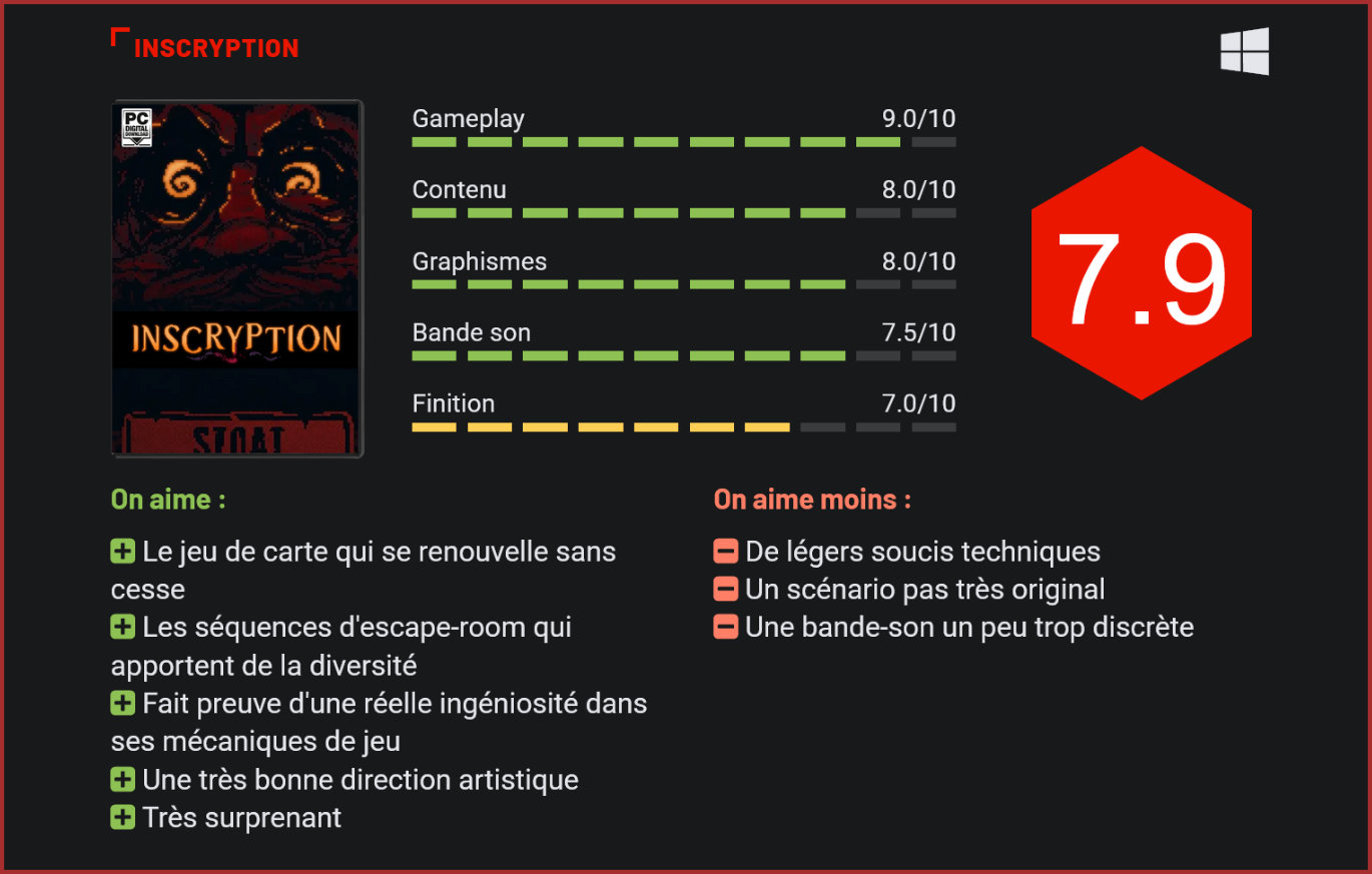 La période se prête à se lancer dans des aventures à l’ambiance effrayante et c’est tout à fait ce que propose Inscryption, un jeu de réflexion rogue-lite dont le cœur du gameplay repose sur un jeu de cartes sacrément ingénieux. Daniel Mullins, le créateur de Pony Island et de The Hex, propose un tout nouveau titre à l’aide de son studio et de l’édition de Devolver Digital. Inscryption est un jeu de réflexion possédant des mécaniques de rogue-lite et se jouant grâce à un jeu de cartes. Un titre à l’ambiance sombre et effrayante sans pour autant être un véritable jeu d’horreur, parfait pour cette période d’Halloween. Nous incarnons un personnage qui reprend conscience dans une cabane sinistre. Devant lui se tient un homme au regard fou et dont le visage est caché par l’obscurité. Cet homme force notre personnage à jouer à un jeu de rôle qui décidera de son sort. Un jeu dans lequel nous devrons affronter ce mystérieux individu qui, tel un maître de jeu, va revêtir différents masques pour incarner d’autres personnages et narrer les événements qui se produisent. C’est à l’aide de messages mystérieux et de cartes de jeu capables de parler qu’il faudra percer les mystères qui entourent cet endroit et réussir à aller au bout de ce jeu mortel. Le maître du jeu laisse tout de même le choix parmi différents évènements. Les affrontements se déroulent grâce à un jeu de cartes à collectionner. Chacune des cartes possède sa propre illustration, souvent à l’effigie d’animaux, ainsi que des points de vie, points d’attaques et coûts d’invocations. Il faut parfois sacrifier des créatures plus faibles pour invoquer les plus féroces et ainsi infliger des dommages à notre adversaire. Le but d’une partie est d’infliger assez de dégâts directement à l’adversaire pour faire pencher une balance complètement de son côté, chaque dégât va venir mettre une dent en or sur le plateau correspondant de la balance. Les duels sont entrecoupés de plusieurs événements dépendant de nos choix et du parcours généré procéduralement par le jeu. C’est à ce moment que Inscryption prend toute sa dimension de Deck Builder puisque ces évènements sont l’occasion d’ajouter de nouvelles créatures à son deck, de les renforcer, d’obtenir des objets de soutiens à utiliser durant les parties… Il est également possible de quitter la table de jeu pour se balader dans la salle où se trouve les personnages, l’occasion de réaliser quelques petites énigmes pour trouver des cartes, objets ou simplement pour faire progresser le scénario. Ces petites phases semblables à une escape-room ne sont pas régies par la génération procédurale du jeu mais apportent un peu de diversité. On passe tout de même la plupart du temps assis devant la table. Les duels contre les boss sont particulièrement corsés. Le jeu de carte en lui-même n’est pas bien différent de ce qui se fait dans le genre, on y retrouve pas mal de traits empruntés à des jeux comme Hearthstone ou encore Yu-Gi-Oh. Le titre n’en reste pas moins très agréable à jouer. Les règles de bases sont très simples mais sont renforcées par de nombreuses cartes aux effets variés. Tout comme dans les autres jeux du genre, il va falloir faire attention aux cartes qui composent notre deck. Il est préférable d’avoir des cartes qui fonctionnent ensemble et en accord avec notre manière de jouer, un manque de synergie peut véritablement gâcher une run. Inscryption fait également preuve d’une grande ingéniosité en nous plaçant dans de nombreuses situations qui vont renouveler le jeu de cartes. Le titre ne cesse de jouer avec ses propres règles sans pour autant nous perdre. S’il est assez difficile au départ, le jeu va devenir de plus en plus aisé au fil des runs. Rogue-lite oblige, Inscryption possède de nombreux éléments de progression qui sont conservés après nos nombreuses morts. Tout ce que nous avons découvert dans l’escape-room reste et les objets sont toujours en notre possession. Mais ce qui va surtout aider c’est la mécanique des cartes de mort. Une carte est réalisée à l’effigie de notre personnage lorsqu’il meurt. Les statistiques de cette carte sont une combinaison aléatoire de celles obtenues lors de la run et elles deviennent vite beaucoup plus faciles à invoquer et puissantes que les cartes standard. Ces cartes de mort ne sont cependant pas ajoutées à votre deck lors de la partie suivante, il faudra avoir la chance de tomber dessus lors des évènements. Mais plus l’on meurt, plus il y a d’exemplaires de ces cartes dans la nature. Il arrivera donc forcément un moment, au bout de quelques heures de jeu, où vous terminerez une run avec une facilité déconcertante. L’escape-room réserve quelques énigmes importantes. Côté visuel, Inscryption possède une direction artistique très marquée et réussie. Les graphismes sont réalisés dans un style rétro qui ne montre pas forcément ses défauts puisqu’il fait constamment très sombre, on ne voit que ce qu’il faut voir. Dommage que les musiques soient un peu trop discrètes, elles accompagnent tout de même très bien l’ambiance du jeu. Le titre est taillé pour être joué au clavier et à la souris, il ne prend malheureusement pas encore en compte les claviers azerty et il est impossible de changer les contrôles, ce qui est un peu pénible. Il est difficile de parler de Inscryption tant l’intérêt du jeu et de sa proposition repose sur la surprise. Ce que l’on croit être la fin n’est en réalité que le début d’un jeu plus grand et d’un scénario plus complexe. Un scénario pas particulièrement original mais intégré de manière ingénieuse dans le jeu. Avec son ambiance glauque et soignée, sa direction artistique et son jeu de cartes inventif, Inscryption s’impose comme un excellent titre mais également comme une véritable 