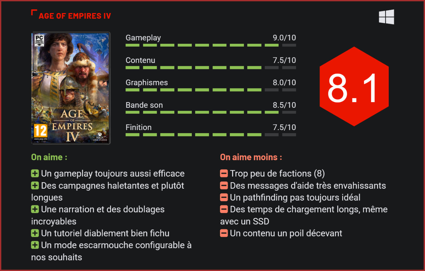 Après avoir offert une réédition en bonne et due forme de ses trois épisodes emblématiques, les développeurs de la franchise Age of Empires nous proposent enfin ce quatrième épisode tant attendu. Un retour aux origines de la saga qui fait du bien. 16 ans. 16 ans que le dernier épisode officiel de la saga des Age of Empires est sorti sur PC. Un opus qui avait plutôt divisé les fans de la première heure, qui portaient notamment dans leur cœur le second épisode de la franchise, considéré par beaucoup comme le meilleur. Le troisième opus, dernier en date, n’a pas connu de suite, si ce n’est des rééditions des trois épisodes originaux de la saga, n’apportant rien de vraiment neuf si ce n’est un gameplay légèrement modernisé et des graphismes revus. Nous voilà en l’an de grâce 2021, année synonyme du grand retour de la franchise, avec ce quatrième opus. Premier épisode de l’ère des Xbox Game Studios, Age of Empires IV était attendu au tournant. Les premières vidéos dévoilées en août 2017 avaient mis l’eau à la bouche des joueurs, qui étaient nombreux à espérer monts et merveilles d’un quatrième opus synonyme de grandes choses. Pour autant, AoE IV n’en oublie pas d’où il vient, avec un gameplay fortement inspiré des précédents opus, et notamment du second épisode. C’est principalement ce qui nous frappe le plus lorsque nous posons la main sur AoE IV. Lorsque nous contrôlons nos premières troupes, on ressent directement l’essence du second opus. La production des soldats et villageois est identiquement la même et les affrontements se vivent aussi intensément qu’à l’époque, si pas plus. Toutefois, si Age of Empires est jeu de stratégie en temps réel, ne le confondez pas avec Total War ce sont deux titres diamétralement opposés avec le premier qui privilégie le fun, la gestion des villageois et le combat rapproché là où le second met davantage l’accent sur la stratégie, la tactique et les batailles à très très grande échelle. C’est du gameplay, certes, déjà vu, mais ô combien efficace. Comme nous le disions plus haut, AoE IV ne change pas vraiment par rapport à ces aînés, puisqu’il en reprend les mêmes mécaniques de jeu et se permet de les affiner. On retrouve toujours le système d’époques (4 au total) permettant de débloquer de nouvelles unités et de nouveaux bâtiments. Le système de ressources reste peu ou prou le même, avec les quatre ressources à récolter en permanence pour financer l’achat des troupes, la construction d’édifices ou le changement d’ère, marqué par la construction d’un très joli et inspiré monument. Des mécaniques de gameplay connues, efficaces et qui ont su faire leurs preuves dans les trois premiers épisodes. Toutefois, il ne faut pas penser que les développeurs se sont contentés de récupérer le code d’Age of Empires II et de l’agrémenter. En effet, on notera l’arrivée de stratégie (minime) sur le champ de bataille, avec une meilleure exploitation de l’environnement. Des lanciers peuvent ainsi se cacher dans une forêt pour attaquer par surprise des cavaliers passant par là, tandis que les archers privilégieront les zones en hauteur pour viser de manière plus précise leurs ennemis. Certains passages de la campagne sont franchement mémorables. Pour ce qui est de son contenu, Age of Empires IV ne s’en sort pas trop mal, si ce n’est qu’il affiche un tout petit peu de paresse dans ses propositions. On retrouve d’une part un mode campagne qui tient enfin toutes ses promesses. A première vue, les quatre scénarios proposés paraissent maigres. Pourtant, la proposition est très intéressante, puisque chaque scénario est très riche et captivant, notamment grâce à une narration tout simplement incroyable. Les cinématiques sont par exemple toutes filmées dans le présent au drone en live action, et Microsoft est venu par-dessus rajouter de la réalité augmentée pour montrer les invasions féodales sur les ruines actuelles. Pendant les batailles, une narratrice vient animer les jougs et ajouter des explications historiques fort bienvenues grâce à, notamment, un doublage français de très grande qualité. La mise en scène des différentes batailles est elle aussi réussie avec, comme parfait exemple, la toute première campagne du jeu, lorsque nous incarnons l’armée de Guillaume le Conquérant dans la Bataille d’Hastings. Un moment mémorable, qui reflète toute la grandeur d’Age of Empires et des affrontements qu’il propose. Le mode escarmouche est hyper complet : il propose divers préréglages bien fichus mais également la possibilité de configurer comme bon vous semble votre partie. Outre cette très réussie campagne, on notera le développement d’un mode escarmouche relativement complet et bienvenu. Dans le menu principal, le titre vous propose deux choses : soit débuter une partie préformatée, soit configurer la vôtre de A à Z. Les préréglages ici proposés par Relic sont au nombre de 6, avec des configurations plutôt plaisantes : victoire par merveille, défense contre envahisseurs, seul contre l’IA ou avec des alliés… D’autre part, vous pouvez vous-même créer votre propre configuration. Tout est personnalisable : type de victoire, nombre de factions, type d’environnement, ressources de départ… Des configurations qui permettent une rejouabilité maximum, d’autant plus lorsque nous jouons en multi avec des amis. C’est notamment pour nous l’occasion de nous pencher sur ce qui fait donc la faiblesse d’AoE IV en termes de contenu. En effet, les développeurs semblent avoir volontairement laissé leur titre incomplet pour proposer par la suite du contenu additionnel. Il n’y aurait là rien de surprenant, surtout lorsque l’on sait que déjà sur les premiers opus des DLC étaient proposés. Ici, il n’y a que peu de places pour le doute, avec seulement 8 factions qui 