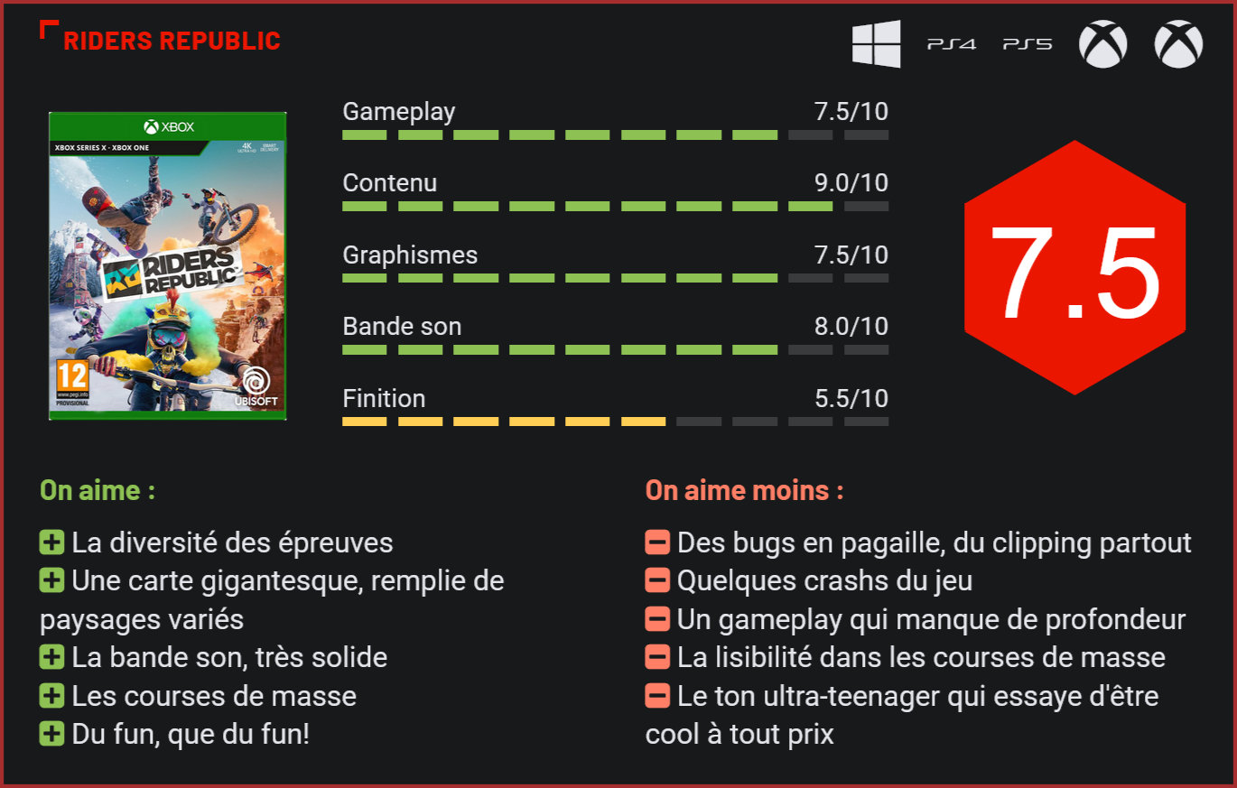 Après le sympathique Steep, Ubisoft Annecy nous revient avec un nouveau projet beaucoup plus ambitieux, qui rappelle, de par sa direction, l’excellent Extreme Sports sorti à l’époque sur Dreamcast… Vous vous souvenez sans doute du sympathique Steep, un jeu de glisse développé par le studio Ubisoft Annecy qui n’était pas le jeu le plus populaire du catalogue de l’éditeur mais qui était parvenu à se forger sa petite communauté. Cinq ans plus tard, le studio français nous revient avec un nouveau jeu de sports extrêmes, plus ambitieux, puisque Riders Republic nous plonge non seulement dans un gigantesque monde ouvert, mais propose également de tâter de davantage de disciplines sportives que son ancêtre. Outre le ski, le ski alpin et le snowboard, on retrouve le VTT, le wingsuit, le wingsuit à réacteur et d’une certaine façon aussi le motoneige. Le motoneige n’est pas une discipline sportive à proprement parler (dommage!), mais il vous servira à vous déplacer sur la carte. Avant d’aller plus loin dans ce test, il convient toutefois de le préciser : les amateurs de simulation sportive peuvent passer leur chemin. Avec Riders Republic, Ubisoft a choisi la voie de l’arcade pure et dure. Cela se ressent jusque dans le ton du jeu, qui essaye d’être cool jusqu’à l’excès, jusque dans certains de ses défis qui vous feront dévaler des pentes avec un déguisement de direct ou livrer des pizzas dans un camp scout. Riders Republic n’est pas un titre qui se réserve à une niche. Le jeu se positionne d’ailleurs assez étrangement davantage comme une alternative à un Fall Guys avec ses courses de masse qui opposent jusqu’à une soixantaine d’adversaires à travers un parcours rempli de pièges et de bosses que comme une simulation de sport. Le monde ouvert qui vous accueille en est le reflet. Si Ubisoft a pris la peine de modéliser dans les moindres détails les plus grands parcs nationaux américains, ceux-ci ont été réorganisés sur une carte fictive qui les interconnecte tous pour offrir aux joueurs un vaste terrain de jeu. Le wingsuit à réaction est très fun à diriger! Qui dit monde ouvert dit souvent totale liberté d’action. Et Riders Republic ne représente pas une exception à la règle. Vous serez libre de vous promener librement sur cette gigantesque carte qui propose une étonnante diversité avec ses paysages inspirés de parcs nationaux tels que ceux du Yosemite, du Sequoia, d’Arches, de Zion, du Grand Teton ou encore de Joshua. Ceux-ci ont été modélisés avec une justesse impressionnante. On dénombre également peu d’absents, si ce n’est peut-être le pourtant très iconique Yellowstone National Park. Majoritairement, vous serez ici face à des paysages montagneux, verdoyants et désertiques. Pas de destinations tropicales pour l’instant, ni d’ailleurs de sports nautiques. Si le jeu offre une jolie liberté d’action, en vous proposant d’explorer librement le monde, de participer aux compétitions de votre choix, de récupérer des trésors et d’admirer des panoramas, il propose néanmoins bel et bien un mode carrière structuré autour de six principaux championnats : les courses de VTT, les tricks de VTT, les courses de glisse, les tricks de glisse, le wingsuit et le wingsuit à réaction. Chaque discipline dénombre entre 15 et 30 événements. Le contenu est donc très solide. Il y a en effet largement de quoi se tenir occupé pendant plusieurs jours, voire semaines… Les courses de masse vous feront affronter une soixantaine d’adversaires en temps réel. Globalement, explorer ce vaste monde ouvert et participer à toutes les compétitions est un véritable délice. On ne se lasse pas de si tôt du concept. D’autant plus qu’on alterne ici entre toutes les disciplines et les paysages. Une progression non-linéaire qui joue donc tout à l’avantage du titre. Bien sûr, toutes les disciplines ne se valent pas. On le sent, Ubisoft Annecy maîtrise tout particulièrement les sports de glisse. La conduite du VTT est beaucoup plus approximative, très arcade dans l’esprit, et pas suffisamment technique. Le wingsuit est fun à contrôler, mais également un peu trop facile à diriger selon nous. On notera d’ailleurs que les chutes ne sont guère très punitives puisque votre personnage se relèvera aussitôt ou respawnera avec un délai de 3 secondes… A moins de tomber sur des adversaires vraiment coriaces, difficile donc d’être abandonné par le peloton. Le jeu tente parfois d’être cool à tout prix, quitte à se coller une image très (trop?) teenager. Extrêmement fun à prendre en main, en grande partie de par l’excellence de ses tracés et les excellentes sensations de vitesse, Riders Republic manque toutefois de technicité dans son gameplay, qui se révèle finalement relativement facile à maîtriser. On aurait aimé un peu plus de complexité, ou au moins, quelques options de contrôle supplémentaires. Trop souvent, cela se résume à accélérer et foncer en ligne droite, en évitant l’un ou l’autre trou. Là où les choses se gâtent, c’est au niveau de la finition. Surtout, lorsque celle-ci affecte le gameplay, et notamment lors des fameuses courses de masse qui vous font affronter une soixantaine d’opposants à travers une série d’épreuves. Les débuts de partie représentent souvent un grand n’importe quoi. Soixante joueurs s’élancent à toute vitesse en ligne droite. Les chocs sont nombreux et projettent certains joueurs valdinguer dans les décors. D’autres sont – par miracle – épargnés. La gestion des contacts avec les autres joueurs est tout simplement catastrophique dans Riders Republic. Une fois, le choc vous expédiera contre un arbre. La fois suivante, vous traverserez l’autre joueur sans que cela n’affecte votre conduite… Les bugs sont nombreux dans le jeu, le clipping aussi. Les décors “pop” à l’horizon en permanence. Le jeu 