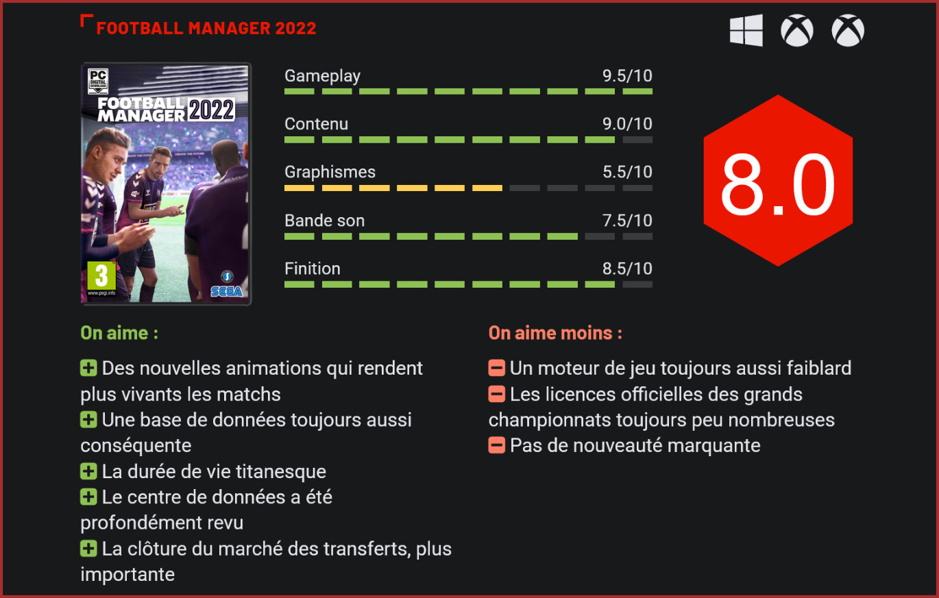 Année après année, Football Manager assoit toujours plus son emprise sur le milieu de la simulation vidéoludique de management de foot. Ne se reposerait-elle toutefois pas sur ses lauriers ? Qui dit rentrée vidéoludique dit, indéniablement, retour des traditionnelles simulations footballistiques sur PC et consoles. Si nous avons d’un côté FIFA qui permet de prendre le contrôle d’une équipe de onze joueurs, Football Manager offre quant à lui la possibilité au joueur de se placer dans la peau d’un entraîneur. Une simulation de niche et exigeante qui est, petit à petit, parvenue à s’imposer comme la référence de la simulation de management. Certains ont essayé de faire redescendre FM de son piédestal, sans jamais réellement y arriver. Qu’à cela ne tienne, Football Manager est de retour, et ce n’est pas pour nous jouer un mauvais tour. L’année passée, l’épisode nous avait, une fois de plus, tout simplement conquis, avec un contenu toujours aussi conséquent et des nouveautés plutôt plaisantes, notamment en match. Un épisode quasi parfait donc, mais qui amenait une interrogation : la perfection peut-elle se renouveler et faire encore mieux ? Rien n’est moins sûr, et c’est notamment ce que nous avons cherché à savoir avec Football Manager 2022, le millésime de cette année. Comme chaque année, c’est de par son contenu que la franchise de Sports Interactive impressionne. Aucun joueur actuel n’a été généré aléatoirement, tous sont présents, même ceux de la première division saoudienne ou du championnat du Gibraltar. La base de données est incroyablement conséquente, avec plusieurs centaines de milliers de joueurs officiels présents. Les clubs ne sont pas tous sous licence, ce que l’on regrettera une fois de plus, mais les noms restent toujours très reconnaissables. Heureusement, année après année, la franchise se dote de nouveaux partenariats. Quelques championnats majeurs sont ainsi sous licence, comme la Bundesliga, la Ligue 1 ou encore la majorité des clubs de la Serie A. Pour ce qui est des modes de jeu, on retrouve les traditionnels modes solo, multijoueurs et un mystérieux mode Face à Face, qui n’est pas encore disponible, mais qui, selon les informations de Miles Jacobson (patron de Sports Interactive), feraient s’affronter deux joueurs pour un unique match et comparer les tactiques. Le dernier jour du mercato est plus marquant. Il s’agit d’une des rares nouveautés du titre, qui peine visiblement à se renouveler. Dans son gameplay, Football Manager ne reste principalement adapté qu’aux sessions de jeu en solo. Evidemment, le titre propose depuis des années de jouer en multijoueur, chacun à la tête d’une équipe, mais ces parties ne sont jamais vraiment très excitantes, avec des périodes extrêmement longues à attendre que l’autre joueur ait fait ses choix ou encore quand il faut attendre que son match soit fini. Le mode Fantasy Draft, assez semblable à Ultimate Team sur FIFA, a notamment été revu et amélioré, avec par exemple une nouvelle modification des budgets plutôt bienvenue. Finalement, c’est bien en solo que FM se vit le mieux. Et avant de commencer une carrière, il est primordial de créer votre entraîneur. L’éditeur de personnage a été grandement modernisé par les équipes de SI, avec plus d’outils, notamment au niveau du visage. Un éditeur amélioré plaisant, mais qui démontre clairement les lacunes techniques du titre. Depuis plusieurs années, la franchise stagne avec son moteur de jeu, avec des matchs très datés visuellement. L’on se demande si ce n’est pas l’arrivée d’un nouveau moteur de jeu qui permettra à Football Manager d’être enfin la simulation ultime de management. Elle l’est en l’état, mais avec un moteur de jeu digne de ce nom, ce serait la cerise sur le gâteau. Ce n’est pourtant pas faute d’avoir essayé de la part des développeurs. Après l’introduction de nouveaux modèles 3D l’année dernière, nous avons cette année droit à une centaine de nouvelles animations pour les joueurs. Plus fluides, mais également plus réalistes, ces nouveaux mouvements ajoutent bien plus de vie aux matchs. Les changements de direction sont désormais moins saccadés, les remises en jeu moins robotisées, tandis que les plongeons des gardiens sont bien plus réussis. Ce ne sont que quelques exemples parmi tant d’autres, et cela permet enfin d’avoir des joueurs vivants et moins inspirés de Robocop. Les animations des joueurs ont été grandement améliorées lors des matchs. Dommage que les graphismes restent trop sommaires. Une fois notre équipe choisie, les choses sérieuses peuvent enfin commencer. Le novice qui n’a jamais mis les mains sur Football Manager va voir débarquer une pléthore d’informations regroupées dans plusieurs dizaines de menus, au risque de vite être perdu. Heureusement, un tutoriel permet très vite de s’acclimater à l’interface à première vue austère de la franchise. Pour le joueur habitué, il se retrouvera en terrain conquis. L’interface est la même, et le tutoriel permet alors de découvrir les quelques nouveautés de l’édition 2022. Parmi celles-ci, on retrouve le tout nouveau ‘data center’. Depuis plusieurs années, on pouvait recruter des analystes et un responsable des analystes dans la franchise. Leur utilité n’était pas toujours très évidente, même si l’on suppose qu’ils permettaient d’approfondir vos connaissances des joueurs étrangers et leur potentiel. Désormais, vos analystes vous permettront d’obtenir un nombre incroyablement élevé d’infos sur l’équipe que vous allez affronter dans votre prochain match, mais également sur vos propres joueurs. Efficacité des buteurs, lacunes sur une des ailes, pourcentage de réussite des passes ou encore xGen de votre équipe, tout y passe. C’est bien simple, nous passerions bien des heures dans le cent