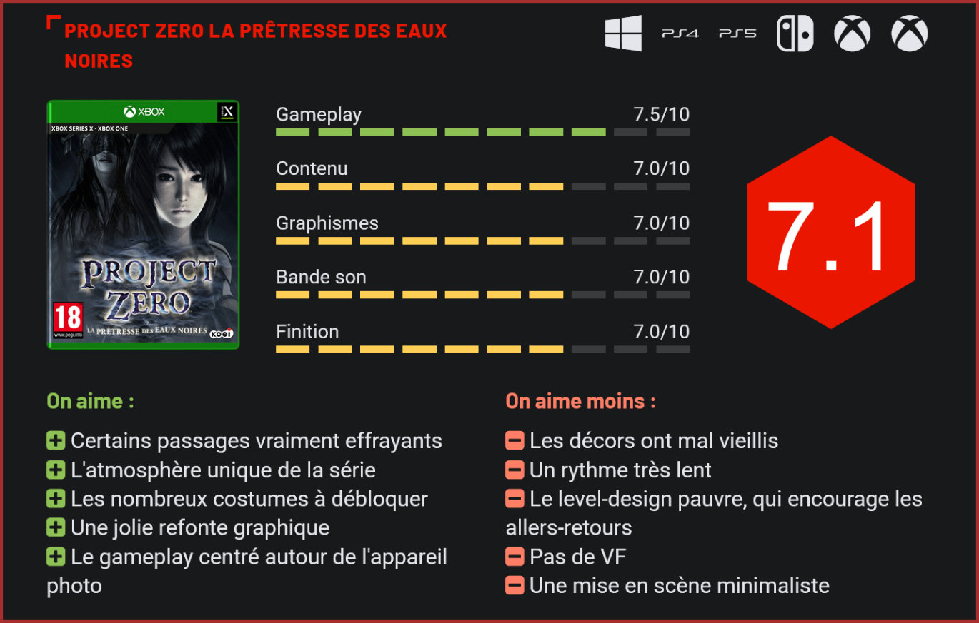 Rangée au placard depuis des années, la série des Project Zero nous revient aujourd’hui avec un remaster du cinquième épisode, qui était sorti à l’époque exclusivement sur WiiU. Le survival-horror de Tecmo mérite-t-il toujours le détour? Succès inattendu en son temps, le premier Project Zero était parvenu à créer la surprise en son temps avec son concept unique. Le survival-horror de Tecmo tirait son originalité de son approche du genre. Pas d’arme à feu ni d’objets contendants ici : le joueur devait utiliser un appareil photo pour éliminer les esprits qui s’attaquaient à lui. Le jeu prenait également place dans un univers très différent de celui d’un Resident Evil ou Silent Hill en s’inspirant assez ouvertement des classiques du cinéma horrifique japonais. Les modèles 3D des personnages ont été joliment retravaillés. Le cinquième épisode, sorti uniquement sur WiiU en 2014, avait sonné le glas d’une franchise sur le déclin depuis des années. Visiblement conscient du potentiel de sa franchise, l’éditeur Tecmo avait annoncé un remaster du jeu, qui sortirait cette fois sur tous les supports. L’occasion de permettre à tous les fans de la franchise d’y goûter – enfin -, mais aussi d’ouvrir la série à un nouveau public. Rassurez-vous d’ailleurs, il est inutile d’avoir joué aux précédents épisodes pour ce plonger dans ce cinquième volet, l’histoire du jeu étant complètement stand-alone. Ambiance, ambiance… La Prêtresse des Eaux Noires nous narre l’histoire de plusieurs jeunes femmes dotées de capacités spéciales qui vont découvrir un pan caché de leur histoire en explorant les abords du mont Hikami, un lieu de culte où se sont récemment produits des suicides collectifs. Plongé au coeur d’une enquête, le joueur devra y explorer des zones reculées : des forêts aux caves de bâtiments désaffectés, à la recherche d’esprits qu’il devra affronter à l’aide de son appareil photo. S’il ressemble à s’y méprendre à un survival horror old-school avec ses décors étriqués, sa progression très linéaire, ses objets à collecter, le jeu offre un gameplay très rafraîchissant, principalement basé sur l’utilisation d’une caméra. Le joueur devra manipuler celle-ci pour cadrer les esprits qu’il rencontre et enchainer les photos en tentant de capturer un maximum d’esprits sur chaque cliché, pour réduire ainsi progressivement leur essence. Ceux-ci ont la capacité de vous causer des dommages bien réels. Il faudra donc être très prudent dans ses déplacements et ne pas hésiter à reculer de quelques mètres tout en enchainant les portraits de défunts. S’il paraît assez simple, le gameplay réserve quelques subtilités, comme le mode rafale, un système pour ralentir les entités spectrales ou des sortes de super-attaques. Il ne faudra en tous les cas jamais baisser sa garde et être très réactif à chaque rencontre. Les décors sont très étriqués. L’ennui, c’est que le jeu avait été pensé à l’époque pour être joué avec le gamepad de la WiiU. Pad en main, il n’est pas toujours évident de s’y retrouver car les déplacements et la visée sont beaucoup plus lents qu’avec le système gyroscopique de la WiiU. Si vous avez le choix, il sera donc préférable d’y jouer sur Switch, la seule console à joliment émuler le gameplay de l’époque. Rassurez-vous toutefois, si la tâche est plus compliquée au pad sur PS4 ou Xbox One, cela reste “jouable” – certains affrontements vous demanderont juste de vous y reprendre à plusieurs reprises. On ressent clairement une certaine gêne, qui était déjà présente à l’époque des quatre premiers volets de la franchise. La jouabilité du titre a mal vieilli, mais le côté très rétro du jeu lui donne toujours un certain charme. La présentation est très banale. L’aspect très rétro du jeu est d’ailleurs clairement ce qui lui donne le plus de charme : de ses mécanismes de jeu hérités des Resident Evil / Silent Hill de l’époque à son atmosphère pesante. Project Zero reste l’une des franchises les plus effrayantes. L’atmosphère y est pour beaucoup, mais les jump scares sont également nombreux. Les développeurs jouent également à 200% la carte du fan-service avec le plein de tenues à débloquer pour toutes les héroïnes du jeu, des costumes inédits par rapport à la version WiiU et un personnage inédit aussi : Ayane, de Dead or Alive, que vous pourrez incarner une fois l’aventure bouclée. Techniquement aussi, le jeu surprend plutôt agréablement avec ses modèles 3D remis au goût du jour, très joliment modélisés, et ses quelques jolis effets visuels. Les décors et animations ont en revanche assez mal vieilli. Pour un jeu WiiU, le titre a toutefois fière allure, même en 2021. Tecmo a réalisé un excellent travail de remasterisation. Ayane fait partie des personnages déblocables. Pour autant, La Prêtresse des Eaux Noires est malheureusement loin d’être exempt de défauts. On regrette tout d’abord la mise en scène minimaliste du jeu. Le titre comporte bien quelques cinématiques, mais chaque chapitre est généralement introduit par un texte à la mise en scène minimaliste. Entre chaque chapitre, le joueur sera ainsi déconnecté de l’atmosphère quelques instants, et ne pourra s’y replonger que quelques minutes plus tard. C’est tout de même dommage pour un jeu qui prône l’immersion. Les cinématiques ne sont d’ailleurs pas non plus franchement exceptionnelles avec une mise en scène là aussi très minimalisme et peu d’ambition dans les angles de vue… Autre gros défaut du jeu : son level-design sans aucune ambition. Le joueur a peu d’espace pour se mouvoir, il doit régulièrement effectuer des allers-retours et ce sont systématiquement les mêmes décors qui nous sont resservis jusqu’à l’overdose… Côté durée de vie, on dénombre une dizain