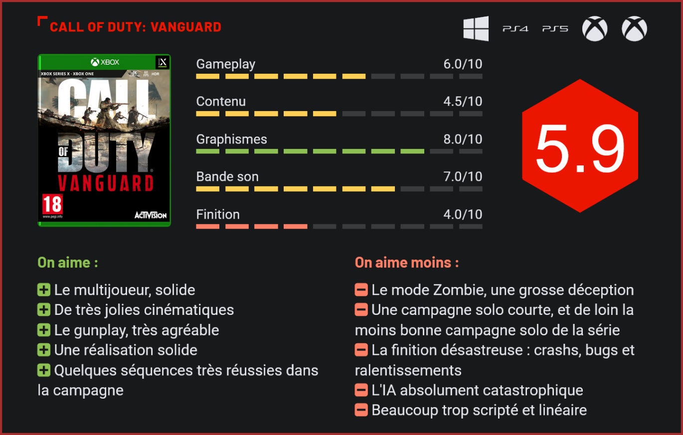 Un an presque jour pour jour après Call of Duty Cold War, Activision nous livre le dix-huitième épisode de sa série. Changement de contexte pour cet opus, qui délaisse la Guerre froide pour nous replonger au cœur de la Seconde Guerre mondiale. Devenue une franchise actuelle, la série des Call of Duty peine à se renouveler. Activision avait certes tenté de repartir d’une feuille blanche avec Black Ops IV, qui proposait une expérience exclusivement multijoueur. Le mode de jeu Warzone, qui avait été introduit avec cet opus, est devenu un jeu à part entière. Depuis, on est revenu à la même formule : une campagne solo très axe sur la narration, accompagnée par un mode multi très classique et occasionnellement un mode Zombie. L’acte final vous plonge au cœur de Berlin pour une opération suicide. Avant d’aller plus loin dans ce test, il convient de rappeler un élément primordial. Chaque épisode de la série est pris en main par un studio de l’écurie d’Activision. Infinity Ward, le studio qui a créé la franchise, est généralement associé aux épisodes les plus réussis de la série. Notamment, les Modern Warfare. Treyarch a fait du mode Zombie sa grande spécialité. Sledgehammer Games est quant à lui considéré comme le maillon faible du trio. Le studio américain a certes réalisé le sympathique WW2, mais également l’épisode Advanced Warfare, considéré par beaucoup comme l’un des plus mauvais de la franchise. Malheureusement, Vanguard marche sur ses traces… Un gros travail a été réalisé au niveau de l’immersion. Le jeu est divisé en trois parties : un mode campagne en solo très court, que vous bouclerez en moins de 4 heures en difficulté standard, un mode Zombie presque anecdotique et un mode multijoueur très solide. Clairement, il est difficile de ne pas être déçu pas le mode campagne, qui est non seulement très court (potentiellement le mode solo le plus court de la franchise!), mais souffre également d’un scénario qui n’est guère passionnant et d’un level-design sans aucune imagination. Le joueur prend ici le contrôle d’une escouade de soldats d’élite envoyés au coeur de Berlin pour une mission suicide. L’essentiel des missions seront toutefois des flashbacks pour apprendre à connaître les différents personnages de votre escouade – une façon pour les développeurs de nous faire participer aux batailles du front Ouest, Est, d’Afrique et du Pacifique à tour de rôle. L’idée était bonne, mais dans la pratique, la seule chose vraiment positive qu’on retire de cette aventure, ce sont les superbes cinématiques, nombreuses et presqu’aussi longues que les segments de jeu. Car c’est là le principal défaut de cette campagne : Sledgehammer Games semble avoir conçu son aventure comme une série d’expériences immersives qui vous place à tour de rôle dans la peau d’un aviateur, d’un sniper et d’un fantassin sur plusieurs lignes de front. Les séquences de jeu sont très courtes (5 à 10 minutes), découpées en plusieurs segments (1 minute d’infiltration, 1 minute de shoot intense, 1 minute de fuite sur des toits…), et le tout manque cruellement de liant. De surcroit, si certaines séquences sont très réussies – principalement les gunfights -, d’autres le sont beaucoup moins à l’image de cette séquence d’infiltration dans le désert de Lybie, dans laquelle nous avons pris le soin de nous cacher d’une patrouille de soldats allemands, pendant que nos deux soldats sont restés en plein sur leur chemin, et n’ont pas été remarqués. La patrouille est passée ensuite devant un cadavre, qu’elle n’a pas non plus remarqué… Même topo pour les séquences de sniping, qui manquent de profondeur. Le joueur doit demander à son allié d’attirer leur attention pour les aligner ensuite calmement pendant qu’ils sont occupés à canarder cette cible. Aucune tension, aucune profondeur. Et on ne parle même pas des combats de boss, presque grossiers, ni de la séquence en vol, dans laquelle vous ne contrôlerez pratiquement que la mitrailleuse de votre avion. C’est fade, incroyablement scripté et ultra-assisté. Même pour un habitué de la franchise, il y a de quoi être sacrément surpris par cette direction ultra grand public qui donne au jeu l’allure d’un “film interactif”. L’une des séquences les plus réussies vous plonge dans le désert lybien. Finalement, on en vient à se demander pourquoi Sledgehammer a tenu à tout prix à nous proposer un shooter aux relents épiques offrant une telle diversité d’action. Car la seule chose qui fonctionne vraiment, ce sont les gunfights. Arme en main, Vanguard est fun. Et on en vient à regretter que le titre ne s’inspire pas davantage des anciens opus de la série – en particulier les Call of Duty 2 et 3 -, qui proposaient de longues séquences de combat intenses avec son escouade. Les séquences de ce type ne durent généralement pas plus de 5 ou 10 minutes dans le jeu, et ce sont de loin celles qui fonctionnent le mieux. On est d’autant plus surpris du fait que les développeurs ont modélisé un nombre impressionnant d’armes et d’explosifs pour cet épisode – plus que dans n’importe quel épisode “historique” de la série. L’arsenal est délicieusement varié, et pourtant, vous n’utiliserez sans doute pas plus de la moitié des armes dans la campagne solo… L’attaque d’un convoi dans le désert est l’un des moments forts de la campagne. Le mode solo de Vanguard donne cette curieuse sensation de n’être qu’une courte introduction à une véritable campagne, qui ne viendra finalement jamais. Pour tout vous dire, nous l’avons terminée en moins de 3 heures top chrono. Et le besoin d’y retourner ne se fait pas vraiment ressentir… Quelle ne fut pas notre surprise d’ailleurs lorsque nous nous sommes rendus compte que le constat pour le mode Zombie est encore plus désastreux