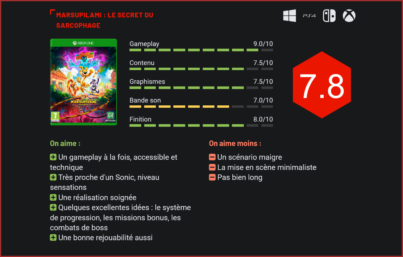 Avec Marsupilami : Le Secret du Sarcophage, Ocellus Studio nous livre une adaptation très réussie de la célèbre bande dessinée en jeu vidéo. Le jeu de plates-formes tire ouvertement son inspiration des premiers Sonic. C’est devenu presqu’une habitude. En fin d’année, l’éditeur Microids nous livre une floppée de titres de tous genres, à la qualité très variable. Cette année, l’éditeur français a toutefois changé les règles du jeu en intégrant à son portfolio quelques adaptations de bandes-dessinées, ciblant un public plus jeune. Parmi les titres annoncés, Marsupilami : Le Secret du Sarcophage, un jeu de plates-formes en 2D dont on n’attendait pas grand chose et qui est au final l’une des excellentes surprises de cette fin d’année. Le jeu est très coloré. Inspiré de la bande-dessinée éponyme, qui compte aujourd’hui 33 albums, le jeu vous place dans la peau de trois marsupilamis : Punch, Twister et Hope, qui mènent une vie paisible en Palombie, un pays imaginaire de l’Amérique du Sud. Leur quotidien se voit transformé du jour au lendemain par une terrible malédiction qui transforme les animaux en des créatures extrêmement agressives. Les développeurs se sont contentés ici du minimum syndical en matière d’immersion avec un scénario qui tient sur une ligne, une brève cinématique d’introduction et une mise en scène minimaliste. On aurait clairement aimé un scénario plus développé, peut-être davantage axé sur une thématique écologique ou sur différents albums de la BD… La bonne nouvelle, c’est que si la mise en bouche est minimaliste, on plonge immédiatement au cœur du jeu. Les niveaux bonus épousent une esthétique très rétro. Côté gameplay, le jeu tire son inspiration d’un grand classique du genre : Sonic. Il reprend la vue latérale et plusieurs mécanismes du titre de Sega avec ses séquences de jeu extrêmement rapides, ses niveaux bonus dans lesquels il faut emmagasiner un maximum de points, ses combats de boss… Tout en introduisant quelques spécificités, avec un système de déblocage des niveaux qui est basé sur la collecte d’objets spécifiques, un nombre de vies limité dans la progression, qui vous oblige à être très prudent dans chaque niveau, et un mode facile pour les plus petits dans lequel le joueur dispose d’un nombre illimité de vies. Les premiers niveaux sont très faciles mais la difficulté se corse très vite avec des pièges nombreux et variés, des séquences de plates-formes qui exigent un timing parfait, de la réflexion aussi avec des mini-énigmes environnementales, et des combats face à un bestiaire relativement varié. Le jeu parvient à brillamment se renouveler tout au cours de l’aventure avec de nouveaux éléments de gameplay, de nouvelles créatures, de nouveaux défis. Parcourir les niveaux du jeu est d’ailleurs un véritable bonheur tant ceux-ci regorgent de zones secrètes à découvrir, de défis amusants, et réserve finalement un challenge musclé même aux habitués du genre en mode difficile. Notre Marsupilami dispose d’ailleurs d’une jolie palette de mouvements. Il est non seulement capable de bondir d’une plate-forme à l’autre, mais aussi de rouler, de donner des coups avec sa queue, de glisser sur des parois verticales et de s’accrocher à différents objets pour se propulser de l’un à l’autre en un temps record. Le chrono ajouté dans certains niveaux oblige le joueur à se déplacer pour atteindre son objectif en un temps limité. La difficulté est au rendez-vous. Si l’aventure n’est pas bien longue – il est possible de finir le jeu en 4 heures de jeu en ligne droite -, la rejouabilité est excellente grâce aux différents niveaux de difficulté, aux nombreux collectibles à débloquer, aux niveaux secrets à découvrir, au mode Time Attack et à la très jolie diversité des environnements traversés, qui vont de la jungle palombienne aux temples perdus en passant par la ville côtière. A 39,99€, le contenu proposé reste très décent, d’autant plus que le jeu est vraiment très plaisant à parcourir et s’adresse tant aux débutants qu’aux amoureux du genre. Car c’est finalement là la plus belle réussite de ce Marsupilami : parvenir à convaincre à la fois un public jeune, qui découvrira en lui un jeu fun et décomplexé, et un public de passionnés, qui verra en lui une très belle alternative à l’excellent Sonic, dans un univers frais, et avec une bonne dose de challenge dans le mode hard. La palette de mouvements est assez variée. Artistiquement, le jeu est également une jolie réussite : c’est frais, coloré, le character design rappelle celui de la bande dessinée, et les graphismes sont très jolis. Les créateurs du jeu ont opté pour un joli style en 2.5D qui colle parfaitement à l’univers du titre. S’il n’est pas optimisé pour les consoles next-gen, le titre reste très joliment optimisé avec une action fluide, de jolis contrastes dans les décors, et aucun bug rencontré au cours de notre aventure. Bref, incontestablement, une très bonne surprise. Conclusion On n’en attendait pas grand chose. Marsupilami : Le Secret du Sarcophage s’impose toutefois comme une excellente surprise. Le jeu d’Ocellus Studio s’inspire très ouvertement d’un Sonic, côté gameplay, avec une vue latérale, des séquences de jeu très nerveuses et des niveaux bonus dans lesquels il faut emmagasiner un maximum de points en un temps limité. A la fois très accessible pour les néophytes avec son mode débutant très permissif, et très technique pour les amoureux des jeux de plate-forme, le titre offre un sérieux challenge même pour les connaisseurs avec des niveaux de plus en plus exigeants, qui sont remplis de pièges à éviter, mais également de secrets à découvrir. On reprochera au titre de ne pas mettre assez en avant ses personnages charmants et son scénario, qui nous est à peine p