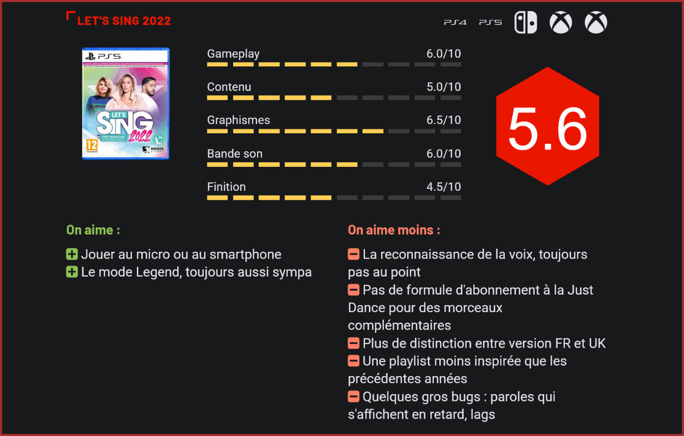Après une cuvée 2021 réussie, Voxler rempile et livre un nouvel épisode qui, cette fois, fait vraiment du sur place. Depuis quelques années, la série des Let’s Sing tente de se renouveler avec de petites nouveautés, sans vraiment exploser. Il faut dire que les jeux de karaoké n’ont plus vraiment la cote. L’éditeur s’entête avec un épisode 2022 qui n’apporte vraiment pas grand chose de neuf. Ce premier épisode “next-gen” est pour ainsi dire une parfaite réplique de son prédécesseur. Il reprend la même interface, les mêmes modes de jeu, le même schéma de fonctionnement. Et, malheureusement, les mêmes défauts également… Le système de reconnaissance vocale est toujours aussi bateau. Pour autant que vous preniez le même ton que la voix du chanteur ou de la chanteuse et baragouinez n’importe quoi, vous marquerez des points. Alors oui, ça reste sympa de pouvoir y jouer à la fois sur smartphone, avec l’app dédiée, et avec un micro entièrement dédié. Au moins, il n’y a pas forcément besoin de débourser quelques euros de plus pour un micro… Plus de la moitié des morceaux sont en français. On retrouve également une belle diversité au niveau des modes de jeu avec le mode Legend qui s’apparente à un mode solo dans lequel on enchaine les défis sur différentes thématiques, un mode Classique dans lequel il faut faire le plus de points, un mode mix tape, un mode duo, du jeu en ligne, et un mode party qui permet à deux équipes de quatre joueurs de s’affronter – plutôt fun entre amis. Mais où sont les nouveautés? De surcroit, le modèle économique du jeu n’est toujours pas à la page. On paye l’édition 2022 pour sa playlist, et c’est tout. Il n’est pas possible de souscrire à une formule mensuelle pour accéder à un catalogue de chansons comme dans un Just Dance par exemple. Plusieurs packs de chansons payants sur des thématiques diverses sont en revanche disponibles à la vente… Plus de distinction entre les versions internationale et française, cette année. Plus décevant encore : il n’y a plus de distinction entre les versions internationale (avec une playlist en anglais uniquement) et française (avec environ la moitié de chansons françaises). Si vous achetez le jeu, vous avez accès à la playlist de votre pays. Playlist qui, cette année, n’est pas non plus des plus excitantes avec un paquet de vieilleries déjà croisées par le passé, dont du Offspring, du Wham, du David Bowie, et des choix douteux. Le seul titre de David Guetta proposé n’est autre que “Let’s love”, pour Aznavour, c’est “Emmenez-moi” et pour M. Pokora “Si on disait”. Il y en a clairement pour tous les goûts, à un tel point qu’on a du mal à savoir que public vise cette compilation… Et puis, il y a la finition qui surprend. Sur Xbox Series, certaines paroles s’affichent en retard, de petits ralentissements se font ressentir, avec parfois des effets indésirables sur vos performances puisqu’il n’est pas rare de rater systématiquement les premières secondes de sa performance à cause de ces soucis techniques. Bref, à moins d’avoir vraiment flashé sur la playlist de cet épisode, difficile de le conseiller. Les deux précédents lui étaient en tous points supérieurs. Clairement, le studio doit se remettre en question : sa formule fonctionne toujours, mais il est temps d’y apporter du neuf et notamment au niveau du modèle économique, vieillissant. Conclusion Souffrant d’une formule qui peine à se renouveler et d’un modèle économique vieillissant, Let’s Sing 2022 ne parvient guère à surprendre. Si le jeu de karaoké offre une jolie diversité au niveau de ses modes de jeu, on ne retrouve rien de vraiment neuf dans cet épisode, qui se contente de renouveler sa playlist. Les choix en la matière sont douteux, d’autant plus que les acheteurs n’ont plus le choix entre les versions FR et internationale. Il faudra se contenter d’une playlist à moitié française et à moitié anglaise… Cette cuvée 2022 offre également une playlist relativement décevante, avec beaucoup de classiques et peu de nouveautés. Si vous n’aviez jamais touché à un Let’s Sing, pas de panique, vous vous y amuserez malgré tout. Si vous êtes un habitué de la série, cette cuvée 2022 est sans doute l’épisode le plus dispensable de la série. D’autant plus que les problèmes techniques sont nombreux.