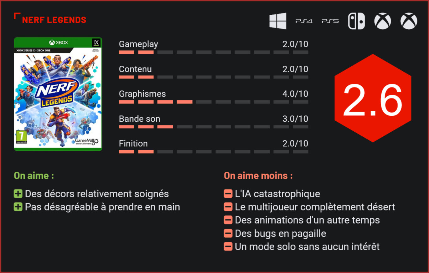 Sorti de nulle part, Nerf Legends est un shooter compétitif qui joue la carte du fun pour se démarquer, tout en s’inspirant assez ouvertement de Fortnite pour sa direction artistique. Les shooters multijoueurs pullulent. C’est un fait, il est difficile pour un petit studio de percer. Plus encore lorsque celui-ci choisit un modèle premium avec un prix de vente à 39,99€. C’est le surprenant choix de Gamemill, un studio américain qui a choisi de se reposer sur la licence Nerf pour sa dernière création. Les décors sont relativement soignés. Se jouant entièrement à la première personne, le titre propose deux sections distinctes avec d’un côté un mode multijoueur en ligne, auquel nous n’avons jamais pu jouer car nous n’avons pas croisé une âme en deux jours… et un mode solo composé d’une série de défis qui durent de 15 à 40 minutes. Si l’idée de combats intenses avec des armes Nerf était séduisante sur le papier, dans la pratique, le mode solo exploite très mal l’ADN de la franchise. Les défis de Nerf sont l’archétype du mauvais goût : une série de niveaux sans queue ni tête, avec des tas de combats en arènes contre des ennemis complètement décérébrés – qui vous laisseront notamment leur tirer dessus sans réagir si vous êtes positionné derrière eux ou caché partiellement par un panneau -, des boutons à actionner pour progresser, un level-design d’une pauvreté rarement vue dans un jeu vidéo et, pire encore, un gameplay en grande partie basé sur… de la plate-forme. Car si vous affronterez ici des robots et tourelles de combat dans les arènes, vous passerez la plupart de votre temps à sauter de plate-forme en plate-forme et à chercher des interrupteurs pour progresser dans le niveau. Rarement dans notre carrière de gamer nous avions vu un concept aussi mal exploité. Des séquences de tir dans les airs, en rebondissant dans tous les sens, quelle bonne idée. Pour ajouter à notre malheur, il faut composer tout au long de l’aventure avec des bugs en pagaille, des animations d’un autre âge, est un bestiaire extrêmement peu varié. La proposition du jeu était très séduisante sur le papier, et on s’en doute, le titre a été pensé pour être joué à plusieurs. Mais il est absolument impossible d’y jouer à l’heure actuelle avec quelqu’un : le titre ne propose pas de multi en local, il ne semble pas cross-play et vu son prix et les notes qu’il récolte, il est peu probable qu’une communauté se crée autour… C’est d’autant plus dommage que arme en main, il n’est pas si déplaisant de shooter, si l’on met de côté la rigidité du viseur. Nerf Legends se joue (presque) comme un Call of Duty. Le joueur dispose d’une panoplie complète d’armes : il peut switcher du révolver à la mitrailleuse au fusil en un instant. Les armes sont mêmes customisables et peuvent être débloquées tout au fil de l’aventure… Les armes se débloquent au fil de l’aventure. L’univers du jeu a également son charme avec ses jolis décors ultracolorés. On ressent ici l’influence de Fortnite. Tout cela nous a toutefois semblé très mal exploité à travers le mode solo avec des ennemis au character design atroce, un level-design sans inspiration et des défis très fades… qui ont également la fâcheuse tendance à s’éterniser. Ajoutons que bien que le jeu soit pensé pour les plus jeunes, il n’a pas de doublages en français. Il faudra lire à l’écran de tout petits textes pour comprendre ce qu’on attend de nous… Bref, vous l’aurez compris, voilà un joli fiasco. Conclusion Séduisant sur le papier avec sa promesse de combats intenses en ligne et sa direction artistique qui rappelle instantanément celle de Fortnite, Nerf Legends est toutefois un joli fiasco dans la pratique. Le jeu de Gamemill est facturé 39,99€. Ce qui réduisait déjà d’entrée de jeu les chances du titre de réussir à se forger une solide communauté. Les serveurs sont vides. Impossible à ce jour de lancer la moindre partie. Le mode solo est quant à lui une véritable catastrophe. Il nous propose de participer à une série de défis sans intérêt face à des ennemis d’une stupidité aberrante dans des niveaux au level-design sans inspiration. Les développeurs ont de surcroit eu la drôle d’idée de mélanger plates-formes, combats et exploration. Un mélange de genres qui ne fonctionne absolument pas. Techniquement, le jeu n’est pas vilain, mais l’abondance de bugs, les animations d’un autre âge et le character design sans personnalité en font un titre dans lequel il est très difficile de se plonger. Ne tournons pas autour du pot, Nerf Legends est un mauvais jeu. Très probablement, celui qu’il faut éviter à tout prix en cette fin d’année.