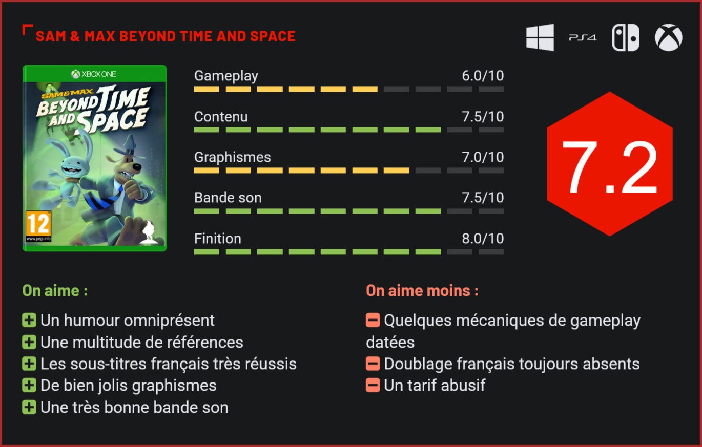14 ans après la sortie du titre original développé par Telltale, Sam & Max : Beyond Time and Space s’offre un petit lifting. Après autant de temps, le jeu vaut-il toujours l’investissement ? De sa création en 2004 à sa disparition, 14 ans plus tard, en 2018, le studio américain Telltale Games était le maître incontesté du jeu en point & click puis des jeux narratifs épisodiques. Avant d’adapter des franchises cultes comme Batman, The Walking Dead ou Game of Thrones, le studio avait fait ses lettres de noblesse avec l’adaptation vidéoludique de la saga de comics Sam & Max. Il y a un peu plus d’un an, le studio Skunkape Games, formé d’anciens employés de Telltale, s’attaquait à la saison une de Sam & Max. Cette fois, c’est la saison deux, Beyond Time and Space, qui profite d’un lifting avec des graphismes remis au goût du jour et une aventure plus moderne. Le côté loufoque de la série reste bien marqué et plaisant. Dans cette saison 2, nos deux héros feront plusieurs voyages à travers l’espace-temps pour, encore une fois, sauver le monde. Comme dans la première saison, nous restons sur un point & click légèrement différent, avec plusieurs mini-jeux proposés, un titre plus orienté sur l’aventure et la narration et qui se veut plus adapté aux consoles. Comme il s’agit d’un remaster, les nouveaux développeurs ne se sont “contentés” que de remettre à jour les graphismes et n’ont pas touché aux mécaniques de gameplay. Celles-ci ne sont ainsi pas toujours des plus pratiques, comme lors des mini-jeux avec des contrôles très lourds, ou lorsqu’il faut sélectionner l’objet ou la personne avec lequel interagir. Les aller-retours sont notamment très nombreux entre les différents lieux d’un épisode, ce qui casse indéniablement le rythme de l’aventure, les temps de chargement se multipliant. Sam & Max, c’est une franchise dans laquelle l’humour est omniprésent. Dans quasiment toutes les lignes de dialogue, les personnages se permettent une petite pique ou une référence à la pop-culture. Mieux encore, les sous-titres français sont adaptés pour que les francophiles aient une référence adaptée à leur culture. Par exemple, les personnages citent à de nombreuses reprises des chansons anglaises dans le doublage original. Avec les sous-titres français, ce sont bien souvent des chansons françaises qui sont reprises, comme “Femme Libérée” de Cookie Dingler ou encore des références à l’Histoire, comme la célèbre réplique de Jules César “Tu quoque mi fili” que Sam lance à un robot qu’il a lui-même conçu et qui veut le tuer. On regrettera malheureusement qu’il n’y ait toujours pas de VF. D’ailleurs, c’est un des reproches que l’on pourrait faire à la franchise. Ce n’était pas le cas avec la première saison, c’est pareil ici : il n’y a toujours pas de doublages français. Le gameplay n’est pas hyper accessible, et l’absence de version francophone rend l’accessibilité du titre encore plus restreinte. Ceux qui ne sont pas capables de lire tout en jouant seront irrémédiablement laissés sur le carreau, d’autant plus que les lignes de dialogue s’enchaînent très vite. Il n’y a pas de doublage français, mais c’est l’occasion de découvrir des voix originales de grande qualité. Ce sont, certes, les mêmes qu’il y a 14 ans, mais la recette fonctionne toujours autant. Les musiques viennent quant à elles rythmer les enquêtes de la meilleure des manières et viennent très bien accentuer l’aspect “policier” du titre. Visuellement, ce remaster est très réussi. Enfin, qui dit remaster, dit indéniablement mise à jour graphique. Le rendu est sensiblement le même que pour la première saison, avec des univers toujours aussi colorés, mais aussi et surtout des textures affinées, un affichage enfin en 16:9 et du Full HD. Les modèles des différents personnages sont eux aussi plus propres, comme s’il s’agissait d’un nouveau jeu en lieu et place d’une modernisation. Conclusion Après un remaster d’un premier épisode très réussi, le studio Skunkape nous livre sa suite, très attendue. Sam & Max Beyond Time & Space remastered conserve tout ce qui a fait le succès de l’original : son humour piquant, son univers coloré, ses énigmes délirantes et ses dialogues très savoureux. Niveau gameplay, on se replonge ici dans les années 90 avec un point & click à l’ancienne, qui propose par ailleurs aussi quelques séquences de mini-jeux. Ca a forcément vieilli, niveau contrôles, et les non-anglophones se retrouveront très probablement sur le carreau, vu l’absence de doublages et la rapidité des dialogues, mais pour les fans de la franchise, ce remaster reste un joli cadeau. Le jeu bénéficie d’un lifting bienvenu, avec des textures et modèles 3D bien plus fins et propres. L’humour piquant et la multitude de références dans les dialogues sont toujours d’actualité et raviront plus que probablement les nostalgiques de la franchise. On regrette en revanche que ce remaster soit vendu presque deux fois plus cher que l’original, en son temps…