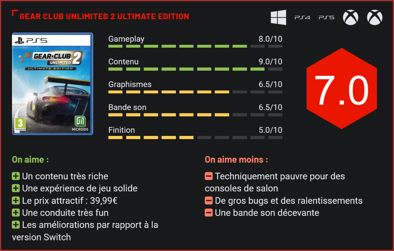Exclusivité au catalogue de la Switch jusqu’à ce jour, Gear.Club Unlimited 2 a enfin droit à un portage sur les consoles next-gen et PC. Cette Ultimate Edition, qui comprend toutes les extensions sorties à ce jour et bénéficie de quelques retouches graphiques, est-elle à la hauteur de nos attentes? Née sur mobile, la série des Gear.Club était parvenue à s’imposer sur Switch comme la série incontournable pour tous les amateurs de grosses cylindrées. Il est vrai que l’absence de concurrence sur ce support à grandement contribuer à la renommée du jeu sur Switch… Car clairement, face à un Forza Horizon 5 par exemple, le jeu ne fait pas le poids. Pour autant, cela ne signifie pas qu’il ne mérite pas le détour sur consoles de salon. Car ne l’oublions pas, on retrouve des vétérans de l’industrie au volant. En l’occurrence, le studio Eden Games, à qui l’on devait notamment les deux Test Drive Unlimited. Les environnements du jeu sont souvent très pauvres. Gear.Club 2 avait eu droit à plusieurs rééditions sur Switch, qui ont progressivement ajouté de nouveaux contenus. Sur PC et consoles de salon, les joueurs auront d’entrée de jeu droit à la version intégrale du jeu, qui comprend donc toutes ses extensions. Le jeu de base se présente comme un jeu de courses arcade dans une sorte d’open-world. Le concept est simple : vous reprenez en main l’écurie familiale et enchainez les compétitions sur des tracés aux quatre coins de la carte. La conduite est résolument très arcade, sans sombrer dans le Burnout-like. Car pour remporter les courses, il faudra mine de rien faire preuve de finesse. Le titre se démarquait à l’époque par le fait qu’il était possible d’acheter de nouveaux véhicules pour venir garnir son garage, mais aussi de les améliorer en remplaçant le moteur par exemple ou les plaquettes de frein. Le côté évolutif des véhicules est véritablement au coeur du gameplay. Le joueur peut également “pimper” ses véhicules à l’extrême en revoyant leurs designs, stickers, selon ses envies. Le joueur peut faire évoluer son garage et améliorer chaque véhicule… On retrouve au total une soixante de véhicules sous licence, de marques prestigieuses comme Porsche, BMW, Ford, Alfa Romeo, McLaren ou encore Mercedes. Il y a bien sûr quelques grands absents, comme Ferrari. L’aventure solo est plutôt costaude : il y a les épreuves principales qui mélangent compétitions avec classements, courses à élimination, courses chronométrées, puis les épreuves secondaires, qui permettent elles de gagner de gros crédits pour améliorer son garage. On dénombre tout de même plus de 250 défis dans ce mode carrière! Là où le jeu déçoit en revanche, c’est au niveau de son univers, qui manque de diversité malgré ses quatre “biomes”, avec des décors trop pauvres visuellement pour les consoles de salon, et qui manquent cruellement de charme. Sur Switch ou mobile, ça passait, sur consoles de salon et PC, il faut bien avouer que le jeu ne fait pas le même effet… Les courses offroad font partie des plus funs du jeu. Là où Gear.Club 2 a une carte à jouer en revanche, c’est avec ses campagnes solo “complémentaires”, les fameuses extensions du jeu de base. On passera rapidement sur l’aventure Porsche qui n’est finalement qu’une extension du jeu principal avec des bolides de la marque Porsche pour se concentrer sur les courses sur circuits, en Endurance, qui apportent beaucoup de fraicheur au titre. Tout d’abord parce que la conduite est ici plus technique. Ensuite, parce qu’on y découvre de nombreux nouveaux tracés sur circuits. Enfin, parce que le gameplay change radicalement : il faudra prendre en compte l’usure des pneus et le plein du véhicule pour choisir au bon moment de faire sa pause. Une dimension stratégique qui rend ladite extension presque plus intéressante que le jeu de base. Les 24 Heures du Mans auraient également pu faire mouche, si les courses qui prenaient place sur ledit circuit ne souffraient pas de gros ralentissements… Même sur next-gen, ces séquences de jeu sont pratiquement injouables avec un frame rate qui s’effondre littéralement. Les courses sur circuits apportent un réel plus. On notera par ailleurs que de façon générale, cette Ultimate Edition souffre d’un réel manque de finition. Au cours du mode carrière nous avons été confrontés à de nombreux bugs dont un assez perturbant. Lors de certaines courses, vos adversaires disparaissent littéralement de l’écran – tout en étant toujours présents, mais invisibles. Et non, on ne parle pas ici du mode contre la montre, face aux fantômes. Ca arrive relativement peu (chez nous, 8 courses sur 150), mais lorsque cela se produit, il faut avouer que l’immersion en prend un sacré coup. Côté conduite, Gear.club est en revanche un titre très plaisant, avec une prise en main très accessible. C’est de l’arcade pure, avec toutefois une conduite plutôt réaliste – plus en tout cas que dans un Forza Horizon ou un Burnout. Passer sur les bordures d’un circuit vous ralentit, mal négocier un virage peu conduire à un tête à queue et il est impératif de maîtriser le frein et le drift. De plus, tous les véhicules se dirigent différemment. Certains bolides sont beaucoup plus rigides que d’autres. On sent également réellement la conduite évoluer à chaque upgrade du véhicule… Le circuit du Mans est malheureusement complètement injouable en raison des baisses de frame-rate. La partie gestion est l’une des autres réussites du mode carrière. Bien sûr, tout cela reste très cosmétique. On se contente de personnaliser son gigantesque garage, d’améliorer ses véhicules, d’augmenter le niveau chaque atelier, mais tout cela nous rappelle furieusement l’excellent Racing Evoluzione de Milestone, et en dépit du manque de profondeur, on prend un certain plaisir à faire évoluer