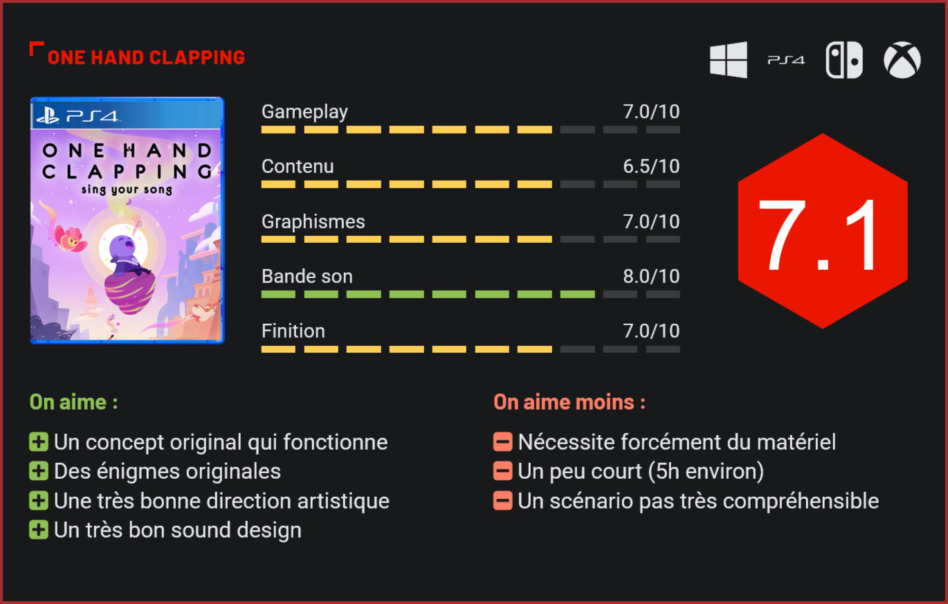 Le tout premier jeu du studio indépendant Bad Dream Games propose un concept original qui pourrait plaire aux artistes vocaux et faire fuir les personnes allergiques au chant. One Hand Clapping est un puzzle-platformer en 2D qui propose sa vision unique du genre. Fruit de nombreuses années de développement, One Hand Clapping est le premier jeu d’un petit studio indépendant du nom de Bad Dream Games. Un projet qui a pour but de revisiter différemment le genre du puzzle-platformer en 2D. Le titre propose un jeu de plate-forme et de réflexion qui utilise notre voix comme outil. Il faut alors fredonner ou carrément chanter de différentes manières pour résoudre des casse-têtes. Certains décors sont de vraies réussites visuelles. On y incarne un petit personnage qui traverse la ville du Silence, une cité plongée dans l’obscurité de la nuit et rongée par des apparitions ténébreuses. Grâce au pouvoir du chant, notre personnage parvient à en sortir sain et sauf et commence son voyage dans une région désertique. Complètement muet, le scénario du jeu est en fait très peu compréhensible et se résume presque à un prétexte pour parcourir des décors différents. On y croise plusieurs personnages qui nous aident grâce à leurs compétences en chant, mais ceux-ci ne sont pas particulièrement mémorables. S’en dégage tout de même des ambiances marquantes et différentes selon l’environnement traversé. La ville du Silence est sombre et anxiogène mais on arrive vite dans d’autres décors bien plus lumineux. Le titre est particulièrement réussi graphiquement et nous laisse l’occasion d’admirer ses décors grâce à quelques passages contemplatifs. Les différents environnements sont très colorés et vivants, les personnages bénéficient de très bonnes animations qui les rendent très expressifs. Utiliser sa voix permet de réaliser de nombreuses actions. Compte tenu du concept, One Hand Clapping est un titre qui nécessite du matériel pour fonctionner. Il est impossible d’y jouer de manière traditionnelle, il faut impérativement posséder un micro pour progresser. Le titre reste un jeu de plate-forme en 2D reposant majoritairement sur des énigmes, les déplacements et sauts se réalisent grâce à une manette ou au clavier et ne nécessitent qu’une main dans le but de laisser l’autre libre pour tenir notre micro. Notre outil le plus important dans ce jeu, celui qui fera fonctionner de nombreuses mécaniques, est notre voix. Celle-ci va permettre de réaliser tout un tas d’actions comme faire bouger des structures, propulser des objets, contrôler la direction du vent, créer des plateformes, et bien d’autres choses encore. Il ne s’agit cependant pas de crier dans le micro durant ces quelques heures d’aventure, une bonne partie de ces mécaniques requiert d’utiliser sa voix de différentes manières. De nombreuses énigmes du jeu demandent de réaliser des sons aigus ou graves, ce qui donne des résultats différents. Certaines mécaniques nous demandent de tenir certaines notes et d’autres parties du jeu nous demandent carrément de chanter, avec une interface qui fait beaucoup penser à celle de Singstar, mais sans les paroles. Nos cordes vocales sont mises à rudes épreuves, même si certains passages qui reposent sur des énigmes rythmiques mais sans l’utilisation de la voix ou encore des moments plus calmes surviennent souvent dans l’aventure pour nous permettre de souffler. Le titre reste accessible et ce qu’il attend de nous n’est pas très compliqué à réaliser, le jeu arrive à nous guider grâce à son level design et à ses personnages. Mais tout n’est pas pour autant aisé puisqu’il faut parfois effectuer des actions un peu techniques avec notre voix pour pouvoir progresser. Le concept est original et fonctionne plutôt bien. Le rythme de l’aventure se montre assez lent, limite relaxant, de sorte à nous laisser le temps de réussir les épreuves voir même de les recommencer au besoin. La hauteur des notes que l’on produit agit sur certaines mécaniques. Comme on peut s’y attendre d’un jeu au concept pareil, One Hand Clapping propose un sound design particulièrement soigné. De très bonnes compositions accompagnent notre aventure, des morceaux qui ne possèdent pourtant pas de mélodie forte et envahissante, ce qui permet de laisser une certaine place à notre voix et à nos performances. Les musiques du jeu parviennent à atteindre un juste milieu qui nous donne envie de chanter par-dessus. L’aventure reste tout de même assez courte, il ne faut pas beaucoup plus de cinq heures pour en voir le bout, et ce même si quelques secrets se cachent dans les niveaux. Quelques légers bugs sont à noter mais ceux-ci sont rarement très impactant, il est possible de revenir au dernier checkpoint à n’importe quel moment via le menu du jeu en cas de besoin. One Hand Clapping reste un titre au concept original et bien exploité, même si ce même concept ne plaira pas à tout le monde. Conclusion One Hand Clapping est un jeu qui propose un concept original, celui de jouer à un jeu de plate-forme et de réflexion en utilisant notre voix pour résoudre les énigmes. Il demande donc de posséder un micro pour le bon fonctionnement de l’aventure. On y incarne un petit personnage qui traverse la ville du Silence, une cité plongée dans l’obscurité et rongée par des apparitions ténébreuses. Le pouvoir de sa voix permet à notre personnage d’en sortir et de commencer son périple dans une région désertique. Un peu trop cryptique, le scénario n’arrive pas à se rendre mémorable, à l’inverse de son gameplay. Si l’on contrôle notre personnage de manière classique pour le déplacer et sauter, la majorité des mécaniques des niveaux vont fonctionner grâce à notre voix. Il faut alors chanter de différentes manières pour faire bouger des structures, créer des plateformes… Un concept 