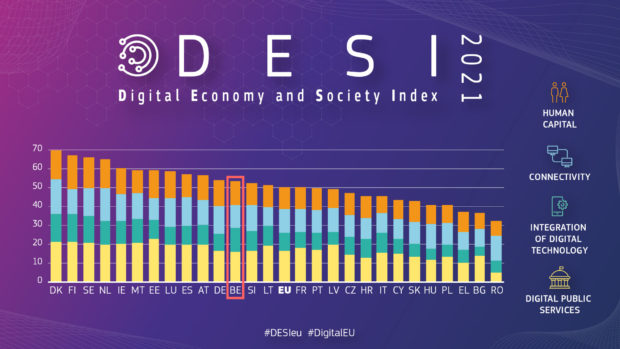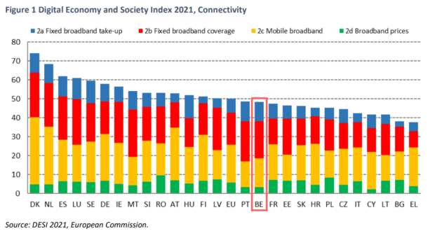 Le niveau des réseaux Internet fixes et mobiles est bon, mais le retard de la 5G en Belgique lui fait perdre des points par rapport aux autres pays européens. Le rapport annuel de l’Institut belge des services postaux et des télécommunications (IBPT) montre que la Belgique dispose d’une bonne couverture Internet au niveau mobile et fixe, mais reste en retard sur certains points, notamment sur la 5G. Les résultats de l’IBPT se basent notamment sur le rapport de la Digital Economy and Society Index (DESI), qui place cette année la Belgique à la 12e place des pays européens dans leur évolution numérique, alors qu’elle occupait la 9e place l’année dernière. C’est le Danemark, les Pays-Bas et l’Espagne qui occupent les premières places du podium. La Belgique occupe désormais la 12e place sur le classement réalisé par la DESI. © DESI Une bonne couverture, mais une 5G à la traîne Le rapport de la DESI se décompose en quatre points : le capital humain, l’intégration des technologies numériques, les services publics numériques et la connectivité. C’est sur ce dernier point que la Belgique prend du retard. Elle occupe la seizième place en Europe en termes de connectivité. La Belgique occupe la seizième place en Europe en terme de connectivité. © DESI Le capital humain désigne les spécialistes des TIC (technologies de l’information et de la communication) et de personnel avec des compétences numériques suffisantes présents dans chaque pays. Le rapport note une progression générale dans tous les pays de l’Union européenne. La Belgique présente la proportion la plus élevée d’entreprises employant des spécialistes des TIC, avec 30 %, contre 19 % en moyenne. Les entreprises belges forment également de plus en plus leur personnel aux TIC. Concernant l’intégration des technologies numériques, la Belgique occupe la 6e place. La majorité des PME belges présentent au moins un niveau élémentaire d’intégration numérique et un quart profitent des opportunités offertes par l’e-commerce. Plus de 40 % des entreprises belges ont recours au cloud pour enregistrer leurs données. En termes de services publics numériques, la Belgique occupe la 17e place. Elle se place juste en dessous de la moyenne européenne. La raison de ce mauvais classement est à trouver principalement du côté des services publics numériques pour les citoyens. Les services publics numériques pour les entreprises et l’administration en ligne se situent en revanche au-dessus de la moyenne. Enfin, l’implantation du haut débit (au moins 100 Mb/s) atteint un bon niveau en Belgique, mais accuse un retard important en termes de 5 G. La préparation et la couverture insuffisantes sont notamment pointées par le rapport. Ce retard pourrait toutefois diminuer à l’avenir, car la mise aux enchères de plusieurs bandes de 5G est prévue pour le début de l’année 2022. Des zones blanches subsistent L’IBPT note dans son rapport que la couverture peut être moins bonne dans certaines communes de la Région wallonne. L’institut explique cela par une densité de population plus faible qui rend moins rentables pour les opérateurs les investissements massifs dans ces zones. Bien que la couverture du réseau dans notre pays soit très élevée, l’Institut note également qu’environ 47.000 ménages n’ont toujours pas accès à des débits de 30 Mb/s et que 138.000 n’ont pas accès à des débits de 100 Mb/s. Il reste donc d’importantes « zones blanches » où des améliorations restent à effectuer.