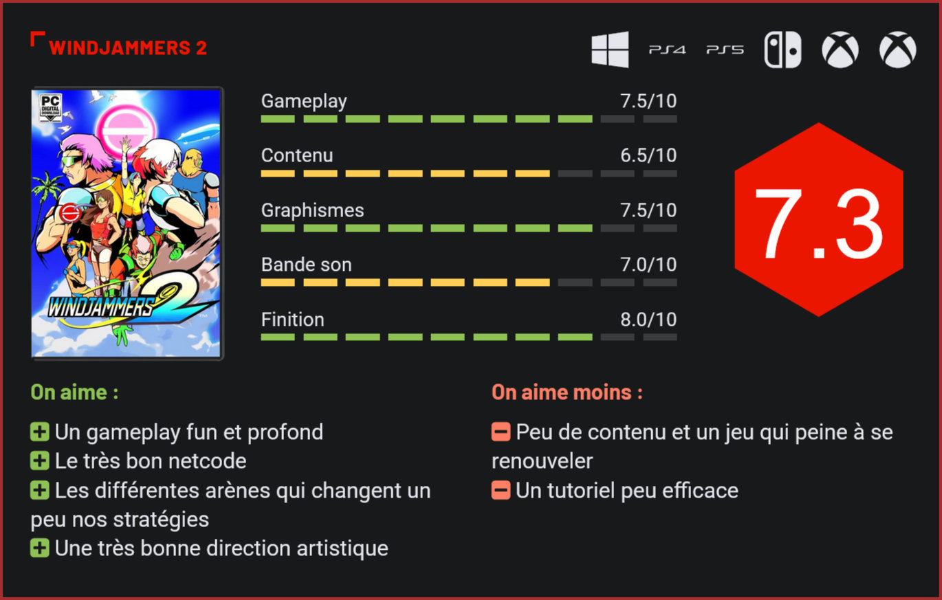 Dotemu a encore frappé! Après avoir remis au goût du jour des séries classiques comme Streets of Rage ou Wonder Boy, l’éditeur français s’attaque maintenant à un jeu d’Arcade qui a gagné une petite notoriété avec le temps. Windjammers 2 est une véritable suite du jeu des années 90. D’abord sorti sur borne d’Arcade en 1994, puis porté sur les consoles Neo-Geo, le premier Windjammers a su rester dans les esprits des fans de jeux de Versus, en particulier ces dernières années grâce à la présence du titre dans des tournois esportifs tel que l’EVO. Plus de 25 ans plus tard, Dotemu ressuscite la licence de SNK en proposant un tout nouvel épisode, une suite sobrement nommée Windjammers 2. Ce nouvel opus compte bien remettre ce classique du jeu d’opposition sur le devant de la scène. Le gameplay reste fidèle au jeu original tout en proposant de nouvelles choses. Le principe de Windjammers 2 est simple, il s’agit d’un jeu sportif de lancer de frisbee. Le but d’un match est d’envoyer le frisbee dans les cages de l’adversaire pour marquer des points, un peu à la manière de Pong. Certains endroits des cages sont plus compliqués à atteindre et rapportent plus de points. Il faut alors contrôler un personnage qui ne doit rien laisser passer et contre attaquer grâce à de nombreux mouvements. Il est possible de mettre de l’effet dans nos tirs, de renvoyer un tir adverse, de faire un lob… Avec un bon timing, il est également possible de projeter le frisbee en l’air et ainsi d’avoir la possibilité de sauter et de faire un smash, ou alors de charger notre prochain lancé en attendant que le frisbee retombe. Autant d’options qui permettent de mettre la pression sur l’adversaire pour trouver une faille dans son jeu. A la manière d’un jeu de combat, le titre propose également une jauge en bas de l’écran qui se charge durant le match. Une fois celle-ci à fond, il est possible de la dépenser pour faire une attaque très puissante ou alors pour faire un mouvement défensif en propulsant le frisbee en l’air, ce qui permet de vous redonner l’avantage. Il est possible de choisir parmi dix personnages jouables ayant chacun leurs propres rapport Puissance/Vitesse ainsi que leurs tirs spéciaux uniques. Enfin, les arènes du jeu apportent également un peu de renouveau puisque certaines possèdent des obstacles, des tailles et des configurations différentes qui permettent d’amener un peu de diversité dans les matchs. Certains lancers peuvent être difficiles à contrer. Les habitués du premier jeu ne seront pas perdus face à ce deuxième épisode tout de même similaire. Certaines techniques sont de véritables nouveautés qui offrent plus de possibilités, mais le gameplay et les sensations restent sensiblement les mêmes qu’il y a 27 ans. Un gameplay très efficace à l’époque et qui l’est toujours aujourd’hui. Les échanges de frisbee sont intenses et mettent nos réflexes à rudes épreuves. Il faut cependant apprendre à jouer par nous-même parce que le jeu ne nous tient pas par la main. Une section “tutoriel” est disponible dans le menu principal mais n’est pas particulièrement très efficace pour apprendre les subtilités du gameplay aux nouveaux venus. Jouer à Windjammers 2 s’apprend par la pratique. Le titre sent bon les années 90 grâce à une esthétique inspirée des jeux SNK de l’époque. Majoritairement dessinés à la main, les visuels très colorés du titre sont du plus bel effet. Les personnages et décors sont vivants et détaillés. Les animations donnent beaucoup de dynamisme à l’action qui arrive à rester parfaitement fluide. Ce style rétro est également retranscrit par l’habillage sonore du jeu. Les musiques ne sont pas particulièrement marquantes mais participent à créer une ambiance sportive et dynamique à l’ensemble. Les personnages ont également quelques répliques doublées dans leurs langues d’origine. Le mode Arcade propose quelques mini-jeux pour se familiariser avec le gameplay. Là où le titre se montre moins généreux, c’est dans le contenu qu’il propose. Windjammers 2 ne possède que très peu de modes de jeu. En dehors d’un mode libre permettant d’affronter une intelligence artificielle ou une autre personne en local, le titre propose un mode Arcade qui est une succession de matchs avec quelques mini-jeux sympathiques. Évidemment, le cœur du jeu se situe dans son mode en ligne permettant de prendre part à des parties classées ou à des matchs rapides. Mais c’est à peu près tout ce que propose Windjammers 2, pas de contenu déblocable, tout est accessible dès le départ. Quelques variations de matchs supplémentaires auraient été les bienvenus pour prolonger le plaisir. Ce plaisir est tout de même bien présent durant les matchs tant le gameplay est efficace. C’est également le cas en ligne, l’expérience y est particulièrement agréable grâce à l’implémentation du Rollback Netcode, un procédé qui permet au jeu d’anticiper les actions des joueurs et de fournir des parties onlines d’une fluidité irréprochable, et ce même face à quelqu’un dont la connexion laisse à désirer. Les matchs sont courts, intenses et grisants, produisant cet effet “une petite dernière” diablement addictif. Cette suite est une véritable lettre d’amour au premier jeu et un beau cadeau aux fans de jeux de versus et d’esport. Conclusion Après avoir remis des séries classiques comme Streets of Rage ou Wonder Boy sur le devant de la scène, Dotemu s’attaque maintenant à Windjammers, un jeu d’arcade de SNK sorti en 1994. L’éditeur français propose une suite à ce titre qui a su faire vibrer les fans de jeux de versus. Si vous ne connaissez pas le concept, il s’agit d’un jeu de sport ou le but est de lancer un frisbee dans les cages de l’adversaire pour gagner des points. Au contrôle de l’un des dix personnages jouables
