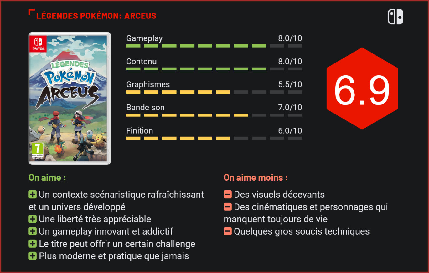 À peine quelques mois après un remake de Pokémon Diamant et Perle développé par une autre équipe, les créateurs de la licence culte proposent à leur tour un nouvel épisode, mais celui-ci prend une tout autre direction. Alors que l’année des 25 ans de la licence arrive bientôt à son terme, The Pokemon Company propose en clap de fin ce Légendes Pokémon: Arceus, un nouveau jeu développé par Game Freak, les développeurs attitrés de la licence Pokémon. Un nouveau titre développé pour la Switch et qui se révèle très différent de ce qu’on a l’habitude de voir dans la série. Celui-ci a pour but d’apporter un peu d’ambition dans la licence et de proposer un jeu solo qui met un coup de pied dans la fourmilière en changeant profondément une formule qui a peu évolué en 20 ans. Reste à savoir si ces changements sont efficaces. Dans Légendes Pokémon: Arceus, nous incarnons un jeune garçon ou une jeune fille de 15 ans qui se retrouve mystérieusement en contact avec Arceus, le dieu créateur de l’univers de Pokémon. Celui-ci nous envoie à une autre époque avec notre smartphone. Notre personnage est alors retrouvé sur une plage par le professeur Lavande qui nous emmène dans le petit village de Rusti-Cité. Le titre se déroule en réalité dans la région de Sinnoh, la région de Pokémon Diamant et Perle, mais des centaines d’années dans le passé, alors qu’elle s’appelait Hisui. Une région alors majoritairement habitée par des Pokémon hostiles et où les êtres humains ne savent pas vraiment se défendre puisqu’il n’existe pas encore de dresseurs. La toute récente invention des Pokéball permet au groupe Galaxie de mettre en place un corps de chercheurs qui consiste à en apprendre plus sur les Pokémons et à créer le tout premier Pokédex de la région, une encyclopédie qui recense toutes les créatures trouvables. C’est la mission qui est confiée à notre personnage, qui semble naturellement doué pour capturer et s’entendre avec les monstres de poche. Le titre nous livre une histoire et un contexte très différent de ce qu’on voit d’habitude dans la série. Si son scénario n’est pas particulièrement complexe, son univers est bien plus mis en valeur grâce à des quêtes annexes mettant en avant la cohabitation entre les humains et les Pokémon. Il est assez plaisant de voir l’évolution de la situation et de voir les deux camps s’entendre de plus en plus au fil du jeu. Il arrive que le scénario nous demande d’affronter des dresseurs. Ce Légendes Pokémon reste un RPG et repose sur les mêmes bases que d’habitude, à savoir un jeu où nous devons capturer et entraîner des créatures aux caractéristiques variables. La quasi-totalité des monstres trouvables dans le titre sont des Pokémon que l’on a déjà rencontré dans les précédents jeux. Quelques exceptions et nouvelles formes de créatures déjà existantes apportent un peu de nouveauté, mais elles sont minoritaires. Contrairement à ce que l’on pourrait croire, Légendes Pokémon: Arceus n’est pas véritablement un monde ouvert mais est bien divisé en plusieurs grandes zones qui se débloquent au fil du scénario. Rusti-Cité propose un nombre d’activités et de boutiques permettant de se préparer à partir en exploration. Une fois sur le terrain, nous sommes libres d’explorer la zone à notre guise, d’attraper et de combattre les nombreux Pokémon que l’on peut y trouver. Le fonctionnement tranche radicalement avec les routes explorables des RPG de la licence. Pas de dresseurs à affronter ici, il faut s’aventurer sur des territoires conquis par des Pokémon sauvages. Légendes Pokémon: Arceus pose véritablement l’exploration au centre de son expérience. Les zones renferment en réalité peu de choses intéressantes, l’attraction principale et ce qui nous pousse à explorer ce sont les Pokémon eux-mêmes. La principale différence est qu’il est possible ici de faire plusieurs actions en tant que dresseur. Il est d’abord courant d’être pris pour cible par les créatures féroces, il faut alors esquiver leurs attaques, sous peine d’être blessé et de peut-être s’évanouir. Mais nous avons à notre disposition tout un tas d’objets pour nous défendre ainsi que nos Pokéball. Lancer une Pokéball vide permet bien sûr de tenter de capturer des créatures, mais elles sont parfois trop agressives et nécessitent soit d’adopter une approche plus discrète, soit d’être calmés en combat. Être discret est la clé pour attraper certains Pokémon. Lancer une Pokéball qui contient l’un de nos Pokémon sur une créature permet de démarrer un combat sans transition. Légendes Pokémon: Arceus revient alors vers ses origines en proposant un système de combat au tour par tour similaire à ce que la série propose depuis 25 ans. Quelques changements sont à noter puisque certains éléments qui apportent de la complexité aux précédents RPG ont été retirés, tel que la possibilité de faire tenir un objet à nos Pokémon. En échange, de nouvelles possibilités en combat sont disponibles tel que les “styles” qui permettent d’influer sur l’ordre des tours. Lancer une attaque avec le style “puissant” va causer de plus gros dommages mais peut retarder l’arrivée du prochain tour, tandis que le style “rapide” permet de lancer une attaque plus faible mais garantit presque d’avoir un tour supplémentaire. Des atouts bienvenus qui brisent un peu la monotonie du tour par tour en apportant quelques outils stratégiques. Le titre propose également un sacré changement du côté de sa difficulté. Sans pour autant être réservé aux joueurs expérimentés, l’aventure ne sera pas non plus de tout repos et il faut se montrer prudent. Si l’on nous tient un peu la main au début de l’aventure, la suite est une tout autre histoire, en particulier parce que certaines créatures sont très agressiv