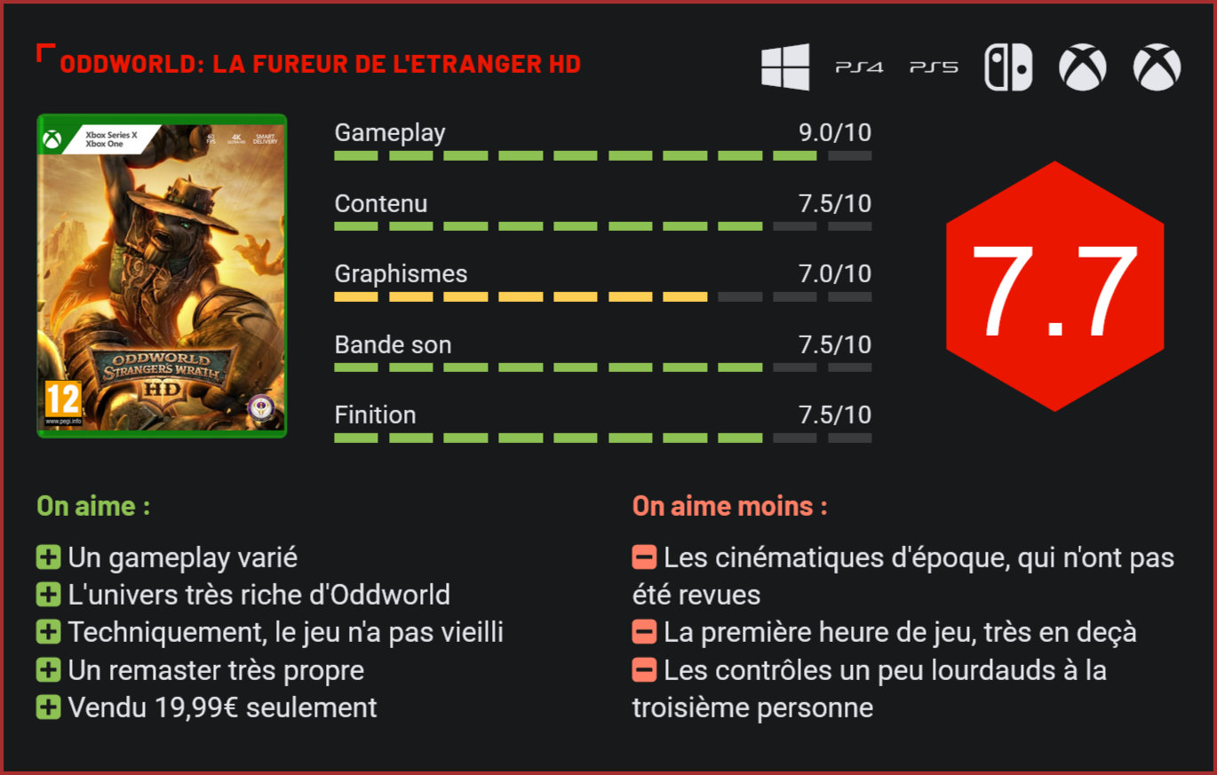 Sorti en 2005 sur Xbox, La Fureur de l’Etranger reste l’un des épisodes les plus méconnus de la série des Oddworld. Pour beaucoup, il est toutefois considéré comme le meilleur de la franchise. Après nous avoir livré des remakes du premier et second volets de la franchise, le studio Oddworld Inhabitants semble s’être enfin décidé à porter sur les consoles de dernière génération l’un des épisodes les plus controversés de la franchise. Sorti en 2005 sur Xbox, La Fureur de l’Etranger s’était tout d’abord attiré les foudres des fans par son approche. Il ne s’agissait en effet pas d’un jeu de plates-formes en 2D ou en 3D comme ses prédécesseurs, mais d’un jeu d’aventure / tir se jouant presqu’entièrement à la première personne. Si le titre avait surpris son audience, il était parvenu à se forger une solide réputation. Il est aujourd’hui considéré comme l’un des meilleurs si pas le meilleur volet de la série par de nombreux joueurs. Contrairement aux autres épisodes de la série, La Fureur de l’Etranger se joue à la première personne. S’il adopte une approche différente des autres épisodes, La Fureur de l’Etranger n’en garde pas moins la richesse de l’univers d’Oddworld. On est ici parachuté dans une zone méconnue de cet monde, dans la peau d’un chasseur de prime qui traque les plus grands brigands de l’ouest pour les capturer et les ramener en ville, morts ou vifs. L’univers s’inspire très ouvertement des meilleurs western. Comme toujours dans la saga, l’humour fait partie intégrante de l’expérience. Côté gameplay, on est ici face à un jeu d’aventure principalement composé de séquences de shoot à la première personne. Pas de mitrailleuse ni de laser toutefois, mais une arbalète qui tire différents types de munitions… vivantes. Chacune a sa particularité. Les araignées permettent par exemple de capturer dans une toile un ennemi vivant. D’autres munitions causent des explosions, mordent les ennemis, les électrocutent, causent une diversion… Et il faudra chasser ces munitions vivantes, en tirant dessus dans la nature. Il est possible de passer à la troisième personne pour les séquences d’exploration. En dehors des séquences de shoot, on passe son temps à explorer l’univers du jeu, à aller acheter des améliorations d’équipements, traquer une proie, récolter des munitions… Les à-côtés sont peu nombreux mais permettent de varier suffisamment les plaisirs pour tenir jusqu’au bout de l’aventure sans s’ennuyer. Avec son univers riche et cohérent, son personnage énigmatique, son gameplay très riche (grâce en grande partie à la diversité de ses munitions), ses graphismes colorés qui n’ont pas trop mal vieillis (et ont bénéficié d’une jolie mise à jour), sa direction artistique splendide et sa durée de vie solide, La Fureur de l’Etranger reste un titre culte que la plupart des joueurs parcourront avec plaisir. Car clairement, il s’agit là de l’un des FPS les plus originaux de ces 20 dernières années. De surcroit, il n’est pas indispensable d’être un fan d’Oddworld pour l’apprécier, compte tenu de son approche unique. Tout au plus pourra-t-on lui reprocher une durée de vie peut-être un peu légère et un manque d’à-côtés. Quelques mini-jeux n’auraient pas été de trop… Malgré les années, le titre n’a pas trop mal vieilli. Notre seul vrai reproche concerne l’absence d’upgrade dans l’affichage des cinématiques du jeu, qui est resté au format de l’époque, avec un résultat pour le moins pixélisé. C’est d’autant plus dommage que pour l’époque, les cut-scenes étaient très jolies. Elles passent aujourd’hui très mal sur un écran 4K. Reste qu’à 19,99€, la proposition reste suffisamment séduisante pour plaire tant aux joueurs qui avaient dégusté le jeu à l’époque que ceux qui étaient passés à côté. Comme nous l’avons déjà dit, La Fureur de l’Etranger n’a étonnamment presque pas vieilli. Certains éléments graphiques pourraient presque paraître comme “modernes”. D’autres sont un peu moins jolis, à l’image des feuillages. La Fureur de l’Etranger n’en reste pas moins un remaster très réussi, qui a de surcroit le mérite d’être disponible sur toutes les plates-formes. Conclusion Sorti initialement sur Xbox, Oddworld : La Fureur de l’Etranger est l’un des épisodes les plus méconnus de la série, mais également l’un des meilleurs. Il se démarque des autres volets par son approche. Le titre lorgne du côté des FPS avec des séquences de shoot à la première personne dans un univers de western spaghetti. Fun à jouer, le jeu parvient à tirer son épingle du jeu par la richesse de son gameplay, avec ses munitions vivantes, son univers très riche, et son personnage mystérieux. Une balade dans l’ouest sauvage qui offre une expérience de jeu véritablement unique, qui plaira tant aux fans de la série qu’aux non-initiés. Ce remaster sur les consoles de dernière génération offre un joli coup de lifting à cet excellent FPS. Seul bémol : l’absence de mise à jour au niveau des cinématiques, qui s’affichent encore en faible résolution. Pour le reste, le jeu n’a pas pris une ride. Oddworld Inhabitants a réalisé un très joli travail de remasterisation. Si vous étiez passé à côté de cette petite pépite à l’époque, on ne peut que vous conseiller de vous y replonger dès aujourd’hui.