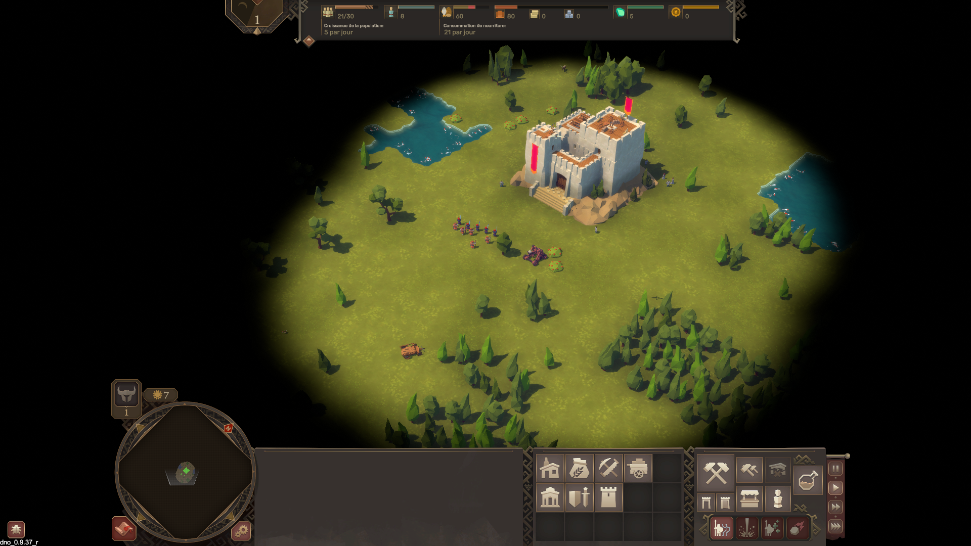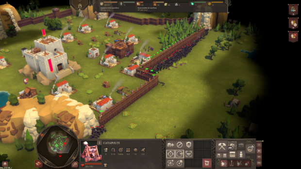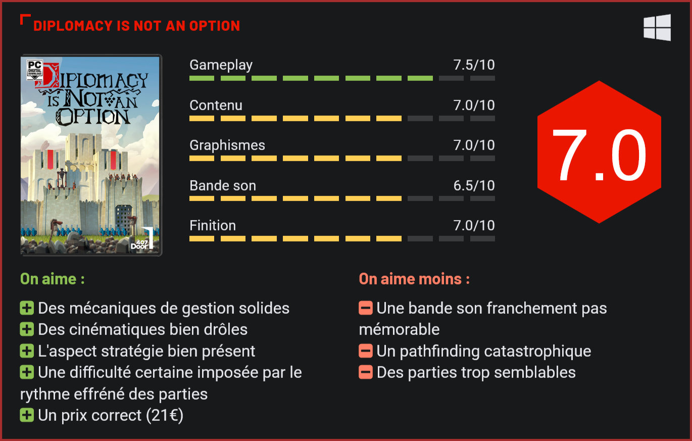 Actuellement en early access, Diplomacy is Not an Option est la première production du studio russe Door 407. Un accès anticipé prometteur pour un titre qui ne demande qu’à être agrémenté en contenu. C’est devenu le mode de lancement à la mode des petites productions indépendantes. À l’approche de la version finale de leur jeu, les plus petits studios de jeux vidéo le mettent déjà en vente pour recueillir les avis des joueurs. C’est alors l’occasion pour le studio de voir ce qu’il peut changer ou améliorer dans son titre avant le lancement officiel intervenant bien souvent plusieurs mois après la sortie en accès anticipé. Le tout jeune studio russe Door 407 a choisi d’adopter cette approche pour sa première production : Diplomacy is Not an Option. DINAO, c’est comme ça que nous l’appellerons, se présente comme un petit jeu de gestion / stratégie made in Unity créé dans le but de permettre aux développeurs d’avoir un premier pied au sein de l’industrie en se faisant connaître. En réalité, il faut savoir que DINAO ne se présente pas comme un traditionnel jeu de stratégie et de gestion. A ces deux aspects vient s’ajouter une composante de tower defense bien ancrée. En effet, vous devez à tout prix protéger votre hôtel de ville contre de multiples vagues d’ennemis toujours plus nombreux. Pour cela, vous devrez placer avec parcimonie vos différentes unités pour éviter que l’ennemi ne vienne à bout de votre QG. C’est à peu près tout ce que vous aurez à faire dans le jeu. Certes, le titre est redondant, ce dont nous parlerons plus tard, mais manie habilement tous les aspects d’un jeu de gestion/stratégie. Toutes les parties débutent de la même manière… Dans DINAO, vous incarnez un roi devant à tout prix défendre son royaume contre la révolte paysanne. Vos serfs en ont marre des miettes de pain que vous leur laissez et il est de votre devoir de les empêcher de mettre à feu et à sang votre paisible territoire. Pour cela, vous userez de la force, quitte à verser du sang au passage. Tout au long de la campagne, vous traverserez tout le royaume dans le but d’empêcher la fin de votre règne. Une campagne qui sert principalement de fil rouge pour enchaîner les missions. En effet, excepté de brefs choix influençant la suite de votre histoire (il faudra par exemple, en début d’aventure, choisir entre votre devoir pour la patrie ou rallier les paysans et devenir un traître), DINAO s’engouffre dans une certaine répétitivité avec un enchaînement de missions toutes semblables entre elles. En effet, la structure des missions reste quasiment toujours la même. Vous débutez avec un Hôtel de Ville au milieu de nulle part et devez construire votre défense et des habitations pour faire face aux vagues d’ennemis. Au fur et à mesure que les jours passent, vous accueillerez de nouveaux habitants, venant travailler dans vos mines pour vous rapporter des ressources, mais également qui peuvent servir de bûcherons, pêcheurs, bâtisseurs ou encore soldats. Il faudra alors trouver un juste équilibre entre la création des bâtiments de ressources, des défenses et des bâtiments d’utilité publique. Autant vous le dire de suite, la tâche s’avère ardue… Il va falloir bien se préparer, car les révoltes paysannes sont ardues. Le temps s’écoule plutôt vite. Vous commencerez la partie et l’on vous dira que la première vague d’ennemis arrivera au troisième jour. Vous avez alors trois jours et deux nuits pour vous préparer à l’envahisseur en construisant vos défenses et en formant votre armée. Problème : tous les recrutements et les constructions consomment énormément de ressources qui prennent du temps à être amassées. Et du temps, vous n’en avez que très peu. C’est là que vous vous rendez compte du défi que présente DINAO. Si vous êtes mal préparé, vous ne passerez même pas la première vague… Lorsque les ennemis vous attaquent, ils ne font pas dans la demi-mesure. Au début par centaines puis plus tard par milliers, les paysans s’acharnent sur vos remparts et soldats et peuvent très vite anéantir toute votre partie. Il faut ainsi bien se préparer en attendant la vague suivante. On expliquait plus haut que le temps s’écoule plutôt vite, mais ce peut très bien être un point positif. Si la tâche est ardue, on est assuré d’assister à des parties au rythme effréné, lors desquelles on ne s’ennuie que très peu. Visuellement, on ne peut pas vraiment dire que DINAO mérite le Game Awards des plus beaux graphismes. Développé sur Unity, le titre affiche des modèles en low poly dans un environnement cartoon très simpliste. Et pourtant, force est de constater que l’univers fait mouche et qu’il nous plaît. D’ailleurs, mention très bien pour les cinématiques, elles aussi très simples, mais tellement drôles avec une mise en scène et des dialogues bien travaillés et à l’humour caustique. Quoique fort simplistes, les cinématiques sont empreintes d’humour et très agréables à visionner. En parlant de l’univers et de la direction artistique de DINAO, évoquons le sound design du titre. C’est peut-être l’un des points les plus décevants tant le tout est très peu harmonieux et agréable à l’oreille. Les mélodies sont toutes semblables entre elles et ne nous ont franchement pas marquées. Pire encore, les bruitages sont très éreintants, avec lorsque l’on multiplie la formation de soldats, des petits cris tous identiques qui s’enchaînent très vite et qui tapent sur le système. S’il est actuellement en phase d’early access, Diplomacy is Not an Option a pourtant l’allure d’un jeu abouti. Le jeu étant peu gourmand, il exempté du moindre ralentissement ou bug. Les développeurs ont bien peaufiné leur titre avant de le proposer au grand public, et l’expérience n’en est que meilleure. S’il fallait donner un point sur
