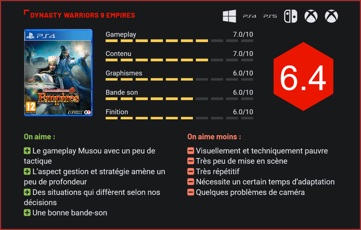 Si l’on connaît la série de jeux Dynasty Warriors pour avoir popularisé le genre du Musou, son spin-off Empires est moins connu. Le jeu mixe toutefois brillamment stratégie et action. On connaît bien le studio Omega Force pour ses nombreux jeux d’action et notamment pour ses jeux de type “Musou”, ces beat-them-all qui nous font incarner des personnages décimant tout une armée avec grande facilité. Dynasty Warriors 9 Empires est le dernier épisode de cette saga de Musou qui offre cependant un profond changement à la formule. Les épisodes “Empires” reprennent en effet le gameplay si caractéristique de la série mais proposent une couche de gestion et de stratégie qui change drastiquement l’expérience. Après un Dynasty Warriors 9 très décevant, son spin-off Empires essaye tant bien que mal de recoller les morceaux. Comme d’habitude dans la série, le scénario est tiré du roman historique Chinois “Les trois royaumes”, se déroulant entre les années 180 et 280 après J.-C. et racontant les batailles de différentes factions qui luttent pour la domination de la Chine. Dynasty Warriors 9 Empires propose divers scénarios qui mettent en scène des conflits entre les régions durant différentes années. Il faut alors choisir un personnage parmi les leaders de ces factions et commencer notre conquête à coup de décisions politiques. Notez qu’il est également possible de choisir d’incarner un officier, ce qui donne beaucoup moins de contrôle sur la gestion de nos régions, mais aussi de créer son propre personnage et ainsi de commencer en tant qu’armée indépendante. Un large choix d’action est disponible durant les phases de gestion. Si certaines cinématiques changent selon le scénario et selon nos choix, la majorité de ces histoires se déroulent de la même manière. À la tête de notre région, il faut prendre des décisions qui vont affecter nos possibilités par la suite. Les phases de gestion se déroulent par période de six mois au terme desquels notre armée lance une offensive contre une région choisie. Durant ces quelques mois, il faut prendre des décisions permettant de s’avantager de différentes manières, en récoltant de l’argent, des ressources et en recrutant des soldats pour notre armée. Il est tout à fait possible de jouer comme un tyran en pillant nos propres villages et en trahissant nos alliés, ou de jouer plus pacifiquement en créant des alliances et en développant le commerce dans notre région. Il faut également veiller à se préparer, à s’équiper d’armes, d’accessoires et de plans puisqu’il faut régulièrement se battre sur le terrain. Si Dynasty Warriors 9 empruntait la voie du monde ouvert, les combats de cet épisode Empires reviennent à des champs de bataille plus familiers pour la série. Les combats se déroulent donc classiquement, dans des zones où il faut prendre le contrôle de camps ennemis et défendre les nôtres. Le gameplay est presque identique à ceux de Dynasty Warriors 9, les combats sont dynamiques, toujours très brouillons avec une caméra capricieuse, mais aussi très jouissifs. Le titre propose un très grand nombre de personnages jouables aux capacités différentes permettant de faire des combos dévastateurs. Il faut parfois atteindre des objectifs à temps pour contrer les plans de l’armée ennemie et déclencher nos propres stratégies. Il est également possible de donner des ordres à nos officiers en plein combat, un outil qui est plutôt important pour s’adapter à la situation et avoir un meilleur contrôle des actions de notre armée. On retrouve le gameplay plus classique de Dynasty Warriors durant les batailles. Cette version Empires reprend décidément beaucoup d’éléments du neuvième épisode puisque sortir se promener durant les périodes de gestion de notre royaume permet d’accéder à son monde ouvert. Un monde relativement vide mais dans lequel on trouve parfois des petits groupes d’ennemis permettant de grappiller un peu d’argent et de ressources pour nos prochaines décisions politiques. Avec ces nombreux systèmes d’affinité et de réputation, l’aspect gestion du titre est assez poussé et permet d’amener des variations à nos différentes parties. Selon notre manière de gérer notre royaume, l’aventure se déroule différemment. Il est dommage de voir que la présentation ne suit pas puisque l’entièreté de ces actions sont très descriptives, agrémentées parfois de courtes cinématiques peu intéressantes. Le titre n’est cependant pas un bon pédagogue. Si les habitués des spin-offs Empires ne s’y perdront pas, les nouveaux joueurs peuvent être débordés par toutes ces informations. Les tutoriels pas particulièrement bien pensés n’aident pas non plus à y voir très clair dans un premier temps, il faut un moment pour s’adapter à tout ce que le jeu nous propose. Il est aussi dommage de voir que les différents scénarios n’offrent pas plus de choses uniques. Le contenu pourtant très fourni du jeu en prend un sacré coup puisqu’il n’y a que très peu de raisons de refaire de nouvelles parties encore et encore. Une petite dizaine d’heures sont tout de même nécessaires pour finir un scénario, mais il n’est pas particulièrement intéressant de recommencer pour essayer la centaine de personnages contrôlables. Il est possible de se déplacer dans un monde ouvert bien vide. Le titre ne brille pas non plus visuellement et techniquement. Les versions consoles ont parfois un peu de mal à proposer un rendu très fluide pour le jeu, et ce même avec le mode “fluidité” activé dans les options. En plus d’être visuellement daté, Dynasty Warriors 9 Empires possède des problèmes de clipping sur des cartes pourtant pas bien grandes. La mise en scène laisse également à désirer, les cinématiques importantes des scénarios sont convaincantes mais les autres scènes plus communes montre