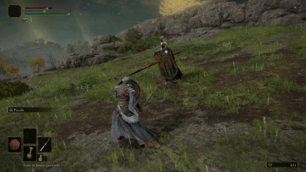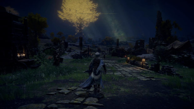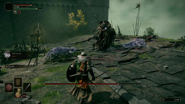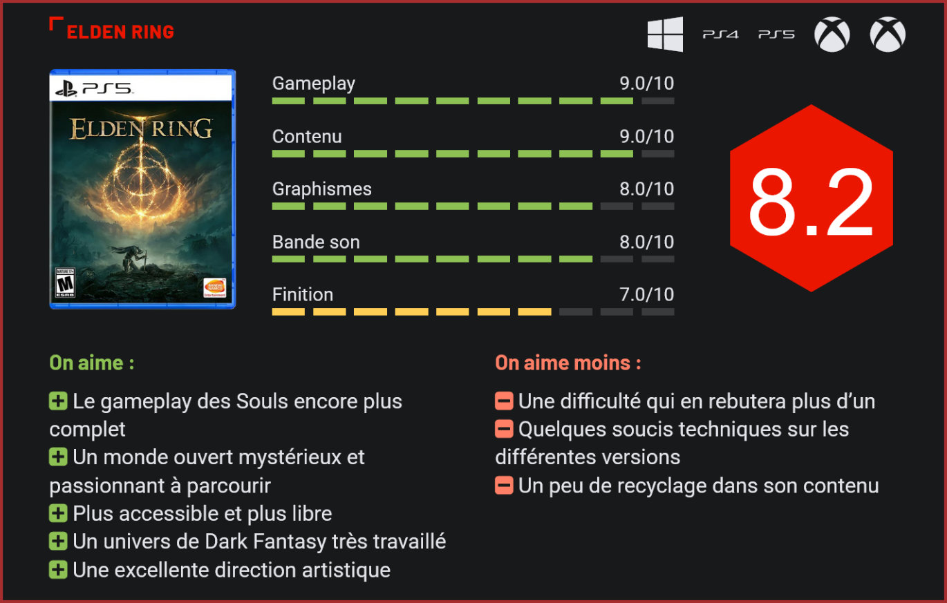 Après plusieurs années d’attente, From Software nous livre enfin son nouveau titre. Elden Ring est sans doute le jeu du studio le plus ambitieux, un véritable successeur à la série Dark Souls sur de nombreux aspects. On connaît surtout From Software pour avoir bouleversé la dernière décennie avec des titres plus exigeants les uns que les autres. Dark Souls, Bloodborne ou encore Sekiro, les derniers titres du studio ont su convaincre les joueuses et les joueurs les plus aguerris. Alors attendu de pied ferme, Elden Ring est le digne successeur de tous ces titres, et en particulier de la série Dark Souls à qui il emprunte beaucoup. Promis comme un jeu plus ambitieux, il est également le fruit d’une collaboration entre le studio et un auteur connu à l’international. Ce n’est autre que George R.R. Martin (Le Trône de fer/Game of Thrones) qui prête ses idées pour la conception de l’univers de Elden Ring, celles-ci ont ensuite été adaptées en jeu par le studio japonais. Un titre plein de promesses qui arrive à renouveler une formule qui divise. Elden Ring est un Action-RPG en monde ouvert. Dès le départ, le titre nous laisse libre d’explorer son univers à notre guise. Un monde particulièrement grand mais également très dangereux puisqu’il est peuplé de créatures plus féroces les unes que les autres. Tout comme les précédents jeux du studio, le titre va proposer un véritable challenge qu’il va falloir surmonter. La mort arrive très vite et très souvent, cela a pour effet de laisser une partie de nos ressources à l’endroit de notre décès, qu’il est souvent préférable d’aller récupérer par la suite. Nous pouvons cependant souffler en nous reposant auprès de sites de grâce, qui nous indiquent également le chemin à suivre pour continuer la quête principale. Le monde ouvert apporte beaucoup à la formule habituelle de From Software. Nous incarnons un sans-éclat, un personnage insignifiant, qui évolue dans un royaume nommé l’Entre-terre. Il s’agit d’un monde où la frontière entre la vie et la mort a été altérée. Celui-ci est gouverné par des demi-dieux qui possèdent tous un éclat du cercle d’Elden, une impressionnante source de pouvoir. Le but de notre personnage est alors de leur prendre ces fragments et de restaurer ce cercle d’Elden comme il était autrefois, et ainsi de pouvoir changer le monde. Notre sans-éclat fait très vite la rencontre de Melina, une jeune femme qui va nous aider à atteindre notre but en nous donnant la possibilité de monter de niveau et en nous confiant Torrent, un destrier spectral, une monture bien pratique pour explorer ces terres. Si le scénario reste simple c’est parce qu’il ne prend pas une grosse place dans l’expérience. Il est cependant possible de rencontrer de nombreux personnages qui nous donnent des indications et objectifs annexes qui ne sont répertoriés nulle part, il faudra compter sur notre mémoire pour voir le bout de ces quêtes optionnelles. Il ne faut pas s’attendre ici à un univers raconté de manière conventionnelle. Tout comme dans les autres jeux du studio, Elden Ring reste cryptique sur de nombreux aspects et permet de passer à côté de nombreuses clés de compréhension si on ne désire pas y prêter attention. Mais les amateurs d’univers de Dark Fantasy seront ravis de découvrir un monde tout à fait fascinant qui regorge de détails. Le gameplay reste très proche de ce que proposait Dark Souls 3. Le gameplay est plutôt similaire à ce que proposaient les différents épisodes de Dark Souls. On y retrouve les mêmes mécaniques de combat, avec des attaques fortes et faibles, des roulades et parades à réaliser au bon moment, l’utilisation de magie si nos statistiques le permettent… Le titre nous permet de choisir une classe en début de jeu mais celle-ci n’est pas figée, elle détermine nos statistiques de départ et notre équipement, mais nous gardons la mainmise sur l’évolution de notre personnage, il est alors possible de changer de style de jeu en cours de partie. Elden Ring propose cependant de nouvelles options offensives qui, en échange de prises de risques, peuvent s’avérer très bénéfiques. Chaque arme possède sa propre compétence spéciale et il est également possible de réaliser un contre après avoir bloqué une attaque. Ce gameplay est plutôt simple, efficace et surtout exigeant. La physique un peu lourde du titre demande un certain temps d’adaptation et il faut user des nos réflexes pour vaincre, en particulier face aux boss qui composent une bonne partie du challenge du jeu. Ceux-ci requièrent réellement d’apprendre leur comportement jusqu’à pouvoir imposer notre propre rythme au combat. La véritable nouveauté c’est bel et bien le monde ouvert qui permet d’appréhender de différentes manières les situations délicates proposées par le titre. Cet Open World ne possède aucun point d’intérêt et seuls les sites de grâce nous guident vers un objectif. Notre seul repère est notre carte que l’on peut nous-même compléter avec différents marqueurs, carte dont on doit également trouver les fragments. Dans le monde d’Elden Ring, il est possible de trouver tout un tas d’ennemis, parfois gardant des camps qui renferment souvent des coffres ou objets. On y trouve également des grottes ou donjons, des structures souvent très petites mais parfois très vastes et bien construites qui gardent elles aussi de quoi améliorer notre personnage. Parmi ces améliorations se trouvent des talismans qui donnent des avantages passifs ainsi que des objets qui permettent d’invoquer des esprits pour nous aider à combattre. Le monde renferme beaucoup de surprises, ainsi qu’un cycle jour/nuit qui change certains éléments. Il est également possible de trouver de nombreux pièges qui nous mettent dans des situations délicates sans pour autant être trop frustrantes. Il est possible d’
