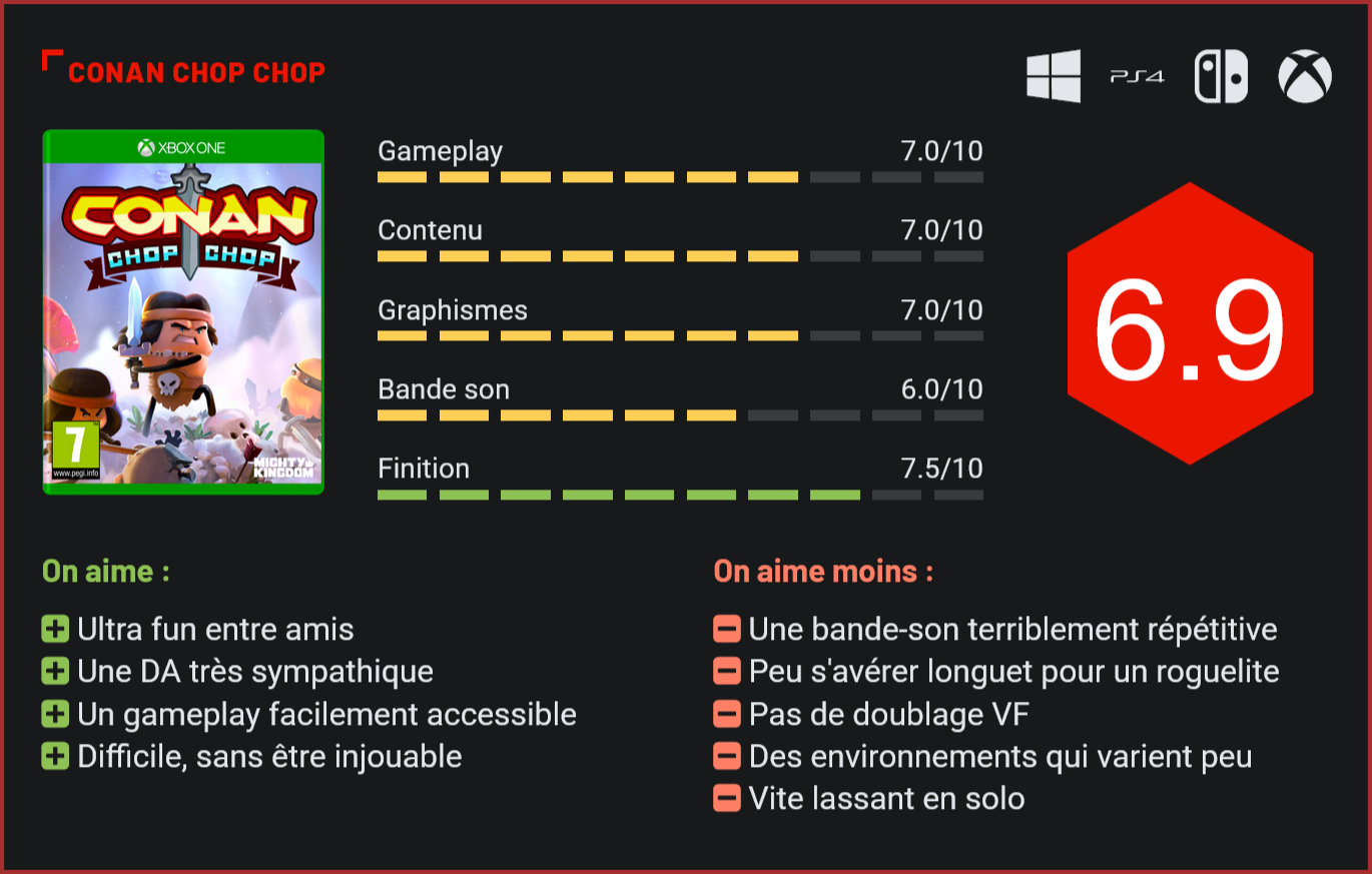 Annoncé en 2019, Conan Chop Chop se sera fait attendre. Le résultat n’est toutefois pas vraiment à la hauteur de notre attente. Conan Chop Chop, c’est la blague du 1er avril qui est allée bien trop loin. Le 1er avril 2019, Funcom présente ce jeu ultra décalé dans l’univers de Conan le Barbare, avec des personnages cartoons et des environnements très colorés et enfantins. À première vue, personne ne considère ce “jeu” et l’on s’attend à ce que Funcom oublie ce poisson d’avril fort sympathique. Mais finalement, ce qui ne devait être qu’une farce d’un jour deviendra très vite un vrai projet, avec des équipes qui travaillent dessus. En juin, l’éditeur annonce que le jeu est une réalité et que les Australiens de Mighty Kingdom travaillent à sa réalisation. Après énormément de reports, le mélange de hack & slash et de roguelite en coop est enfin une réalité. Pour planter le contexte, Conan Chop Chop nous met donc dans la peau de Conan et de ses 3 acolytes : Valeria et son épée, Belit la lancière et Pallantidès, un soldat lourd équipé d’un marteau. Ensemble ou seuls (le jeu est intégralement jouable à 4 joueurs, on y reviendra), ils devront traverser 4 donjons dans lesquels se trouvent énormément d’ennemis voulant leur peau, afin de débloquer la grande porte dans laquelle se trouve le grand méchant. Un scénario plutôt bateau, mais ce n’est pas ce qui ressort le plus du titre. Comme un RPG, Conan Chop Chop vous permet de personnaliser votre personnage pour améliorer sa vie, sa défense ou son attaque. Conan Chop Chop se présente donc comme un mélange de hack & slash et de roguelite en coop. Nous enchaînons les niveaux seul ou à plusieurs et affrontons des hordes d’ennemis qui nous font face. La tâche est plutôt ardue, d’autant que lorsque vous mourez, vous perdez votre progression et les armes durement acquises. Il s’agit ici d’un roguelite, et non roguelike, puisque l’expérience et les compétences débloquées pour vos personnages ainsi que les gemmes récoltées restent en votre possession quand vous trépassez. En réalité, on se rend compte que Conan Chop Chop est davantage un RPG qu’un roguelite. Le personnage choisi va, par exemple, considérablement modifier la façon dont se déroulera votre partie. Pallantidès est plutôt lourd et inflige de gros dégâts, Belit attaque très rapidement mais blesse moins, tandis que Conan et Valeria sont des combattants plus classiques, avec leur épée et bouclier. Contrairement à un roguelite où certains ajouts et détails annexes viennent diversifier le gameplay, Conan Chop Chop se contente de proposer un simple enchaînement de niveaux, avec de temps en temps un marchand venant vous proposer de nouvelles armes et atouts pour vous battre. Conan Chop Chop propose un gameplay exigeant mais ultra facile à prendre en main. Mais ce qui intrigue davantage avec Conan Chop Chop, ce sont les choix faits par les développeurs dans la construction de leur titre. Si le principe-même du roguelite est le die & retry, c’est-à-dire mourir et recommencer depuis le début jusqu’à achever le jeu, Conan Chop Chop est encore plus long que la moyenne. Comptez par exemple plus d’une heure pour atteindre le premier boss. Juste avant cela, vous traverserez pléthore d’environnements et affronterez les ennemis, ce qui peut vite s’avérer lassant. C’est pourquoi il est plus que recommandé de jouer entre amis, la lassitude s’installant moins vite. Dans la structure du jeu, Conan Chop Chop est également très étrange. Le rythme est plutôt lent, ce que les équipes de Mighty Kingdom semblent avoir ressenti. Ils semblent avoir très vite compris que les joueurs allaient vite se lasser en jouant à leur production. C’est probablement pour cela que, sur la mini-map, les issues débouchant sur la suite de l’aventure sont représentées par un bouton blanc, tandis que les issues donnant sur une impasse sont en jaune. Comme on se lasse très vite de mourir sans arrêt et de rester des heures durant sans voir un boss, on aura tôt fait de ne suivre que les points blancs de la mini-map. La direction artistique de Conan Chop Chop est très réussie : les environnements sont très colorés et les personnages et ennemis bien fichus. Conan Chop Chop n’en reste pas moins un titre très fun à deux joueurs ou plus (moins en solo), notamment grâce à ses phases de combat. La prise en main est simple mais efficace. Le joystick gauche sert à se déplacer tandis que le droit permet de frapper dans toutes les directions ou de décocher les flèches de votre arc. La touche Y/triangle sert à déclencher une attaque spéciale rendant les combats encore plus vifs et nerveux. On regrettera toutefois que la jauge de munition des flèches et des bombes soit commune. Si elle se recharge (heureusement !) au fil du temps, il faut constamment faire attention à ne pas utiliser une bombe là où les flèches sont impératives, et inversement. Si, vous l’aurez probablement compris en lisant ce test, le jeu est plutôt ardu et vite lassant en solo, c’est une tout autre expérience en multijoueur. Directement, le jeu se prend facilement en main et l’on se surprend à finalement apprécier ce long enchaînement de donjons. Conan Chop Chop brille également pour son excellente direction artistique. Quoique peu variés, les niveaux sont ultra colorés et très jolis, tandis que les quatre personnages s’inspirent très librement de l’univers de Conan en les adaptant légèrement en stickman. Les cinématiques, malgré le fait qu’elles tirent parfois en longueur, regorgent de moments diablement drôles et amusants. Il est cependant dommage que la bande sonore ne soit pas vraiment inspirée et qu’elle soit au final très répétitive et lassante. Ajoutez à cela le doublage VF absent (heureusement, la VO est réussie), et vous obtenez une bande sonore franchement oubliable. Conclusi