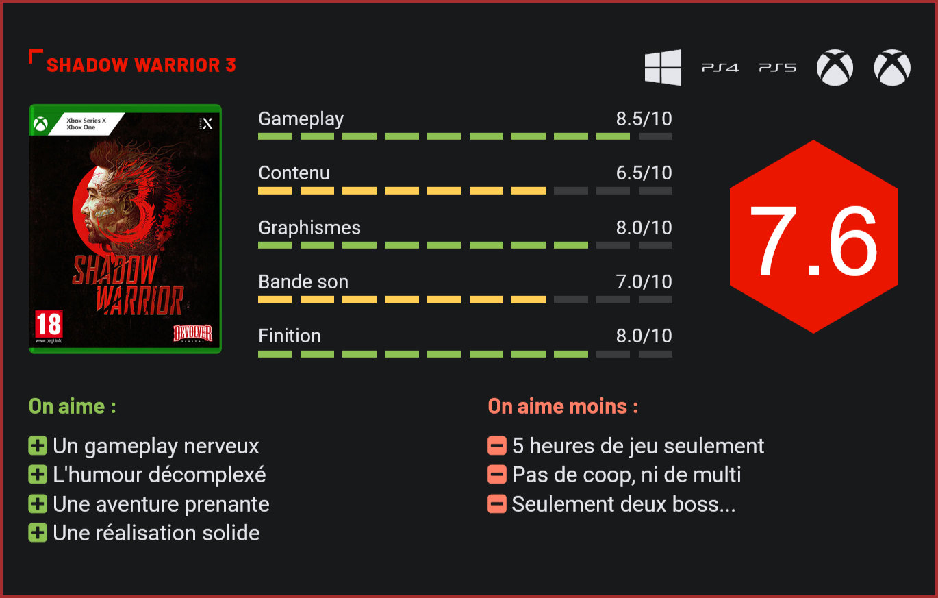 Cinq ans après Shadow Warrior 2, le studio Flying Wild Dog nous livre enfin la conclusion épique de sa série de FPS. Le studio polonais Flying Wild Dog nous livre avec Shadow Warrior 3 la conclusion très attendue de sa trilogie. Tout n’aura toutefois pas été toujours très rose pour le studio, qui n’a pas hésité à changer à plusieurs reprises de cap avec chaque nouveau volet. Le second épisode de la série s’était ainsi présenté comme un shooter coop dans lequel le loot était devenu une composante centrale du jeu. Shadow Warrior 3 revient à une formule plus classique avec un titre 100% solo qui s’inspire beaucoup plus d’un Doom que d’un Borderlands… Le katana reste l’arme de référence. L’aventure reprend là où on l’avait laissée. Après avoir libéré par erreur un dragon qui détruit la planète en absorbant toute son énergie, Lo Wang devra tenter de trouver une solution pour rétablir le calme sur la planète. Si le scénario du jeu tient sur un timbre poste, un gros travail a été réalisé pour rendre le titre plus immersif que son ancêtre. La narration est ainsi soignée, avec de très jolies cinématiques, de longs dialogues et surtout de longs monologues du personnage tout au cours des séquences de gameplay, qui apportent un peu de vie à cet univers décalé. La patte Shadow Warrior, c’est bien sûr l’humour complètement décomplexé, qui, allié à une mise en scène soignée, donnent au jeu une identité véritablement unique. La mise en scène est soignée. Côté gameplay, Flying Wild Dog fait également marche arrière en revenant à une formule plus classique. Exit la coop, Shadow Warrior 3 est 100% axé solo, avec des niveaux très linéaires qui consistent en des successions d’arènes, de séquences de plates-formes et de couloirs. Le level-design est parfois un peu paresseux, mais force est de constater que la formule fonctionne très bien. Les séquences de plates-formes sont funs, avec du wallrun et l’utilisation d’un grapin, et les combats en arènes d’une rare intensité. La force du jeu, c’est de parvenir à mixer brillamment humour, gore et fun. Côté arsenal, on retrouve une demi-douzaine de pétoires seulement, auxquelles viennent s’ajouter des armes spéciales, récupérées lors des éliminations des différents ennemis rencontrés. Concrètement, vous aurez l’occasion d’utiliser un super après un certain nombre d’éliminations, pour décapiter un ennemi et ensuite utiliser une partie de son corps comme arme. C’est sanglant, et ça rappelle surtout furieusement Doom Eternal. Les combats dans les arènes vous imposeront d’ailleurs à vous déplacer continuellement en tirant parti de votre environnement pour venir à bout des ennemis. Les armes spéciales sont complètement délirantes. En plein combat, le joueur pourra décider de sortir soudainement son sabre pour décapiter un ennemi qui s’est un peu trop rapproché, utiliser son grapin pour se rapprocher rapidement d’un autre opposant et enchainer ainsi les kills, virevolter dans les airs en s’attachant à différents éléments du décor ou encore activer différents pièges ou pousser un ennemi pour qu’il aille s’empaler sur des lances. Shadow Warrior 3 a véritablement été conçu comme un grand défouloir. L’aventure solo est en ce sens très plaisante. Le jeu alterne les séquences de jeu jusqu’à un grand final et on ne s’embête pas une seule seconde. La rejouabilité reste toutefois très maigre et surtout, le jeu est court, très court. Comptez 5 heures seulement pour en voir le bout. Les moments forts sont également peu nombreux puisqu’on dénombre par exemple seulement deux combats de boss… A 49,99€, la pilule a donc un peu de mal à passer. Shadow Warrior 3 aurait clairement dû être proposé à un tarif inférieur. Les éliminations sont parfois très gores. S’il est relativement court, Shadow Warrior 3 n’en reste pas moins un titre très plaisant à parcourir, au rythme parfaitement maîtrisé, et qui a surtout le mérite d’être très joliment fini. Techniquement, le jeu est très réussi, avec des décors soignés, de jolis effets visuels et une direction artistique à couper le souffle. La bande son n’est pas en reste avec d’excellents bruitages, des musiques intenses et des doublages de qualité en anglais. Peu voire pas de bugs non plus à l’horizon. En pleine pandémie, il faut avouer que le résultat se montre très concluant. On le sent toutefois, les développeurs n’ont sans doute pas eu le temps d’aller jusqu’au bout de leurs idées. Avec sa durée de vie rikiki et l’absence complète de multijoueur, Shadow Warrior 3 est typiquement le genre de jeu popcorn qu’on terminera d’une traite en une ou deux soirées. Si vous en avez l’occasion, favorisez donc les offres d’abonnement pour y jouer. Le titre est d’ailleurs intégré en Day 1 dans le PS Now. Conclusion Avec Shadow Warrior 3, Flying Wild Dog nous livre un FPS extrêmement nerveux, brutal et gore. Le studio polonais fait machine arrière par rapport au précédent volet, en abandonnant la coop et le loot pour nous livrer un fast-FPS qui marche plus sur les traces d’un Doom Eternal que d’un Borderlands. Frais, drôle avec son humour complètement décalé, très fun, le titre est un excellent défouloir. Le plaisir n’est toutefois que de courte durée puisqu’en 5 heures de jeu, vous en verrez le bout. Et il y a peu de chances que vous y retourniez ensuite… Typiquement, Shadow Warrior 3 est le jeu pop-corn qui vous occupera le temps d’une ou deux soirées. En ce sens, il est dommage qu’il soit vendu presqu’au prix plein. Ceci étant dit, le divertissement est parfaitement maîtrisé, la formule fonctionne à merveille et techniquement, le titre fait partie des plus beaux jeux de sa génération. En dépit de a très courte durée de vie, vous n’avez donc aucune bonne raison de passer à cô